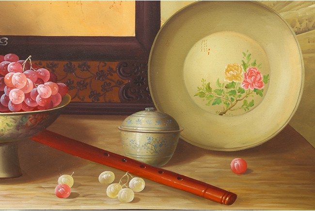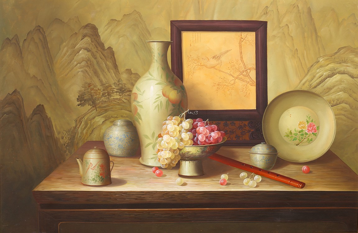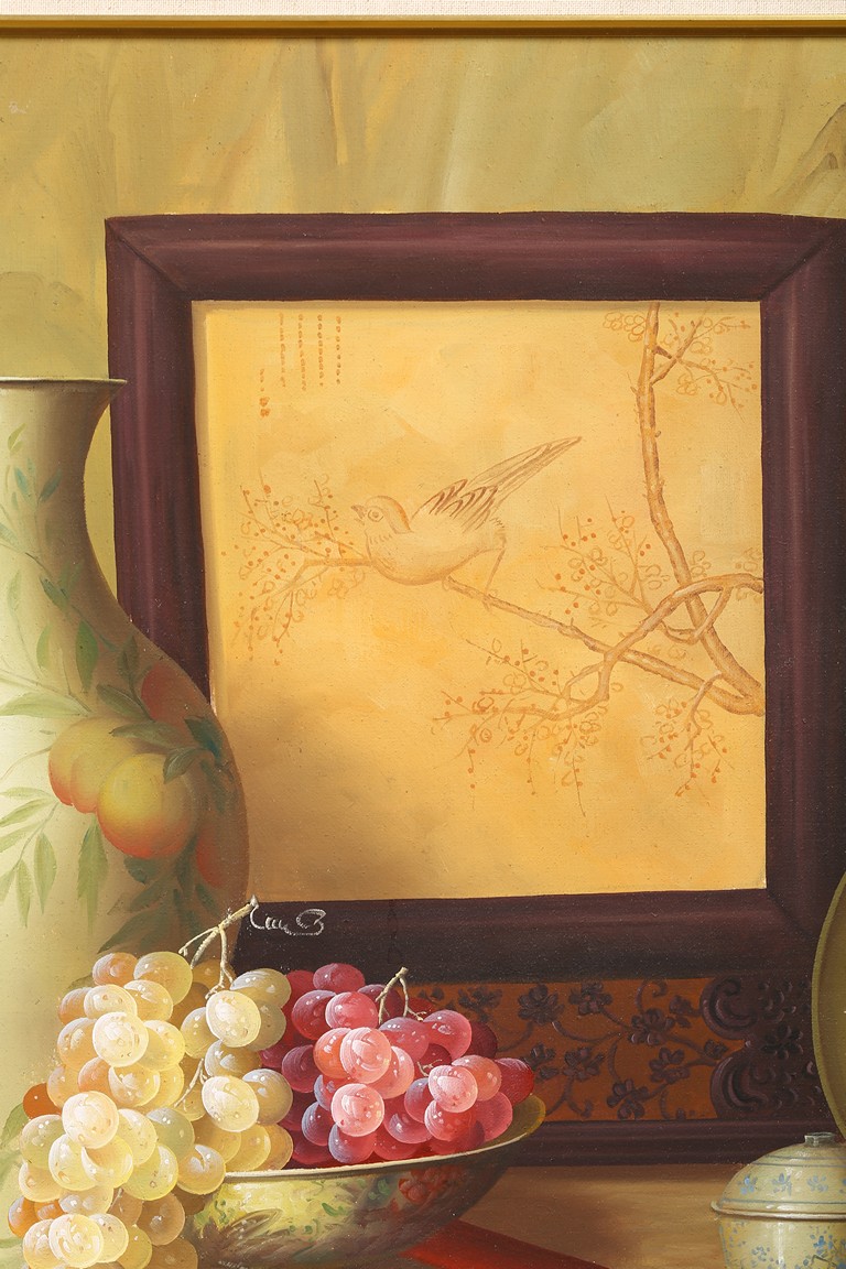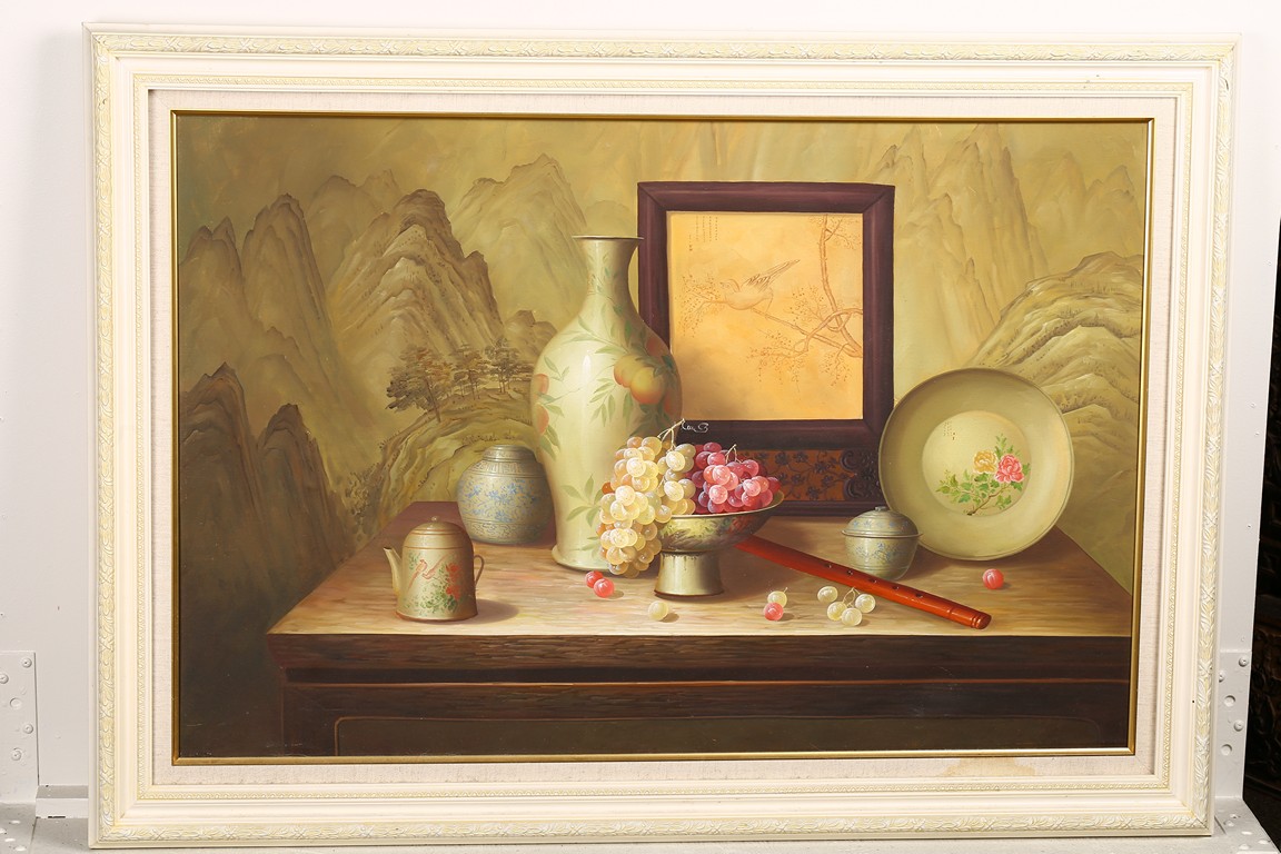 Chinese. Still life with Chinese Porcelains. Oil on canvas. Framed.