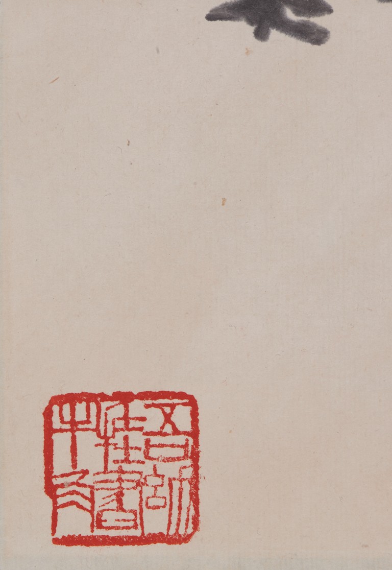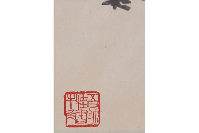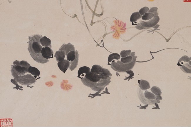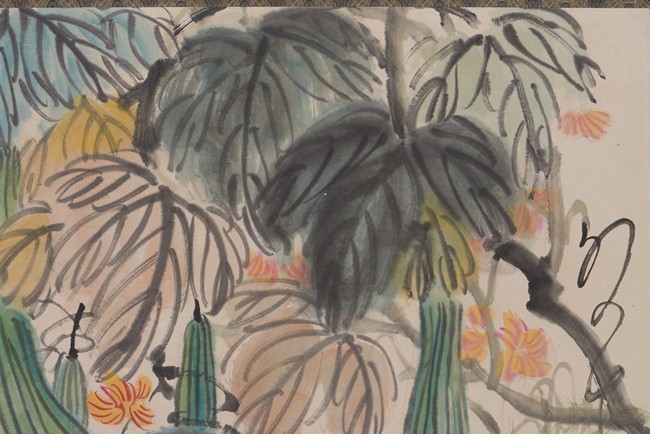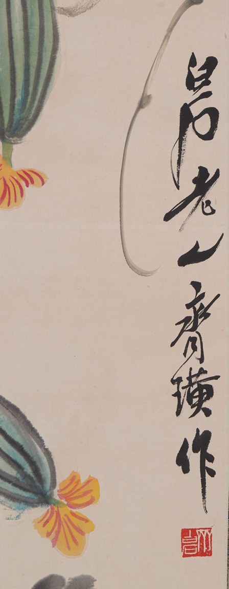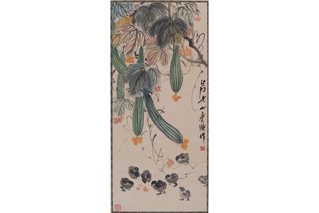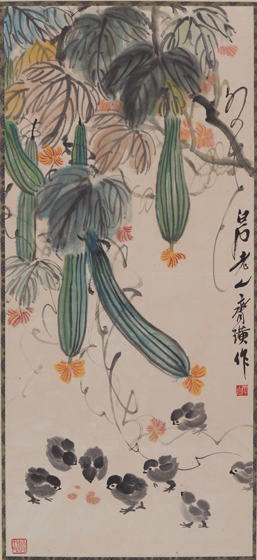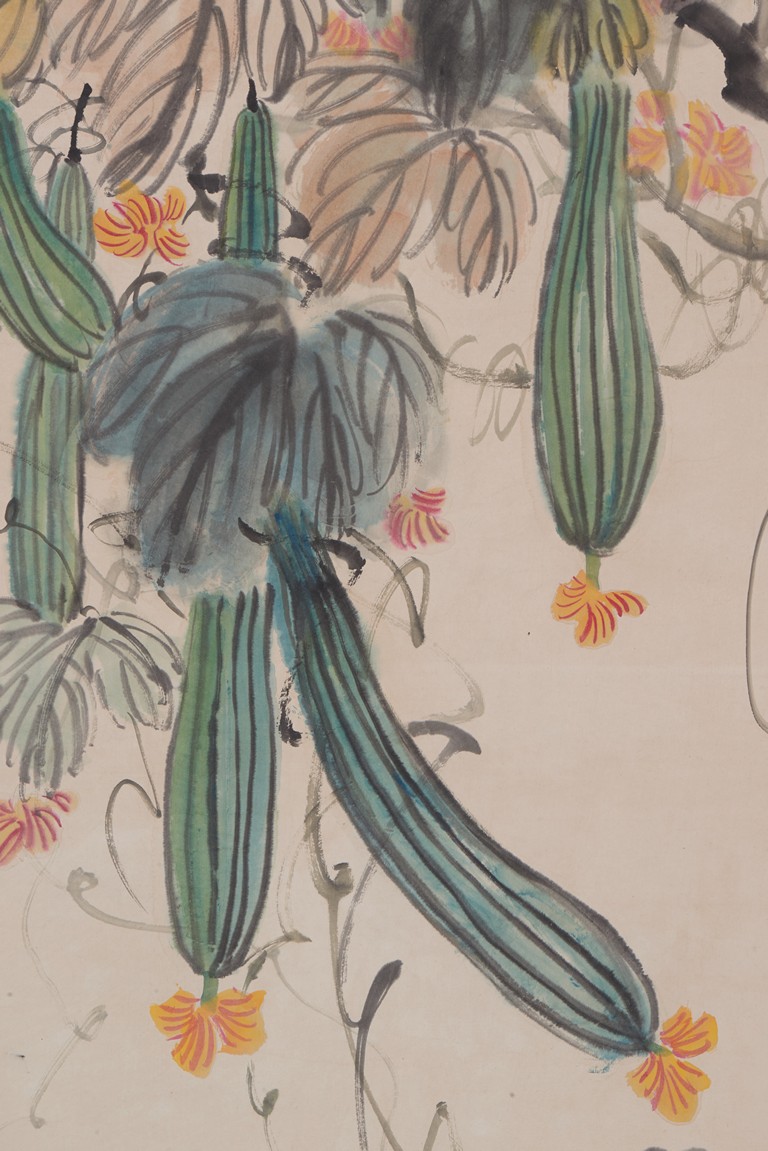 Color an ink on paper. Luffa and chicken. Hanging scroll. Inscribed and signed ,with two seals of the artist.