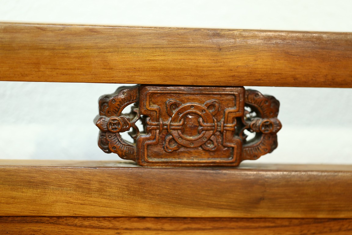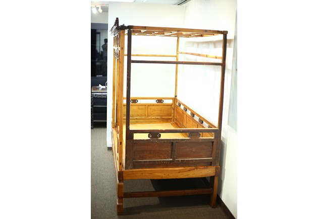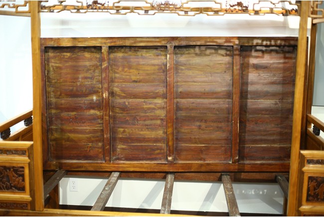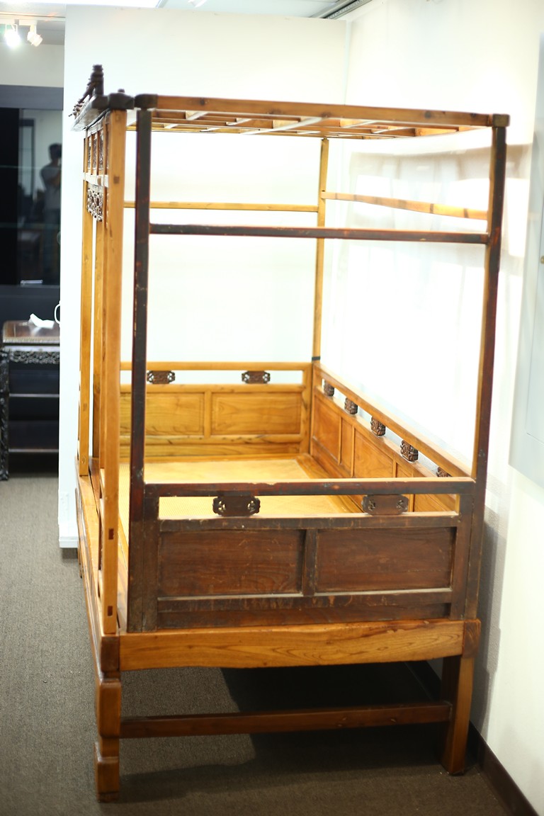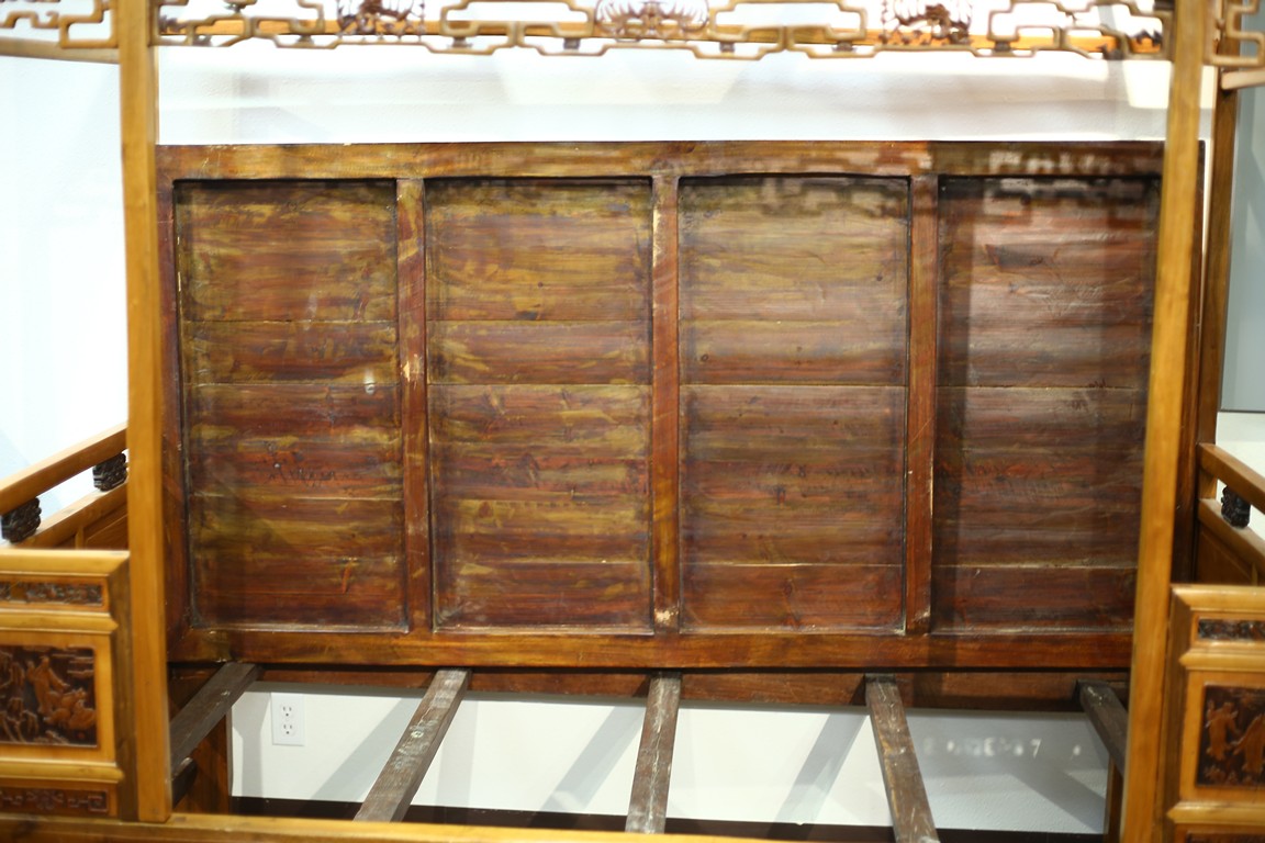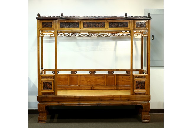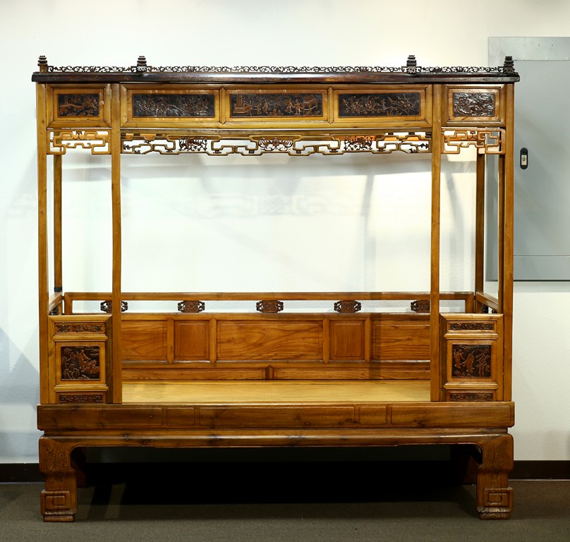 全床尺寸巨大,通體用黃楊木製作而成,皮殼油亮自然。床面四角立柱,上安頂架。又鑲嵌雕工畫板,雕工絕妙。整體製作精細,結構完整統一,榫卯嚴密,造型考究,呈現清代家具空靈美感,一器所有,滿室生輝。可謂為架子床上乘精品。 張先生舊藏