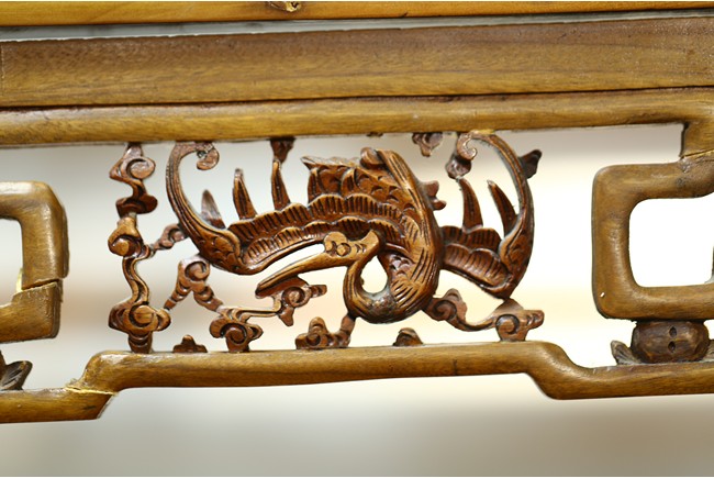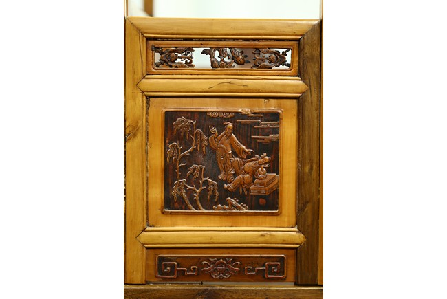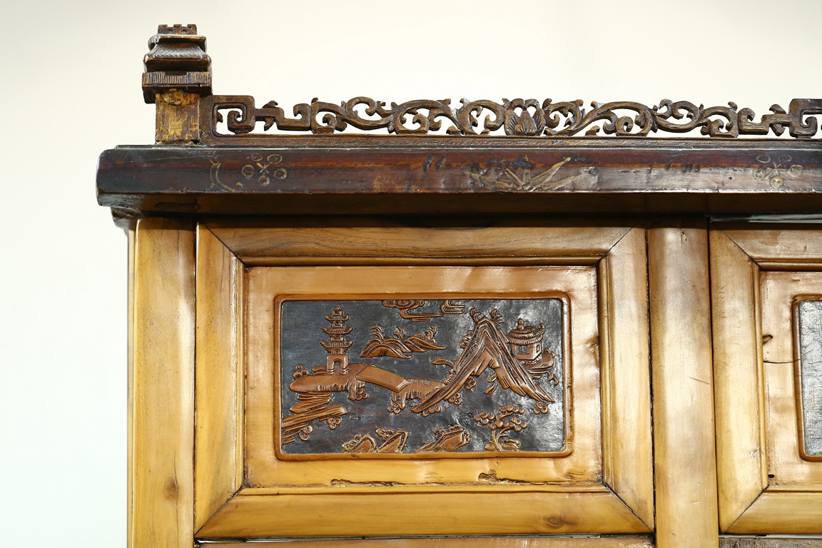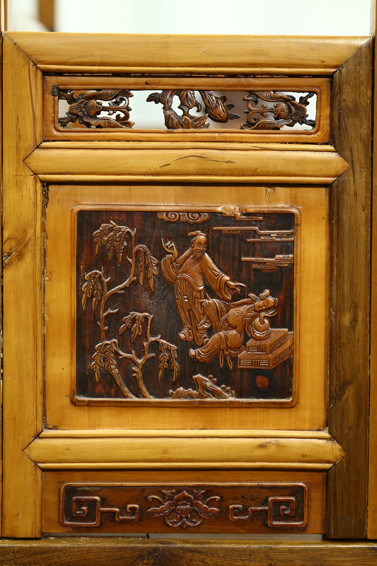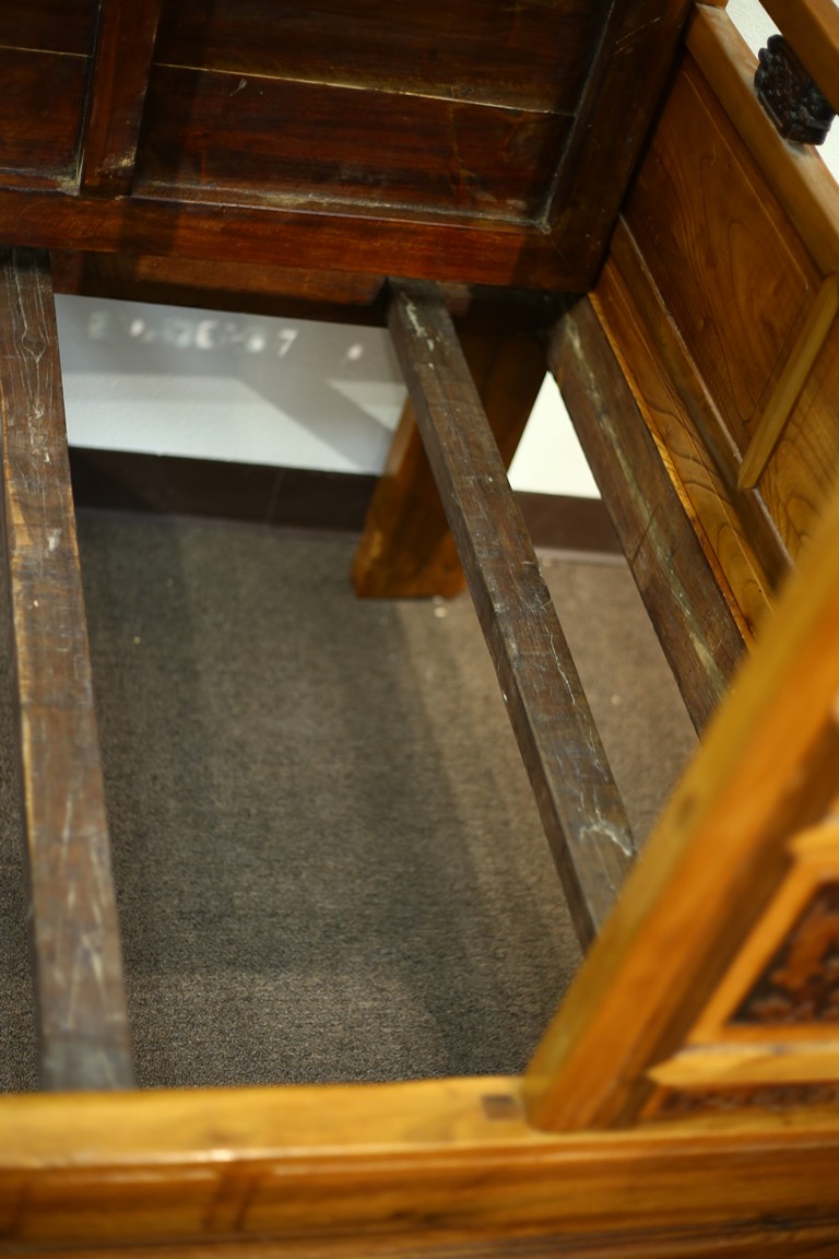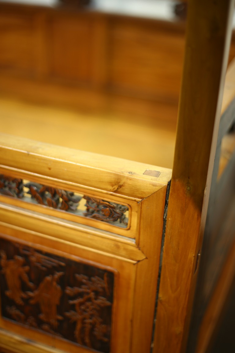 Supported on four thick scrolled feet carved with chilong in relief, the front railing carved in relief with story scene of figures in landscape setting, the canopy supported on six posts with four at the corners and two set in at the front, all below a canopy with three five solid front panels carved with flower and landscape scenes. Qing Dynasty period.