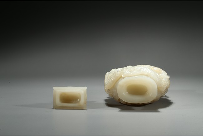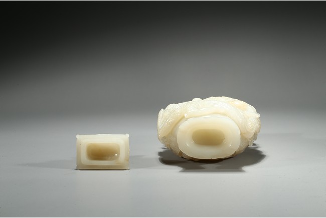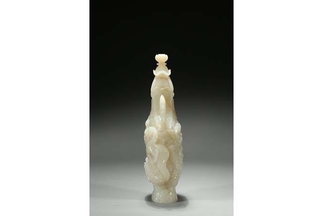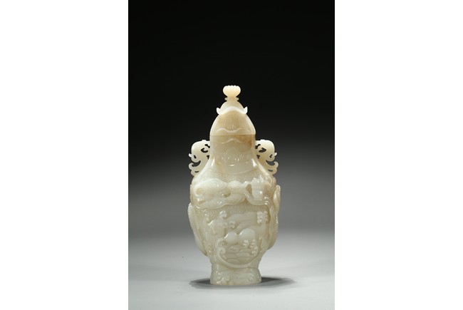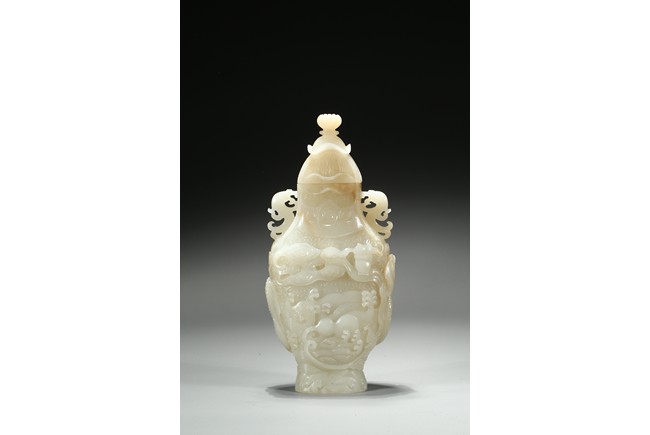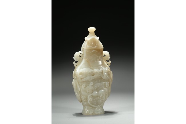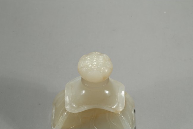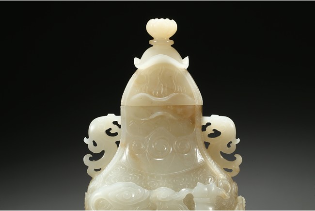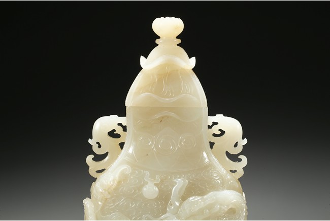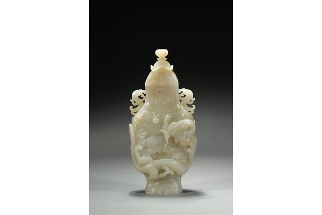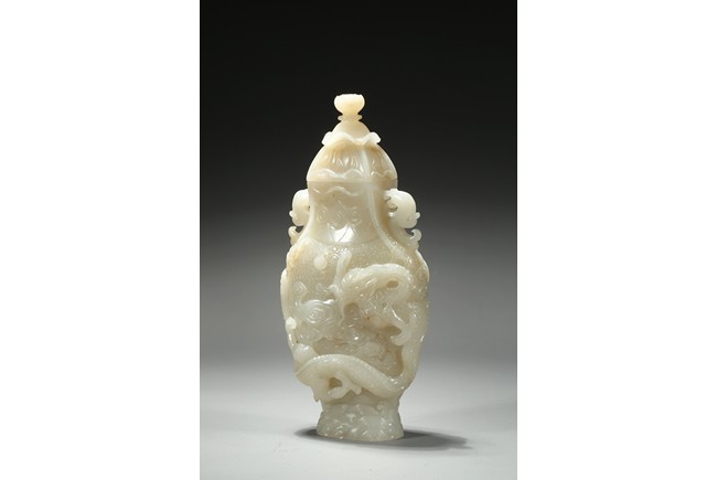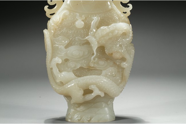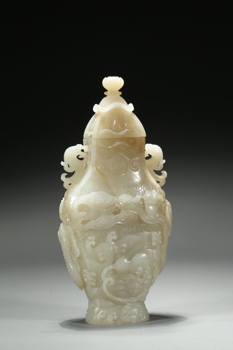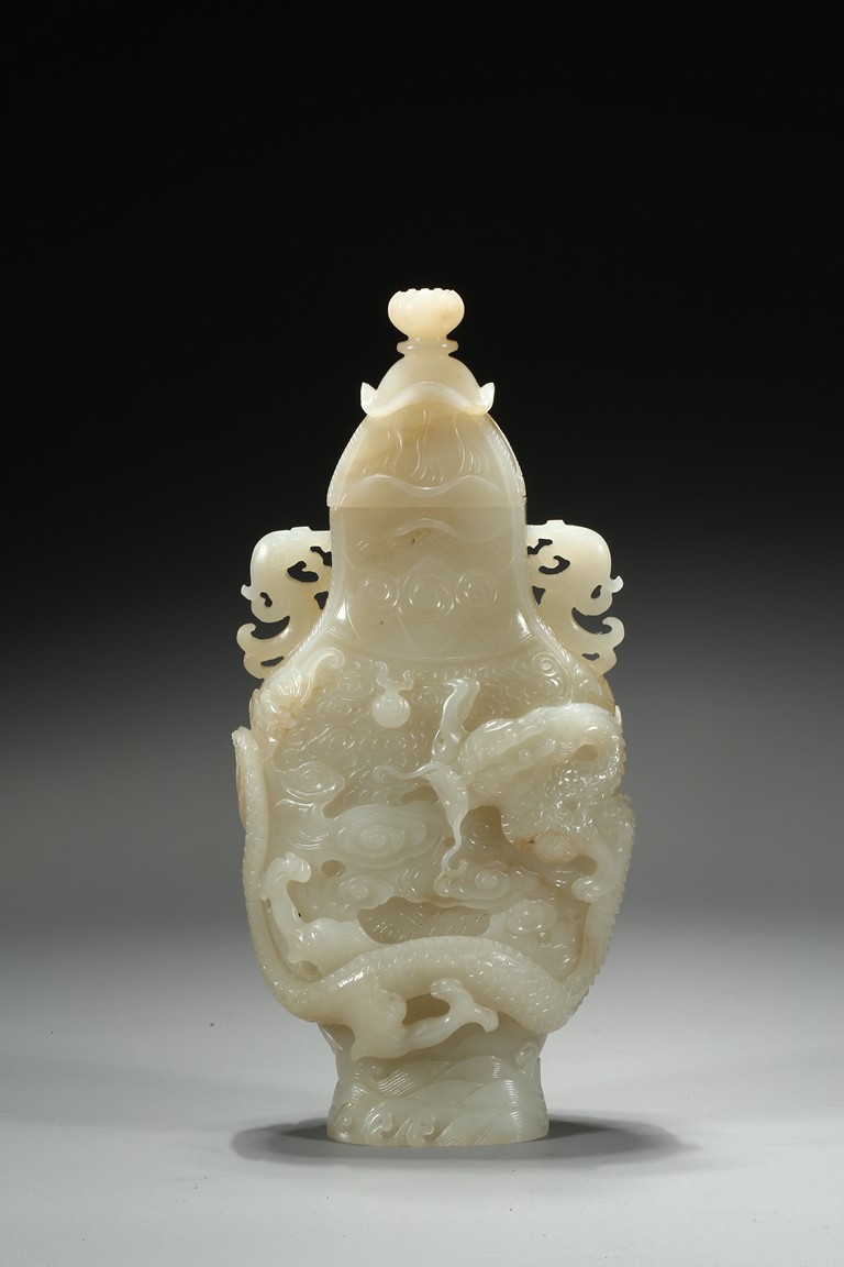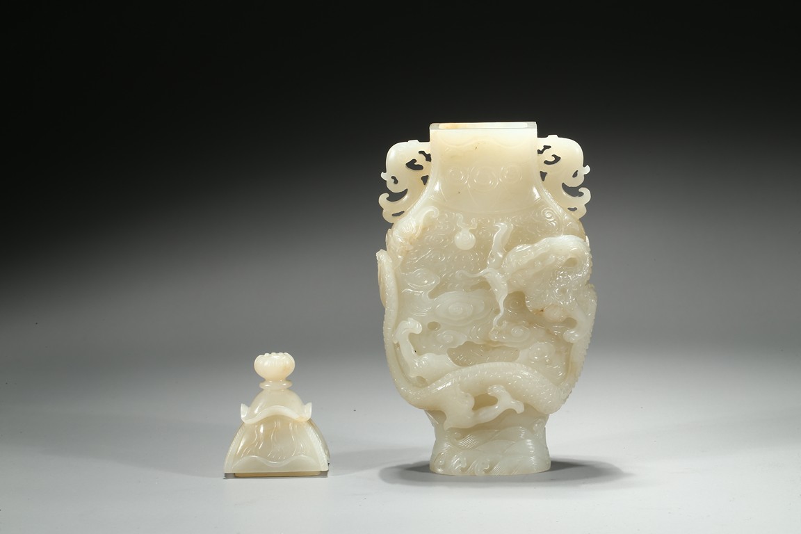 Of flattened baluster form, the waisted neck flanked with stylized phoenix form, the body deftly carved in high relief with a ferocious sinuous dragon in pursuit of a flaming pearl, the scales finely detailed, amongst cloud scrolls and above turbulent ocean waves, all highly detailed with incised lines reserved on a dense ground of incised clouds, surmounted with a domed cover and a lotus bud formed finial. Qing Dynasty Qianlong period.