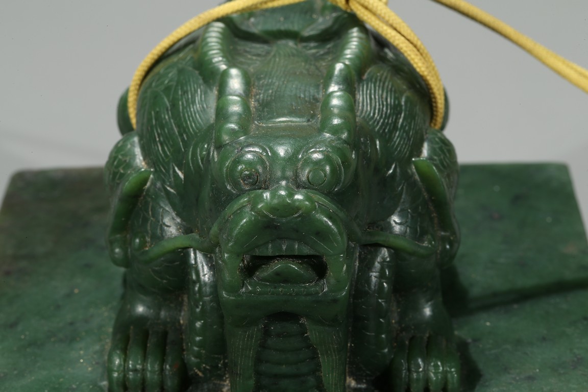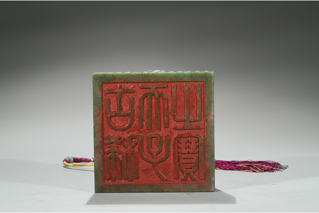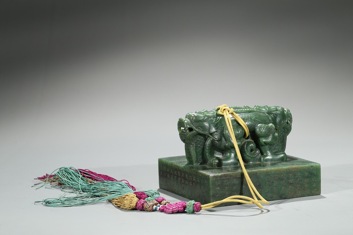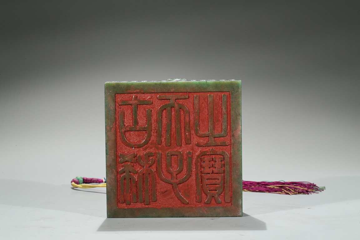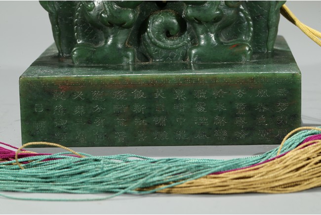 The square seal is surmounted with a mythical double-headed beast carved recumbent with scales and wings, the two pairs of opposing horns conjoining above the articulated spine, the side inscribed in gilt with imperial inscriptions.The seal face carved with six characters. The stone is of spinach green tone with some russet veins.