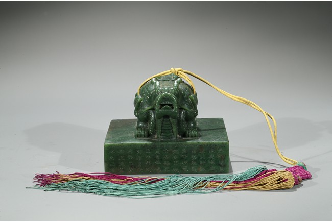 整件器物用碧玉雕製而成,交龍鈕,印面正方,四壁有陰刻文字、回紋,底部款識“古稀天子”。 張先生舊藏