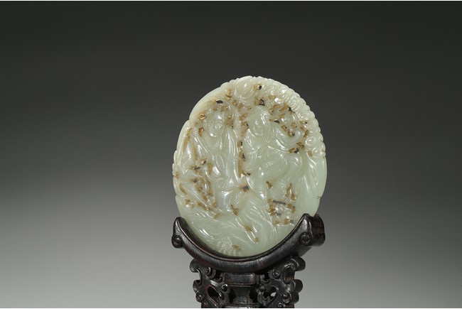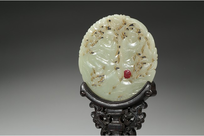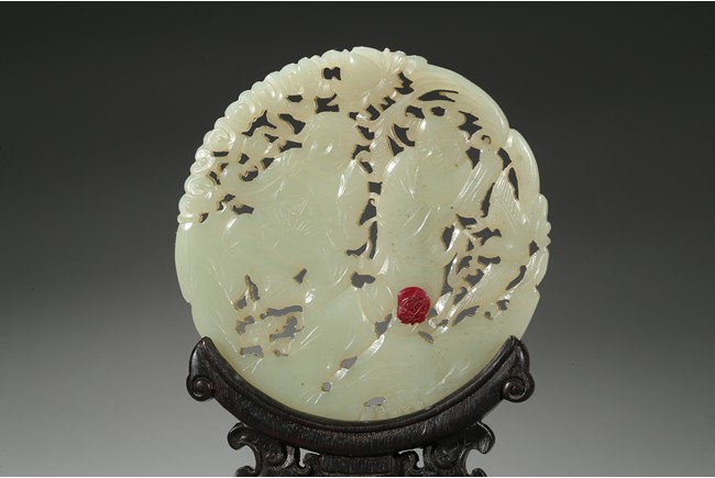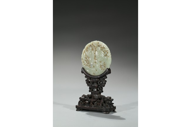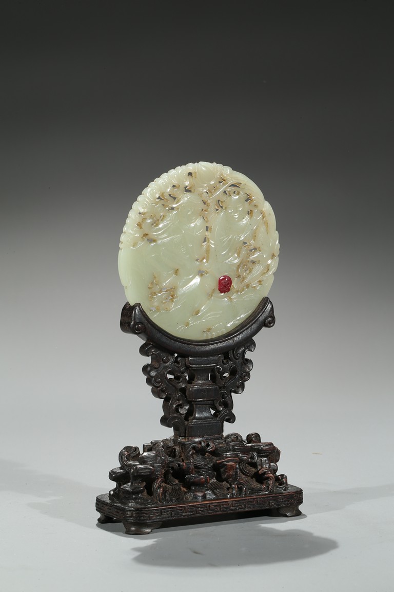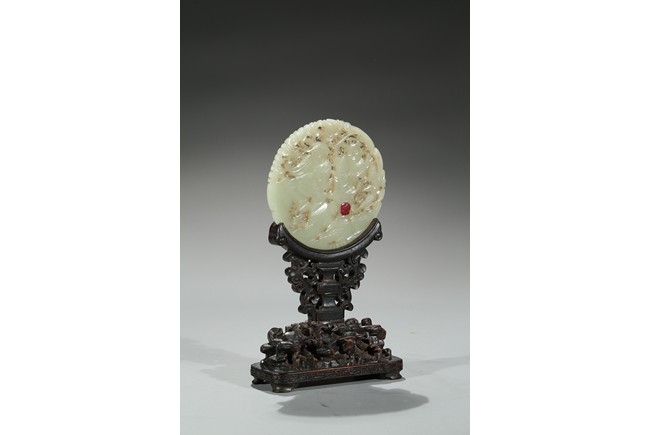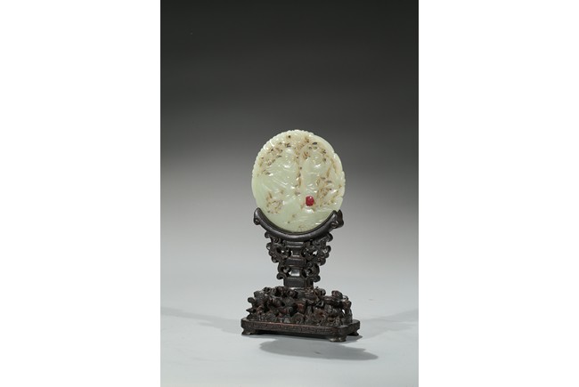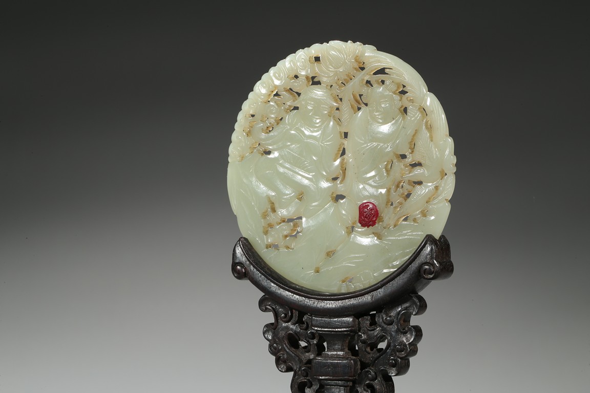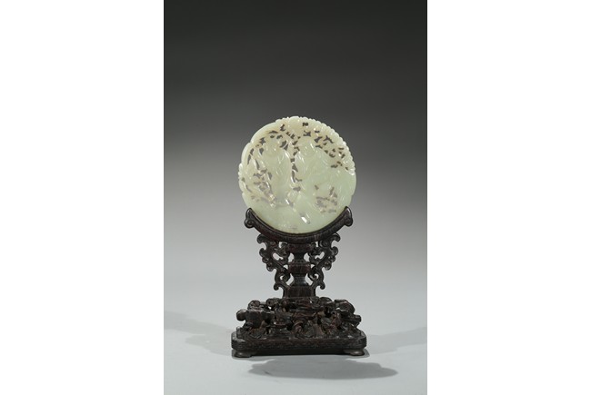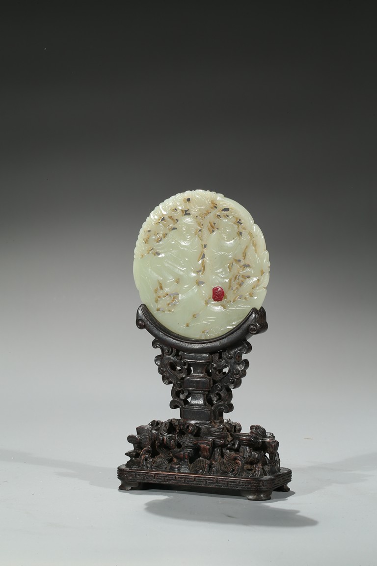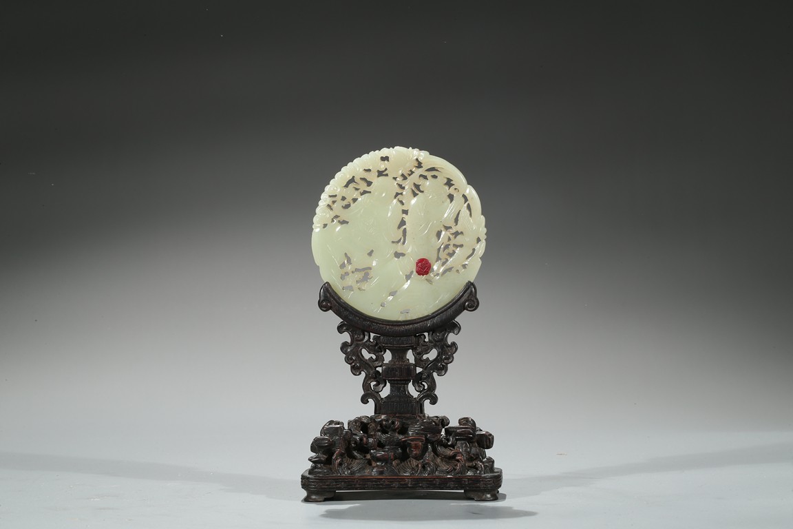 Of circular form, the jade carved and reticulated in openwork depicting two boys 'Hehe Erxian', one holding a closed rounded box, the other clutching a lotus stem next to a crane, all supported on finely carved zitan stand. Qing Dynasty period.