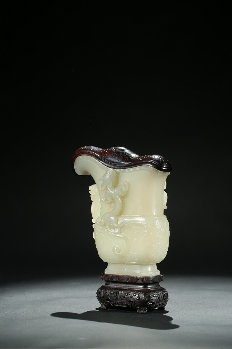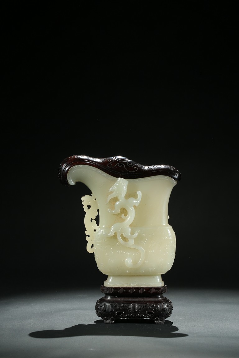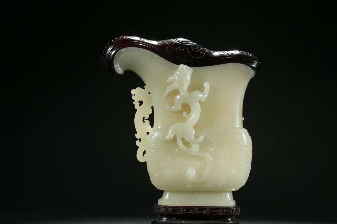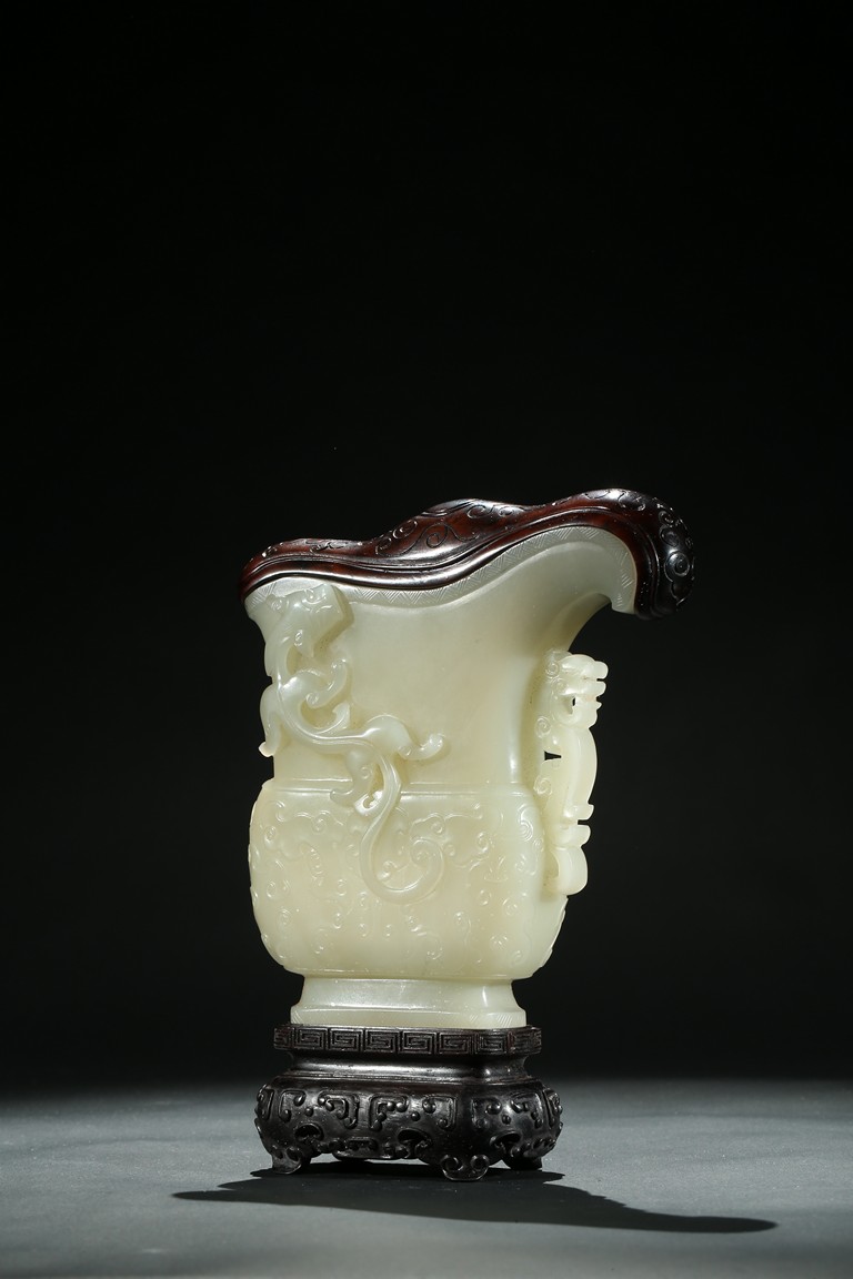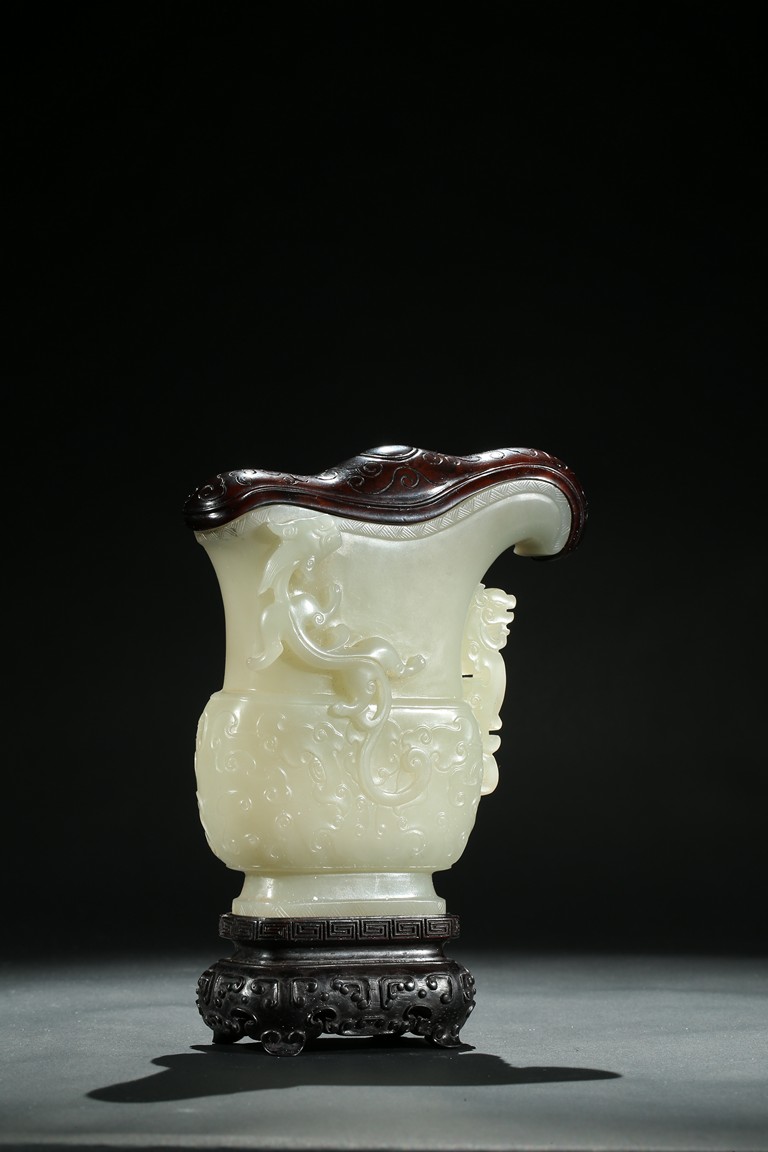 In the form of an archaic bronze guang, the pouring vessel of an oval cross-section, decorated in high relief with two clambering chilong extending from body to the mouth, the body decorated in shallow relief with stylized scroll pattern, all supported on a well carved hardwood stand and cover fitted with hardwood cover. Qing Dynasty period.