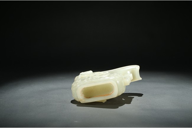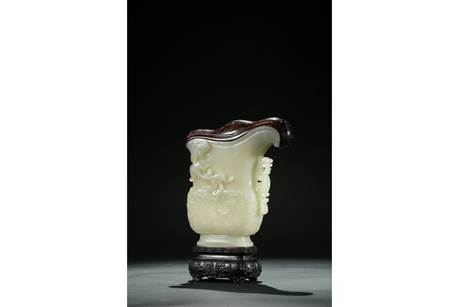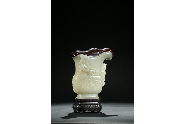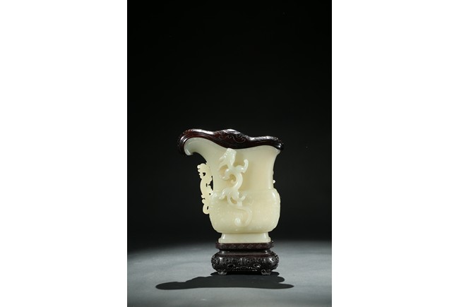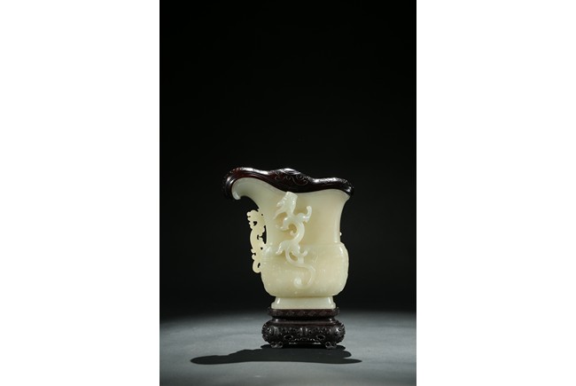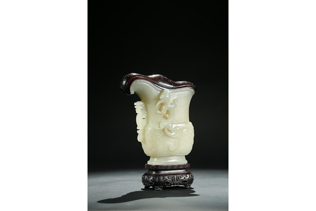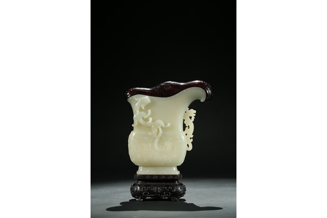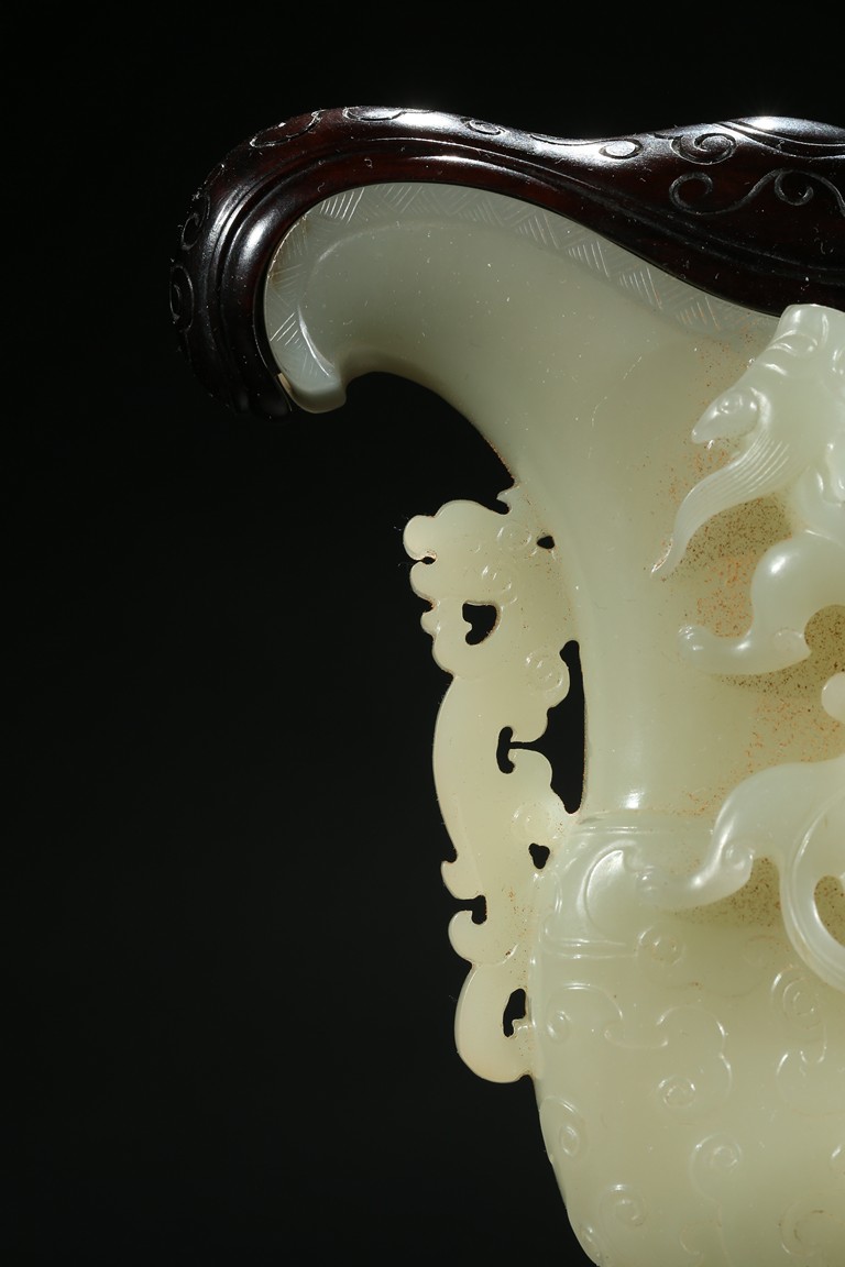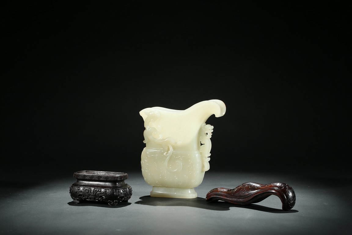 In the form of an archaic bronze guang, the pouring vessel of an oval cross-section, decorated in high relief with two clambering chilong extending from body to the mouth, the body decorated in shallow relief with stylized scroll pattern, all supported on a well carved hardwood stand and cover fitted with hardwood cover. Qing Dynasty period.