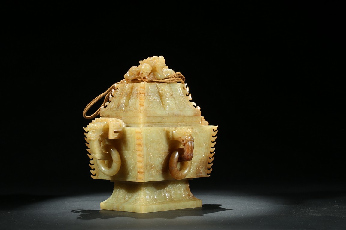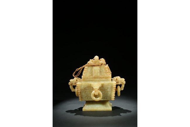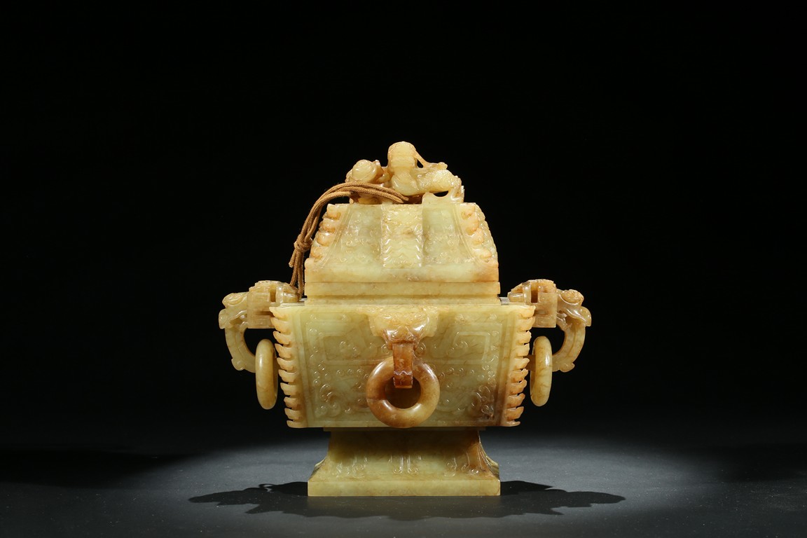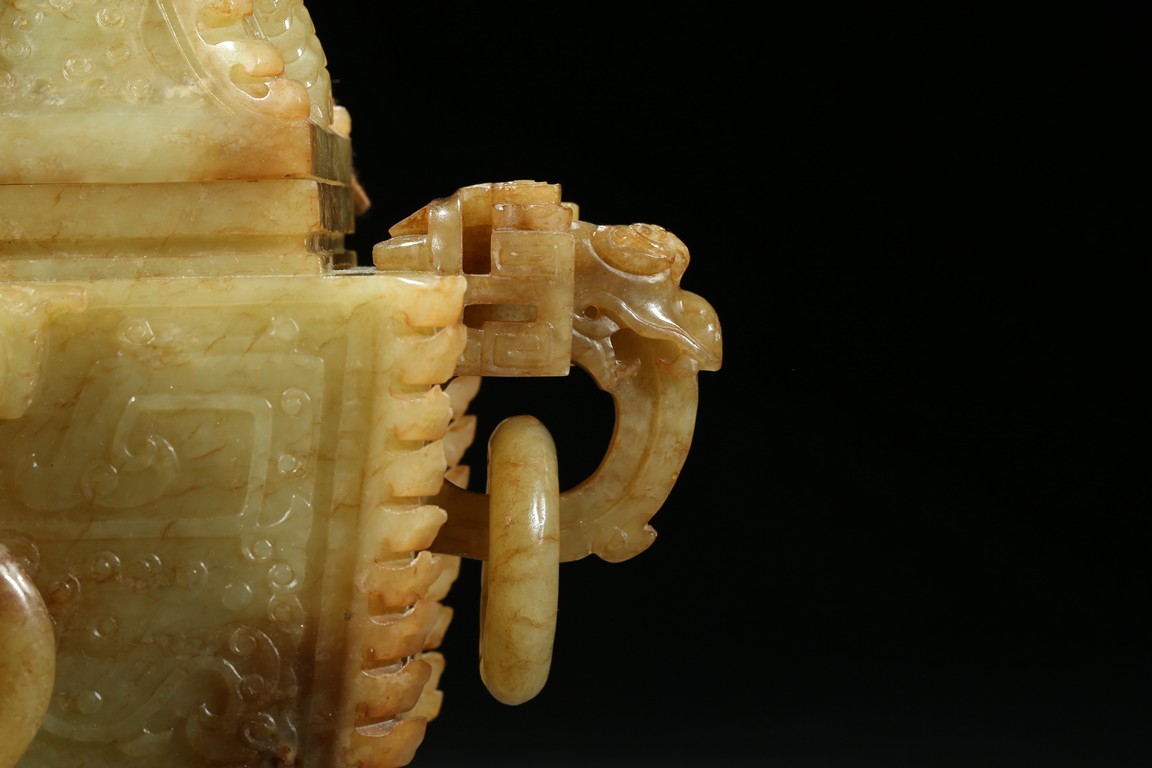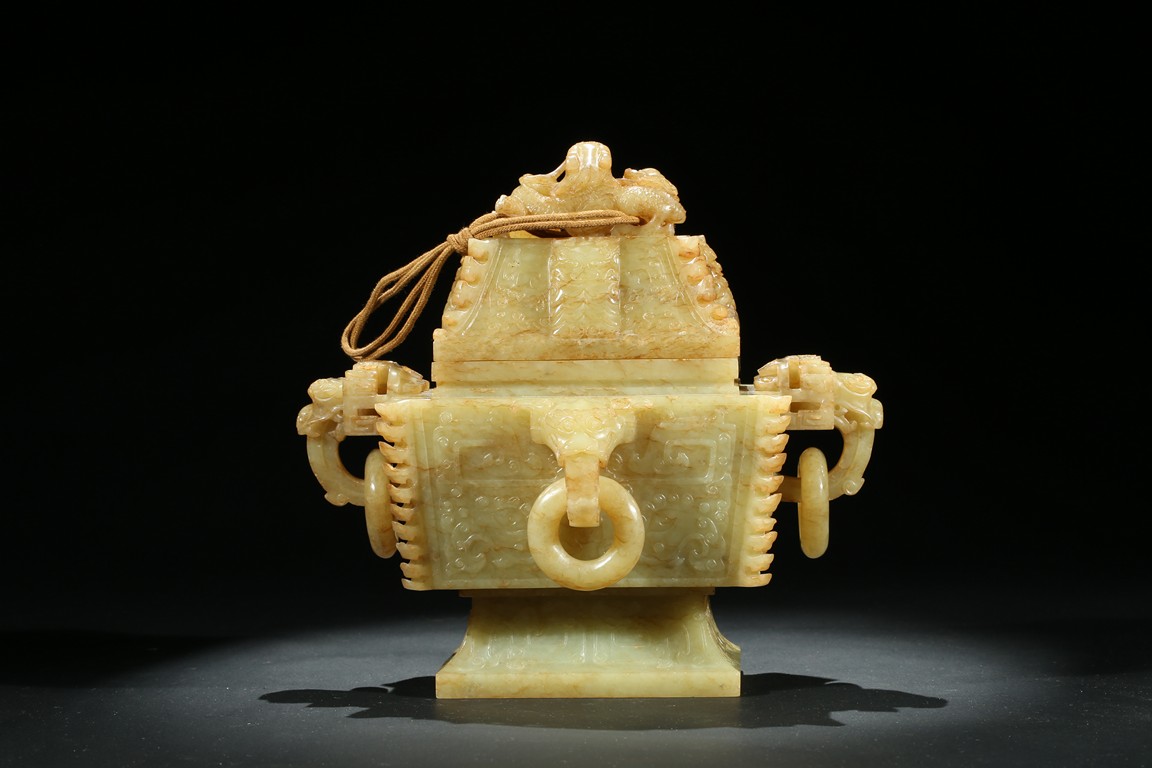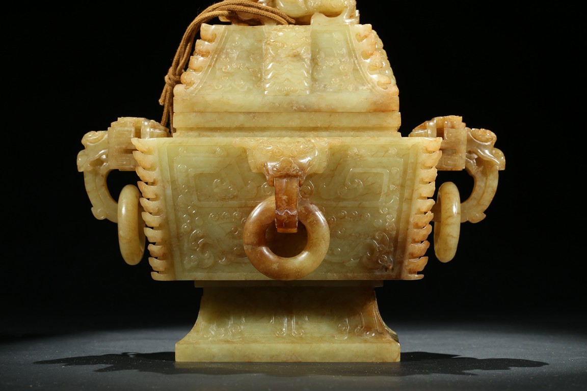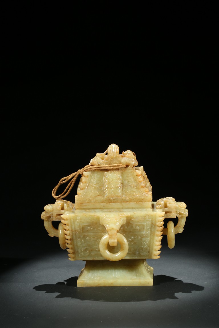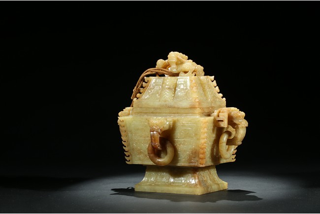 The censer is modelled after an archaic bronze ritual vessel and is carved and pierced with four handles modelled as mythical beasts. It is supported on spreading foot, the exterior finely carved in shallow relief with taotie mask, the cover further carved with an openwork coiled dragon finial. The stone is of light yellow tone with russet inclusions. Qing Dynasty Qianlong period.