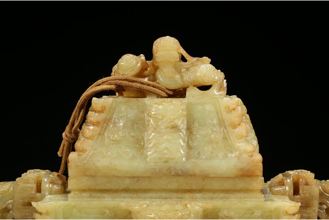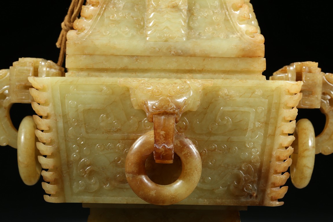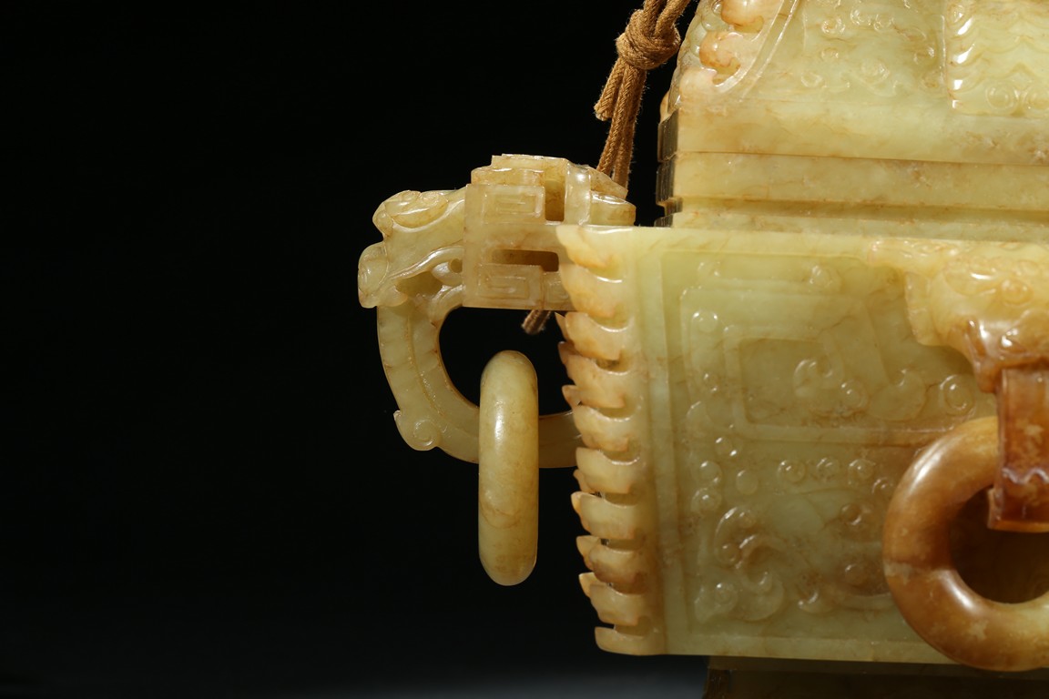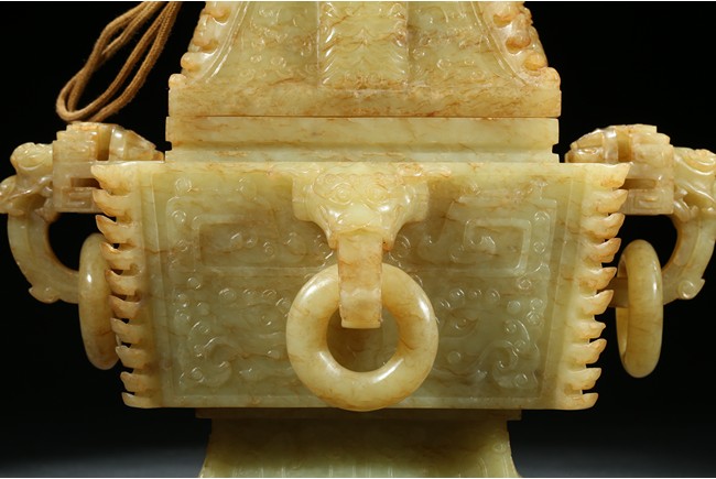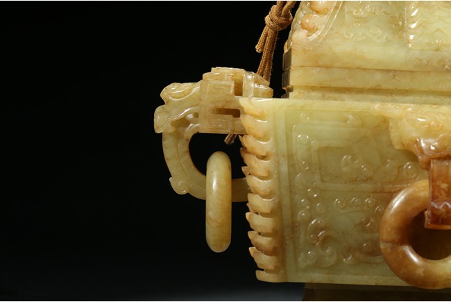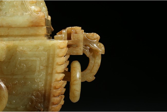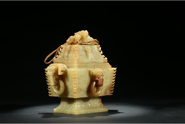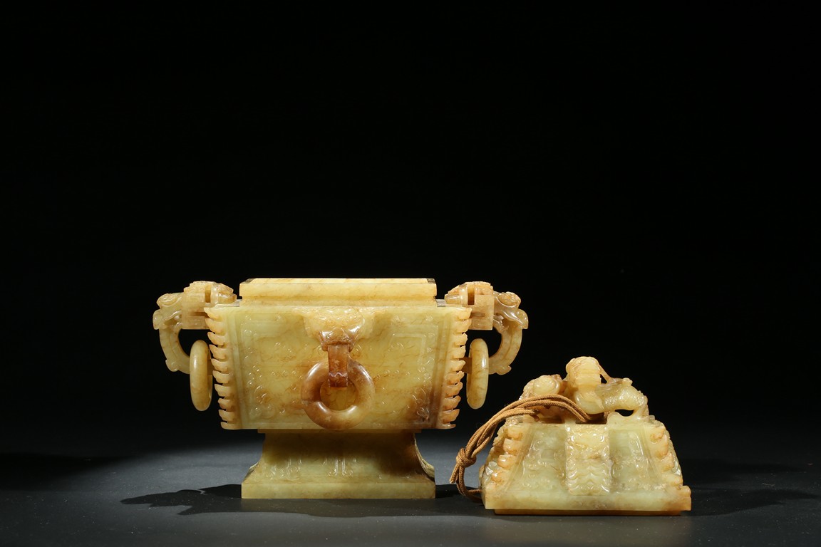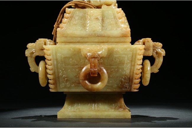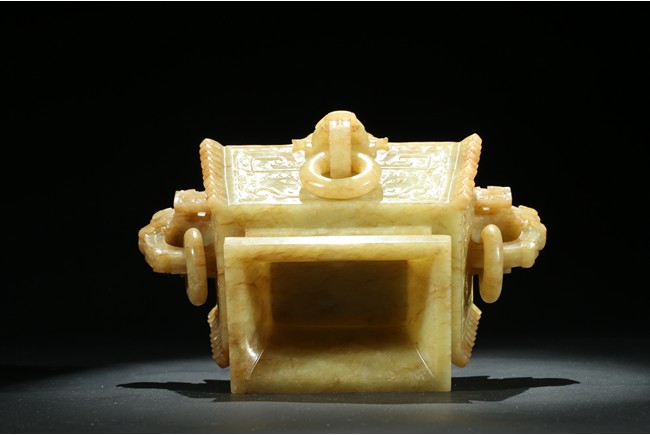 黃玉是極為珍貴的軟玉品種。明代高濂在《遵生八箋》中就有“玉以甘黃為上,羊脂次之;黃為中色,且不易得,以白為偏色,時亦有之,故而令人賤黃而貴白,以見少也……”這無疑從一個側面顯示出上等黃玉出產較少,身價在羊脂白玉之上。色澤純正的黃玉是玉材中最名貴的一種,材料極其難得。宋代到清代之間一直被皇家壟斷。明末的士大夫階層非常看重黃玉和白玉,其下為甘青、碧玉、墨玉、紅玉。此件器物用整塊黃玉雕琢而成,用料碩大,不惜成本。玉質溫潤,包漿醇熟。器形為效仿商周時期的酒器方彞變體而成。直口有蓋,器身與蓋子母口扣合緊密,蓋上雕有一飛龍,器物四周有獅鈕,飾饕餮紋。整件器物掏膛俐落,形制規整,紋飾華麗,頗有古意。乾隆酷愛仿古,應為清宮仿古陳設器物。黃玉是極為珍貴的軟玉品種。明代高濂在《遵生八箋》中就有“玉以甘黃為上,羊脂次之;黃為中色,且不易得,以白為偏色,時亦有之,故而令人賤黃而貴白,以見少也。”這無疑從一個側面顯示出上等黃玉出產較少,身價在羊脂白玉之上。色澤純正的黃玉是玉材中最名貴的一種,材料極其難得。宋代到清代之間一直被皇家壟斷。明末的士大夫階層非常看重黃玉和白玉,其下為甘青、碧玉、墨玉、紅玉。此件器物用整塊黃玉雕琢而成,用料碩大,不惜成本。玉質溫潤,包漿醇熟。器形為效仿商周時期的酒器方彞變體而成。直口有蓋,器身與蓋子母口扣合緊密,蓋上雕有一飛龍,器物四周有獅鈕,飾饕餮紋。整件器物掏膛俐落,形制規整,紋飾華麗,頗有古意。乾隆酷愛仿古,應為清宮仿古陳設器物。張先生舊藏