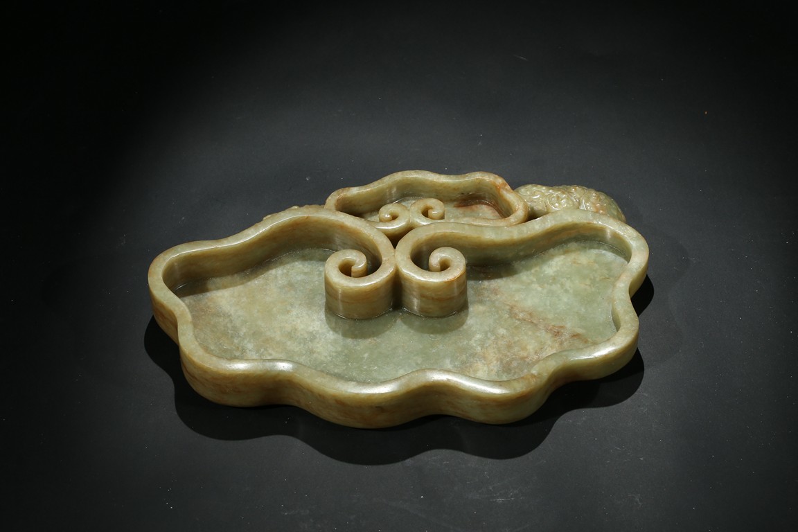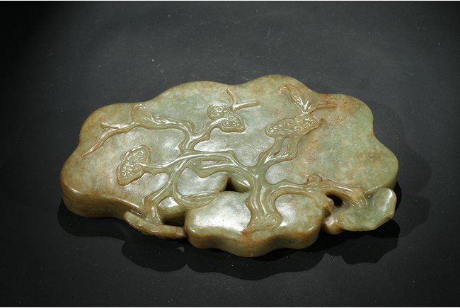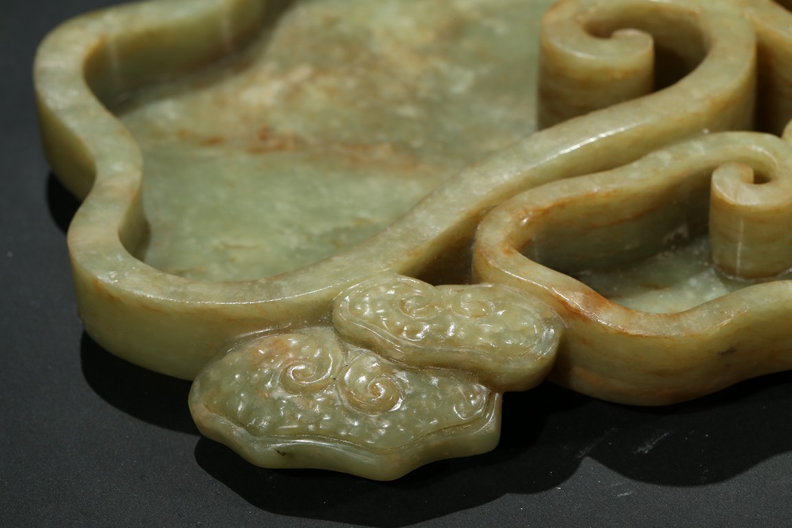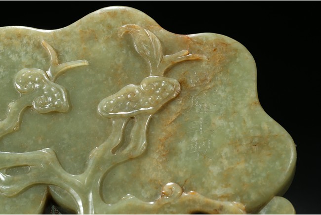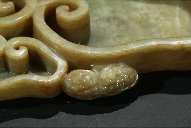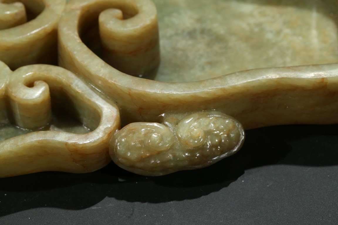Of irregular section, the thick-walled, shallow vessel carved as two single stylized lingzhi heads, the base carved in relief with gnarled lingzhi branches and incised with four character Qianlong mark. Qing Dynasty period.