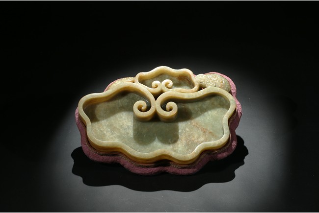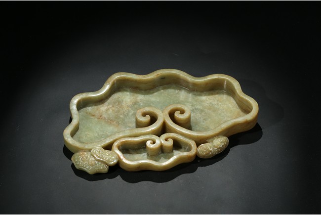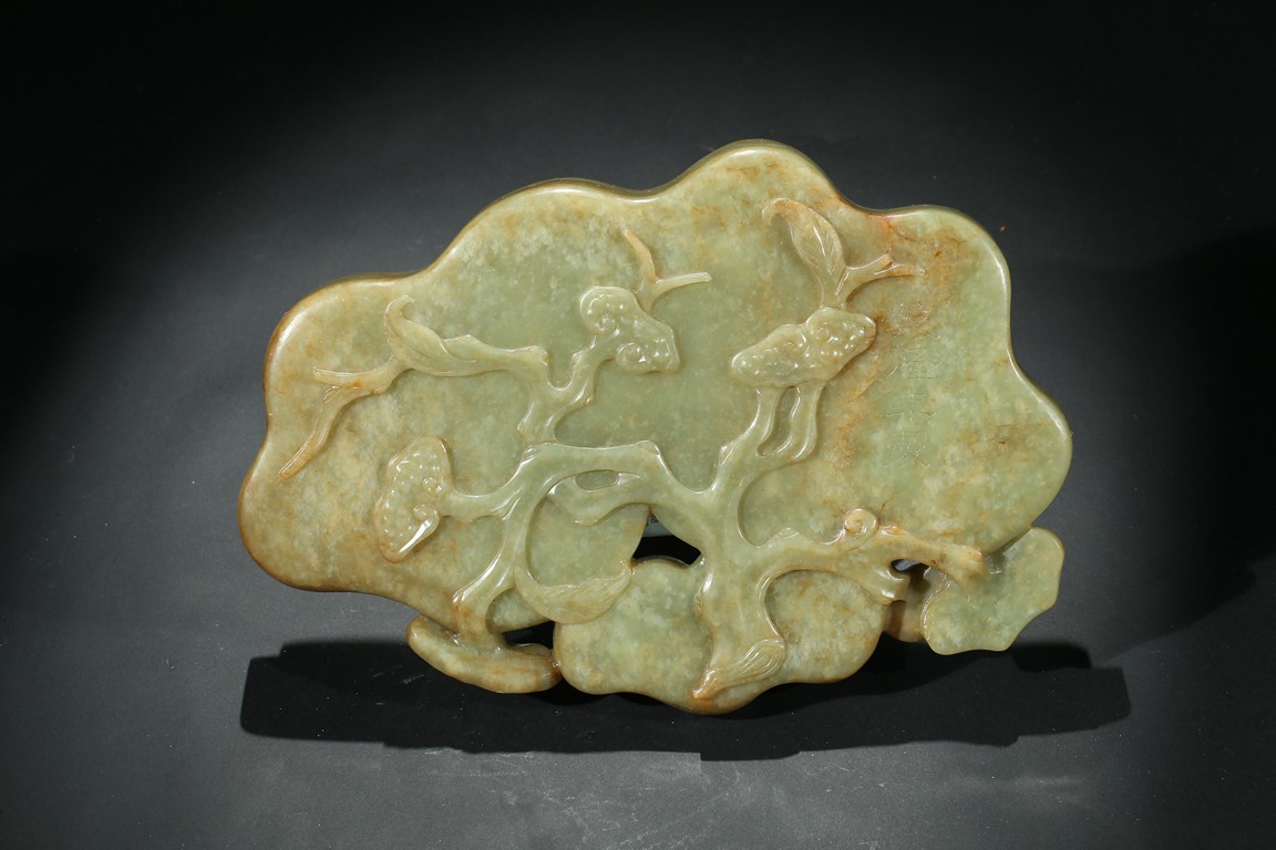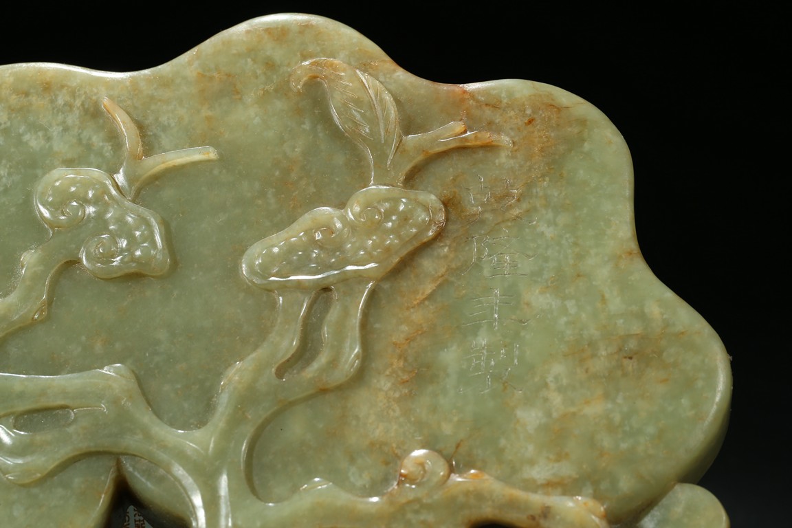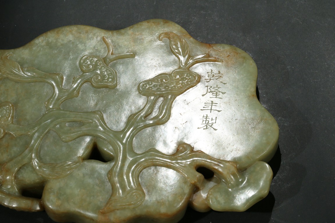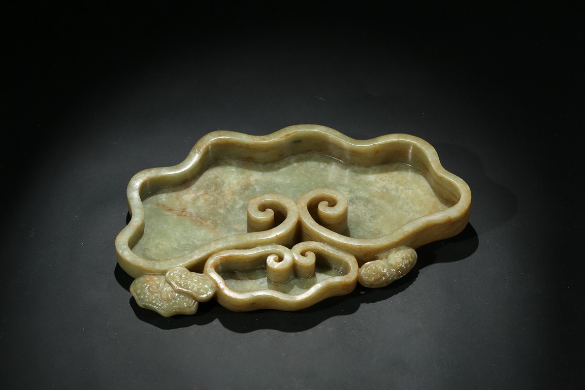Of irregular section, the thick-walled, shallow vessel carved as two single stylized lingzhi heads, the base carved in relief with gnarled lingzhi branches and incised with four character Qianlong mark. Qing Dynasty period.