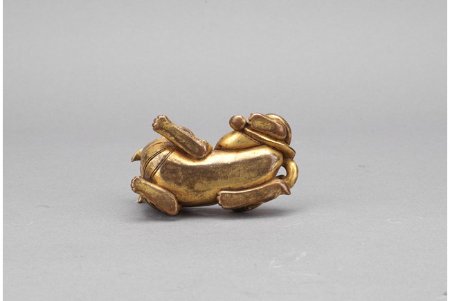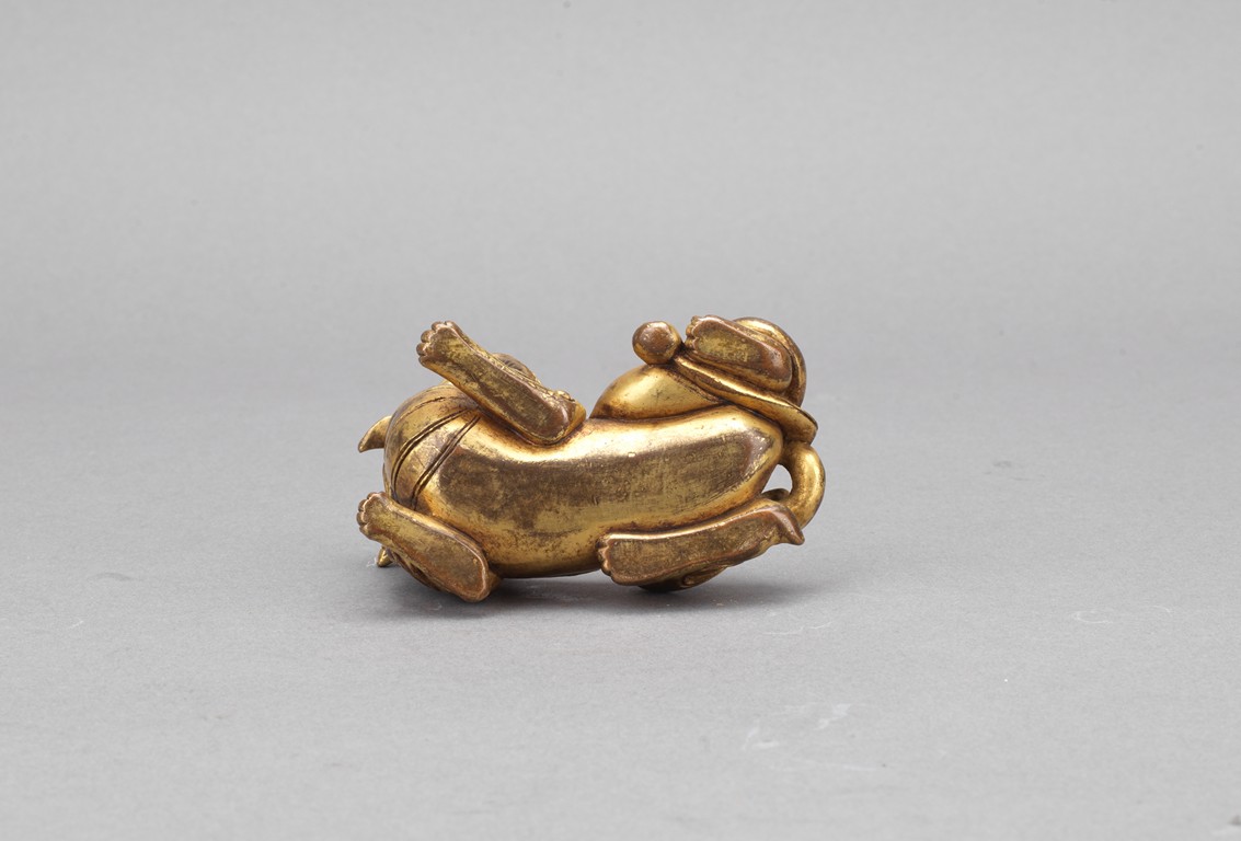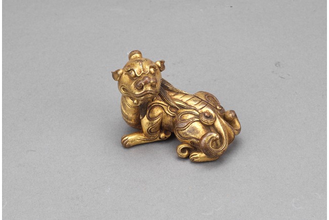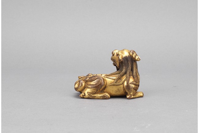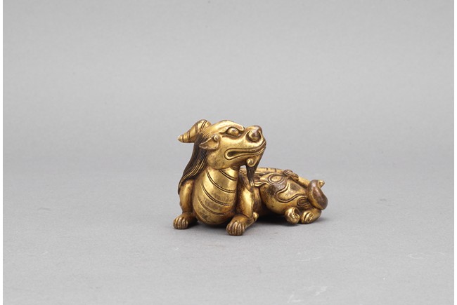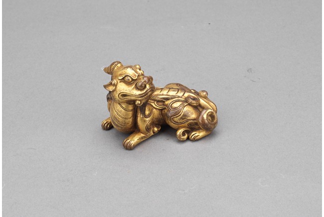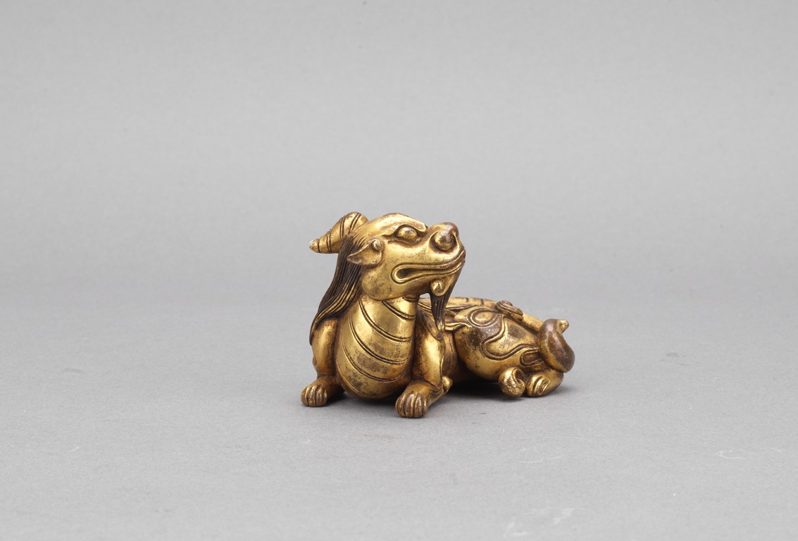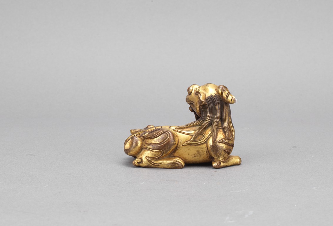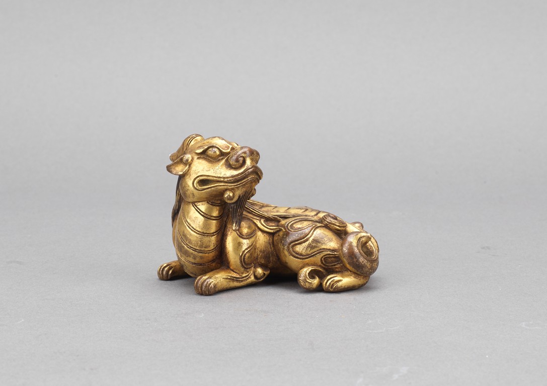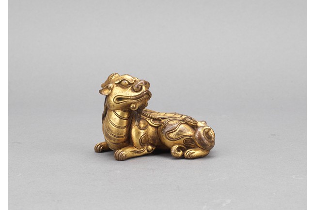 Cast recumbent with its head turned sharply backwards, the single horned mythical beast with powerful nose and protruding eyes, mane finely detailed with incised lines and tail split into three. Qing Dynasty period.