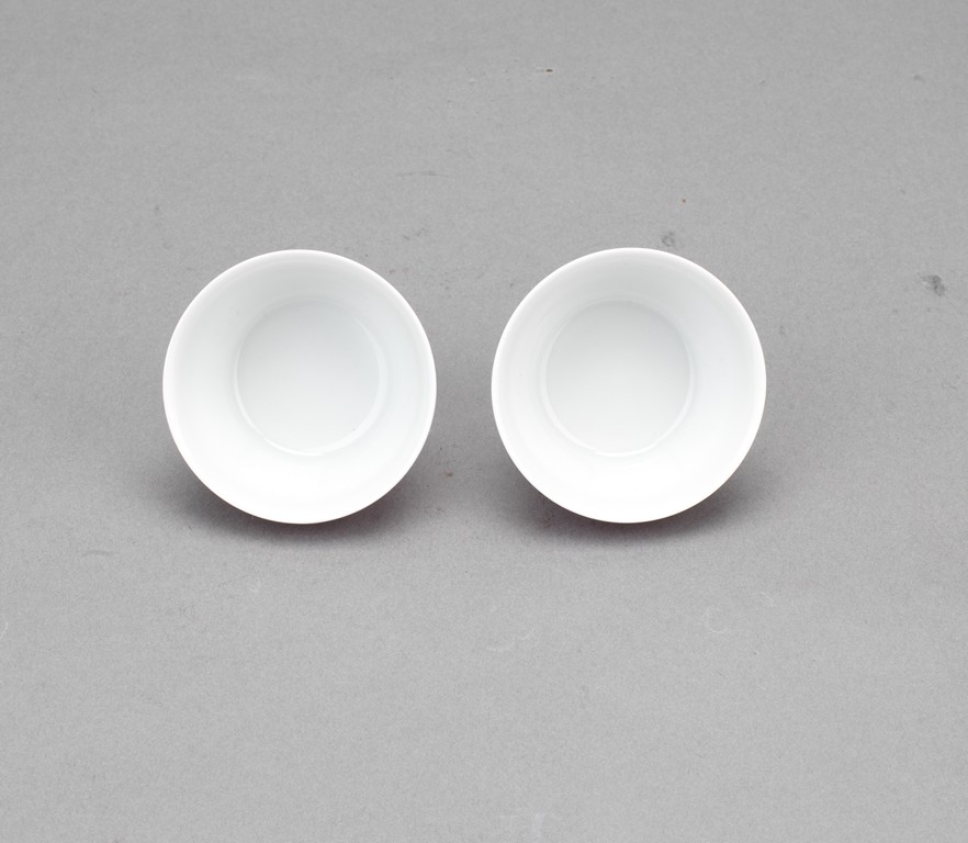 杯奢口,圈足。杯內及足內均施白釉,外壁施胭脂紅釉。外底署青花楷書“大清雍正年制”六字款。胭脂紅釉創燒於清康熙末年,雍正、乾隆、嘉慶、光緒等朝均有燒造,其中以雍正朝產量最大,質量最精。它是一種以微量金(Au)作著色劑、在爐內經800℃左右焙燒而成的低溫紅釉。由於這種紅料是從歐洲轉入,故被稱為“洋金紅”或“西洋紅”,而西方多稱之為“薔薇紅”、“玫瑰紅”。又由於這種紅釉頗如婦女化妝用的胭脂之色,故又名“胭脂紅”。胭脂紅釉的呈色有深、淺之分,深者稱“胭脂紫”,淺者稱“胭脂水”,比胭脂水更淺淡者稱“淡粉紅”。雍正十三年(1735年)督陶官唐英所撰《陶成紀事》中記載當時歲例貢禦的57種釉、彩瓷器中即有“西洋紅色器皿”。從傳世品看,雍正朝胭脂紅釉瓷器造型有瓶、罐、盤碗、杯、碟等,均胎體輕薄,玲瓏俊秀,多數為內白釉,外胭脂紅釉,極少數為內外均施胭脂紅釉。