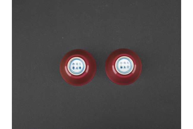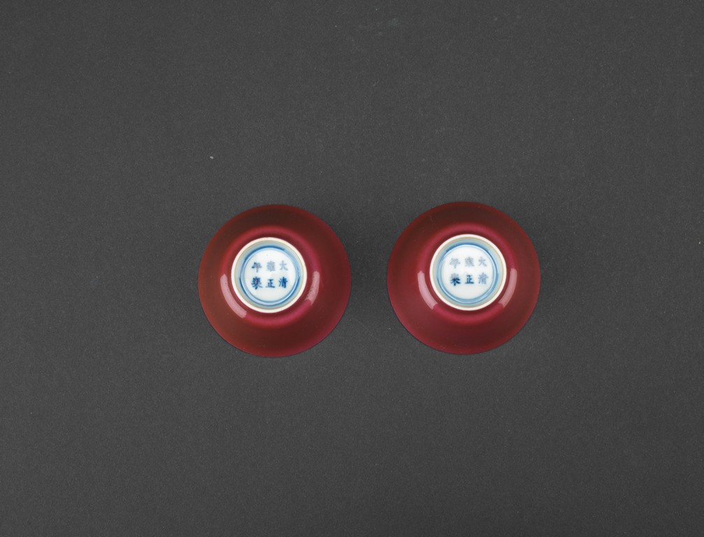 With a slightly everted rim, a rich red glaze to the body that thins toward the rim, the interior and base white, inscribed with six character Yongzheng mark. Qing Dynasty Yongzheng period.