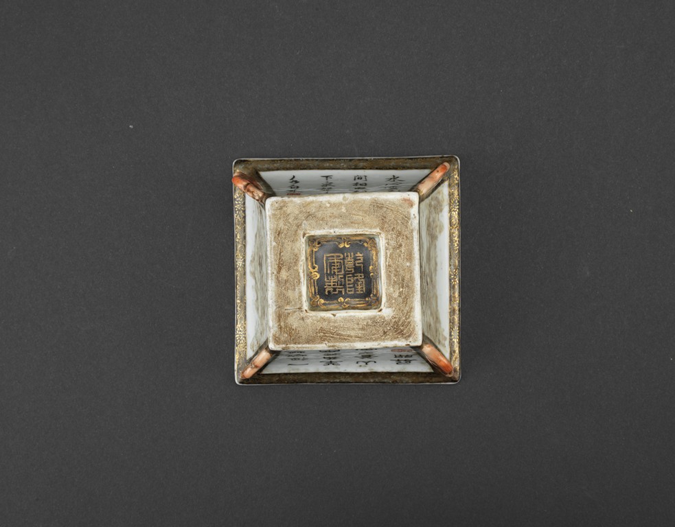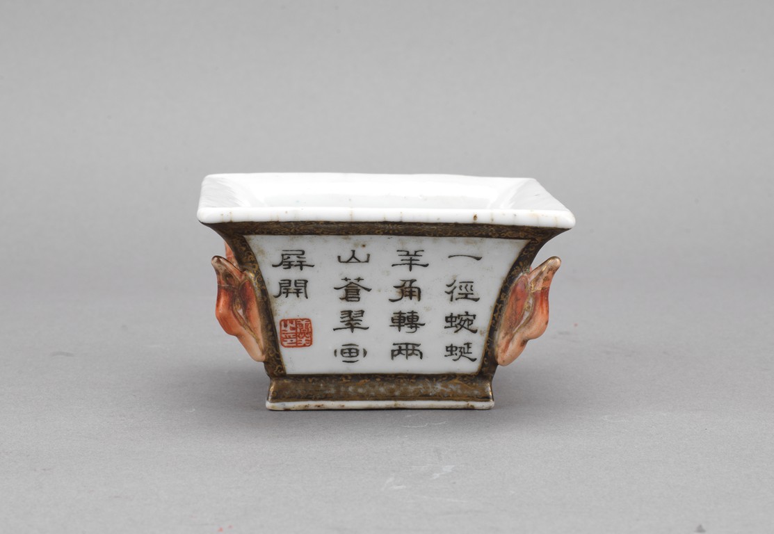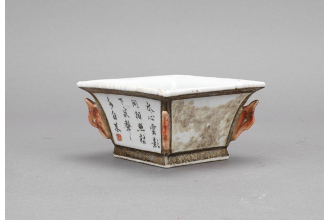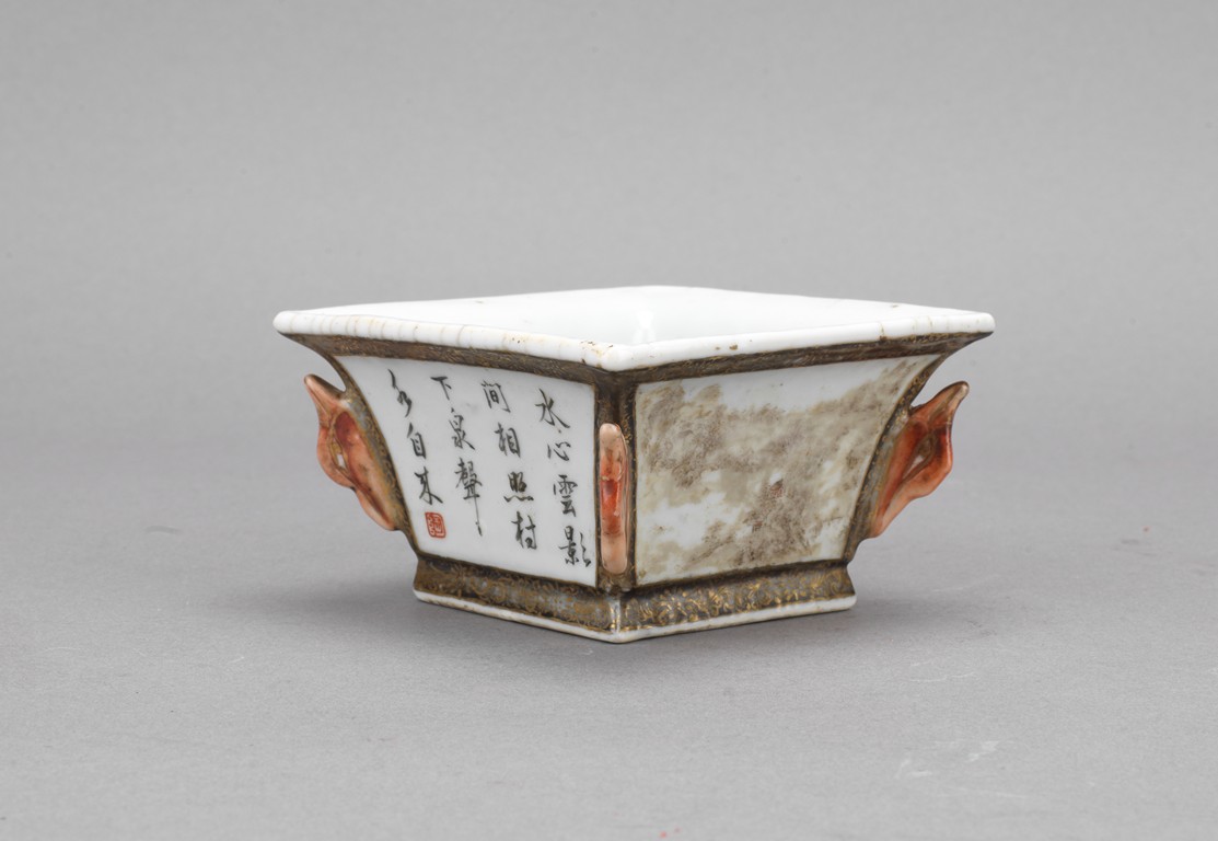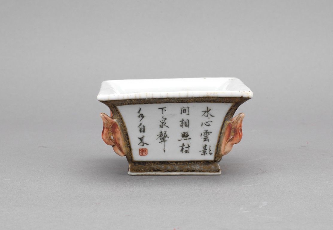 此筆洗呈四方型,方口、方足,四壁起棱,棱上施礬紅作羊頭,設色精美。四面開窗,以墨彩寫禦題詩【一徑婉轉羊角轉兩山蒼翠畫屏開,水心雲影閑相照林下泉聲靜自來】畫山水畫。內外壁與底皆罩白釉,僅以墨彩禦題詩山水為飾,通體描金,底落【乾隆年制】款識。素雅之中最見大氣端莊,文人雅士望之定是愛不惜手。而當日在清宮,也是帝王案頭良伴。