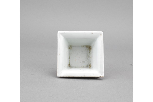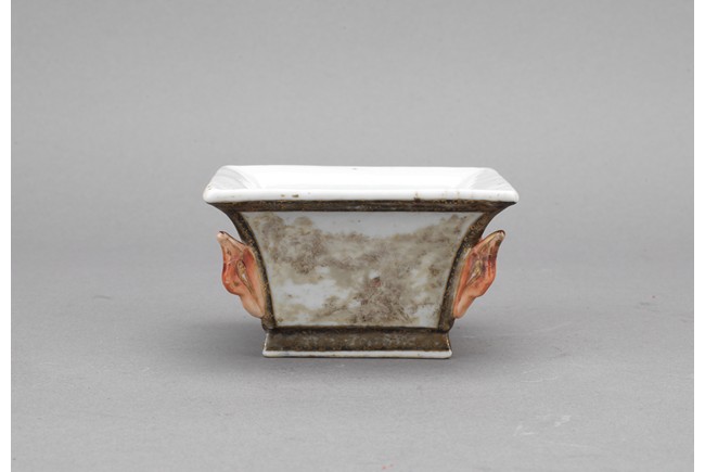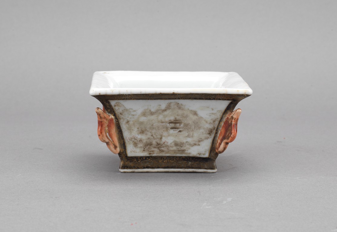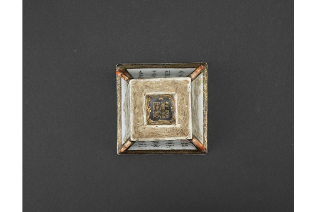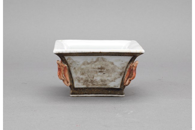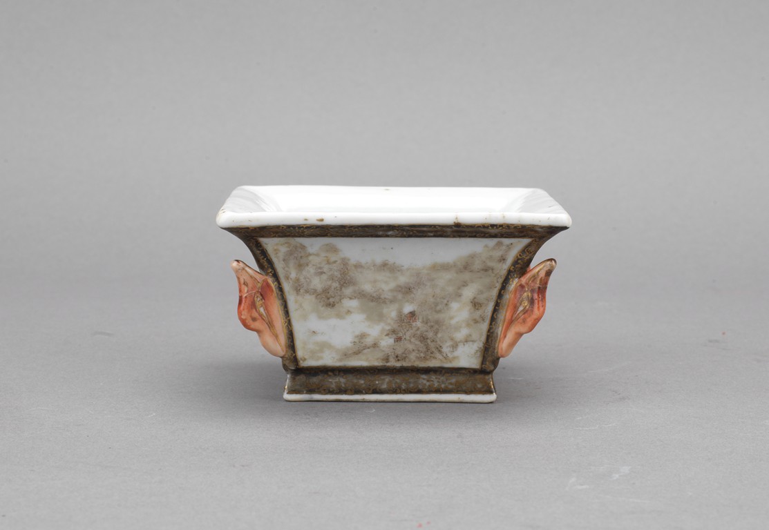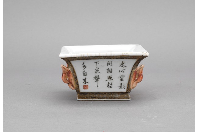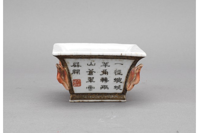 此筆洗呈四方型,方口、方足,四壁起棱,棱上施礬紅作羊頭,設色精美。四面開窗,以墨彩寫禦題詩【一徑婉轉羊角轉兩山蒼翠畫屏開,水心雲影閑相照林下泉聲靜自來】畫山水畫。內外壁與底皆罩白釉,僅以墨彩禦題詩山水為飾,通體描金,底落【乾隆年制】款識。素雅之中最見大氣端莊,文人雅士望之定是愛不惜手。而當日在清宮,也是帝王案頭良伴。