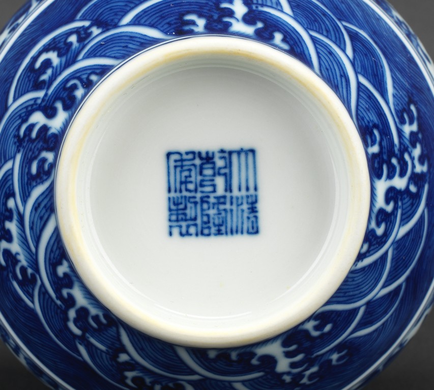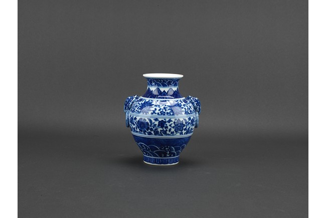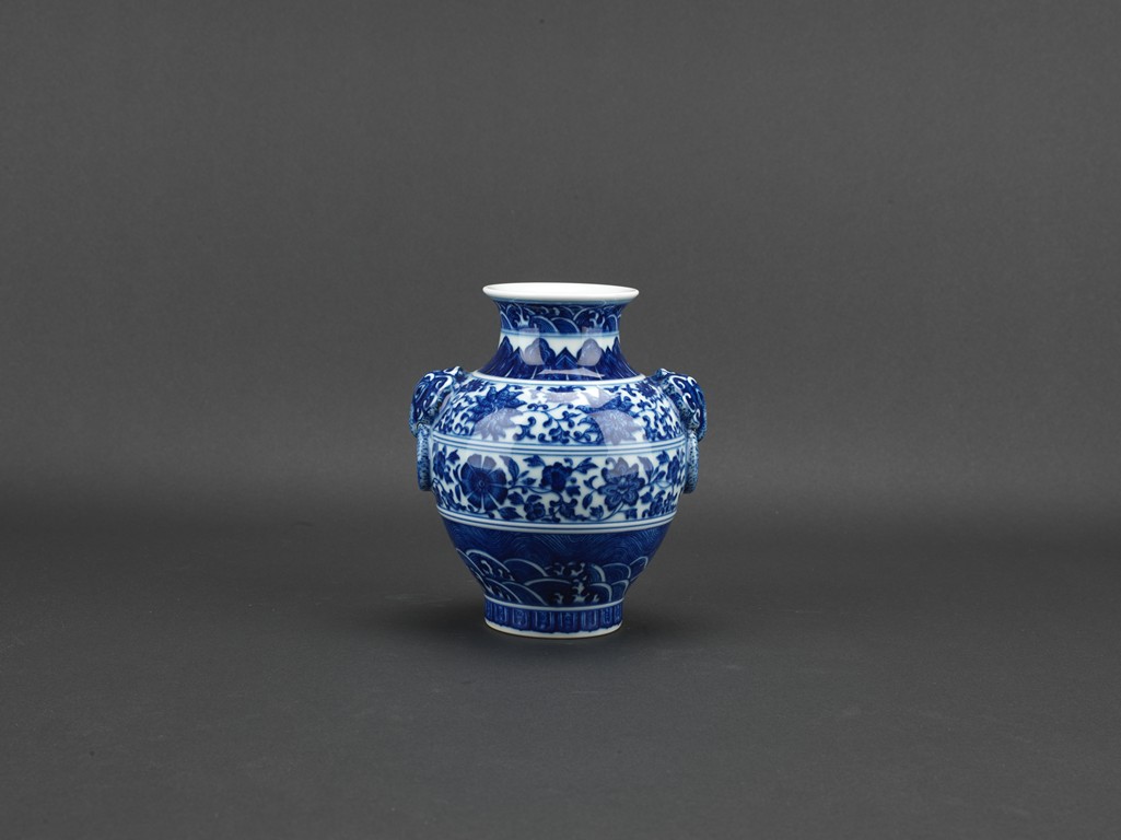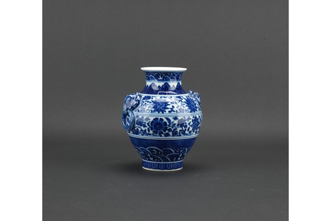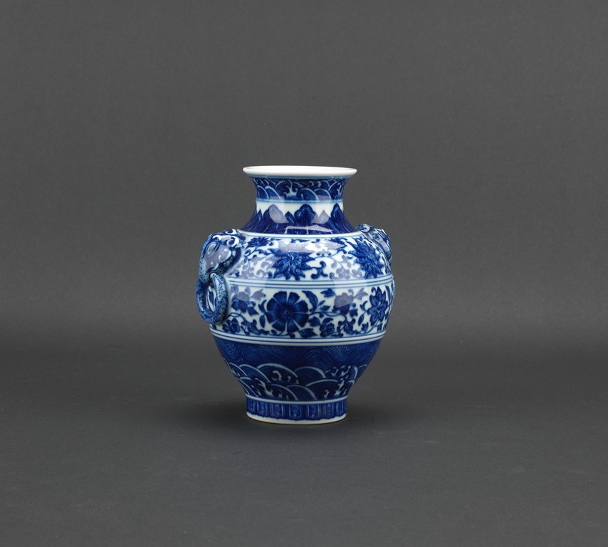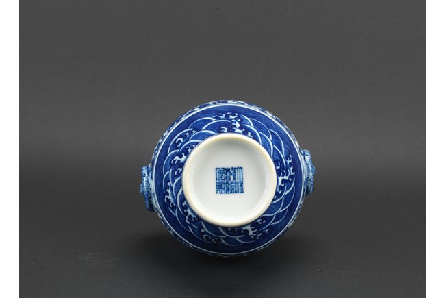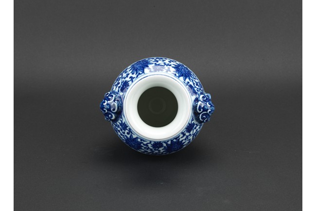 敞口,粗頸,獸環雙耳,豐肩,鼓腹漸收,圈足外撇,通體滿飾青花紋飾,主題紋飾為纏枝蓮紋,口沿、足部飾海水江崖蓮瓣紋。青花花色深沈,頸部飾蓮葉圖案,造型端莊清秀。胎質厚薄適度,釉面亮青平滑,底書“大清乾隆年制”六字三行青花篆書款。