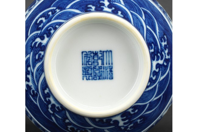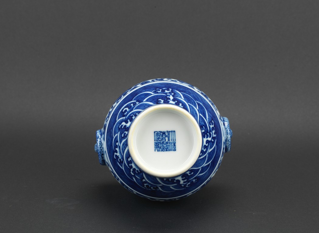 Decorated with lotus scroll and ocean wave to the body and flanked by two moulded mythical beast mask as handles.
