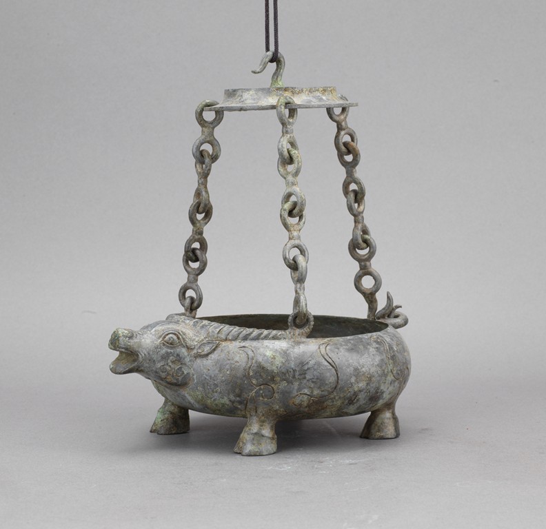 Modelled in the form of an ox standing foursquare with head finely detailed with protruding eyes, eyebrows, and open mouth, the rim set with three chains hanging from a circular cover on top. Han Dynasty period.
