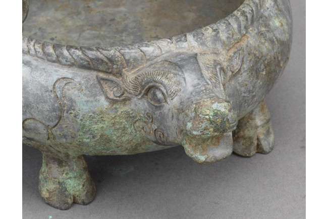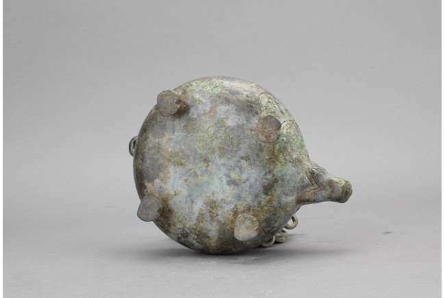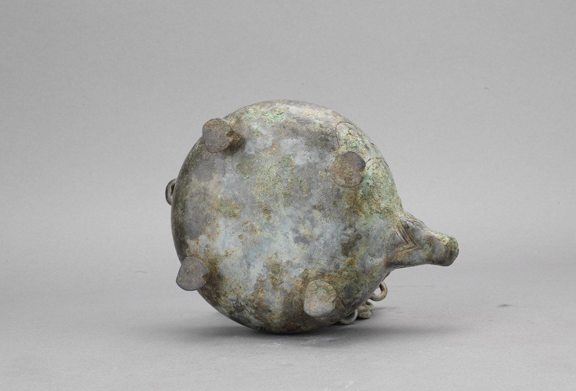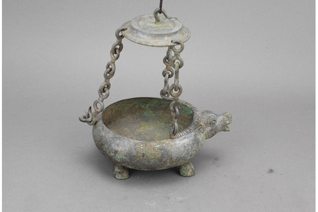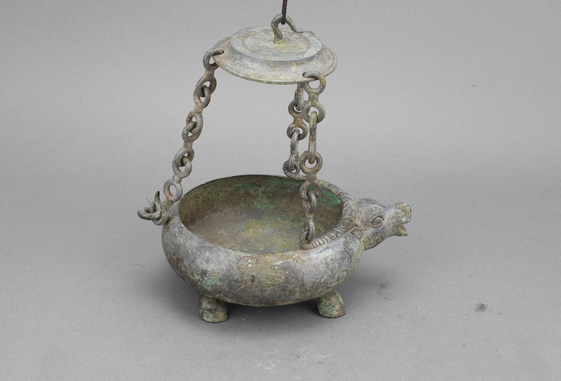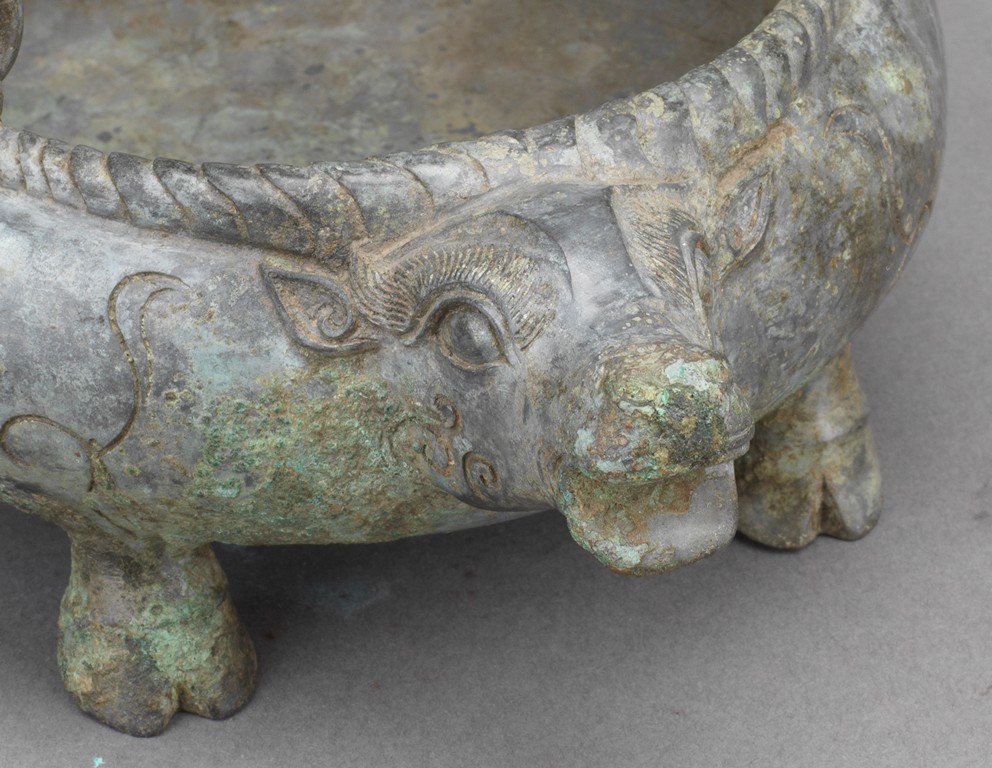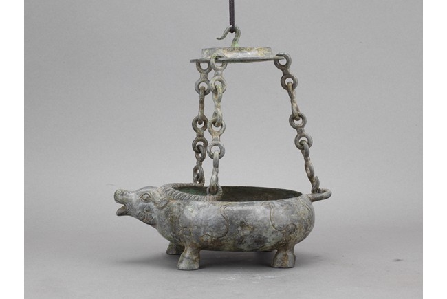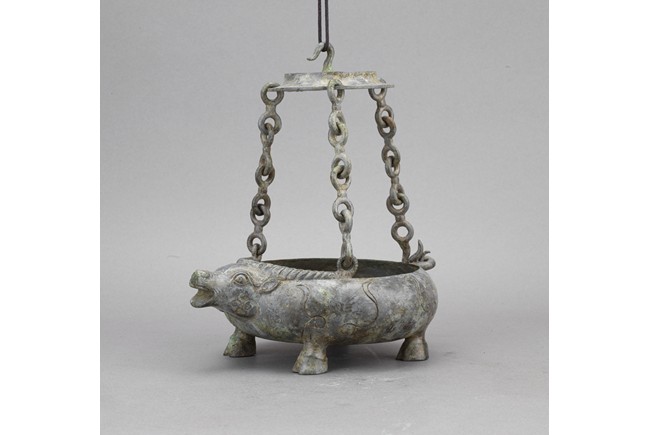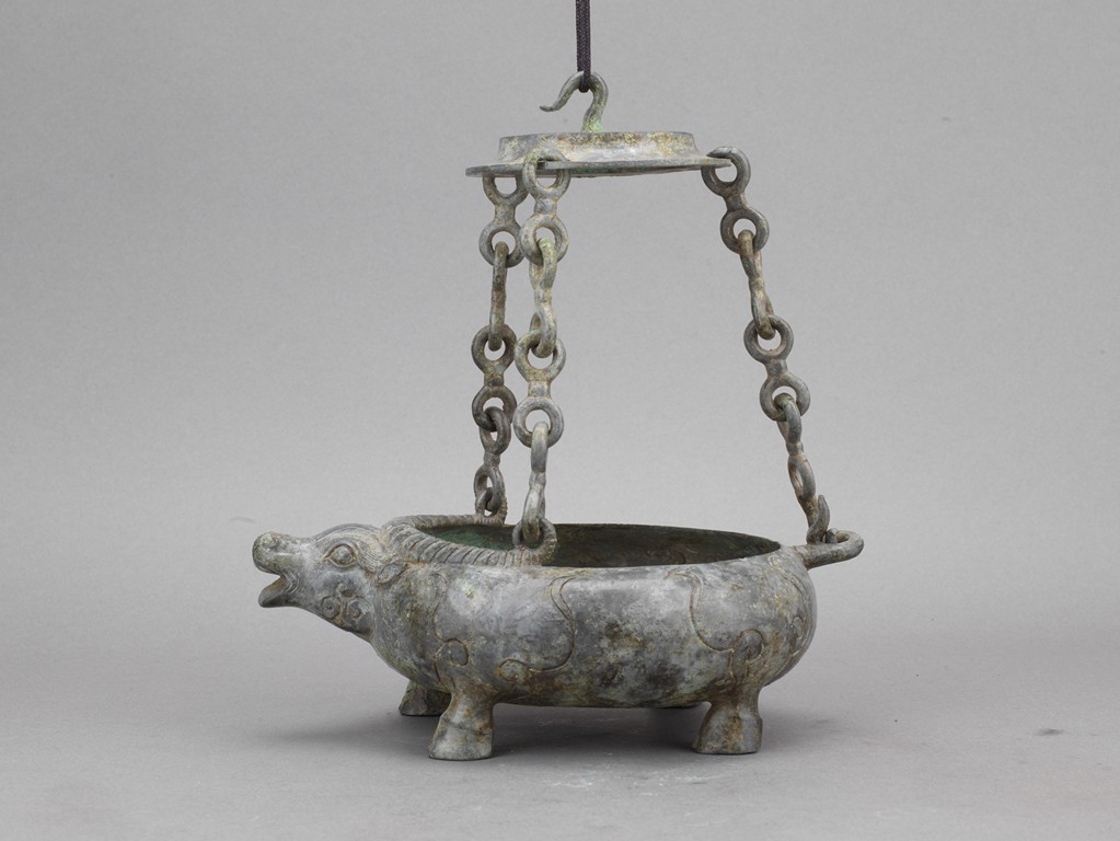 Provenance: Private collection, San Diego, California. Acquired between 1970s -1980s in Japan. 此燈青銅鑄造,體扁如缽,仿牛外形,前端有圓雕牛首,底部承四蹄足,後端有翹尾,腹部開大圓口,內可盛油置芯。兩牛角依口沿而施,末端有環,與尾環共連接三條索鏈,直繫蓋部。蓋隆平頂,上設掛鉤,使用時可勾繩懸掛。停用收陳時,可收鏈入腹,蓋扣口沿。牛大張的口目、螺旋肌理的雙角、厚實飽滿的蹄足,無不栩栩如生。漢代銅燈依功用可分行燭燈、座燈和藝術型燈,藝術型燈多擬動物、人物。來源:南加州聖地亞哥家族收藏,上世紀70-80 年代購於日本