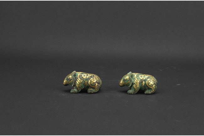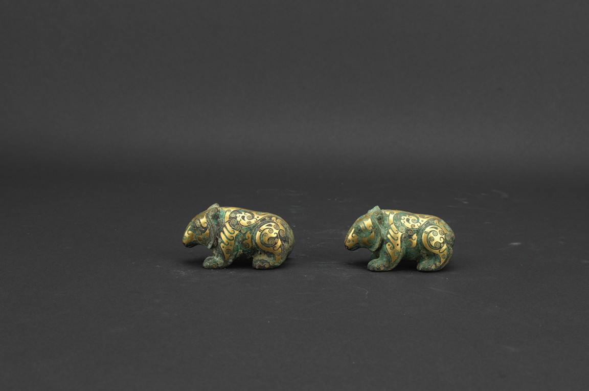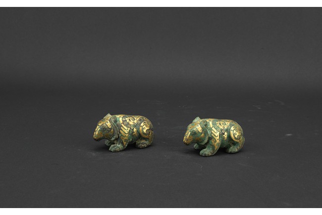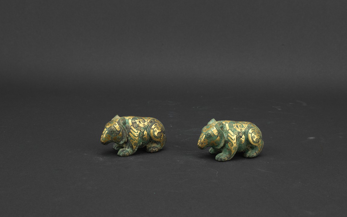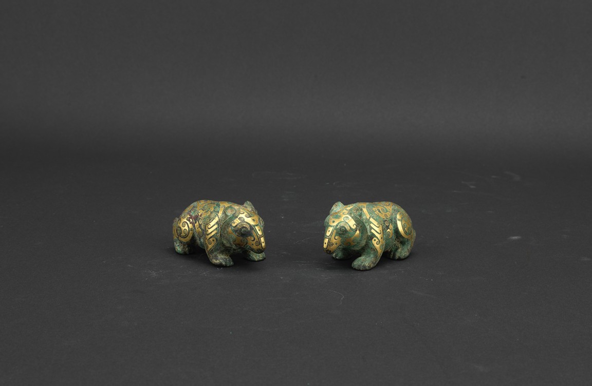Each bear shown standing foursquare, body outlined with gold inlaid decorations. Han Dynasty period.