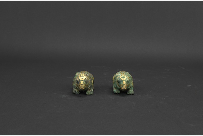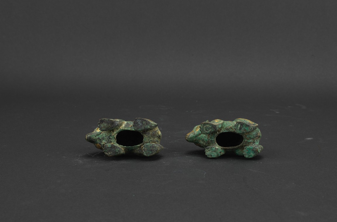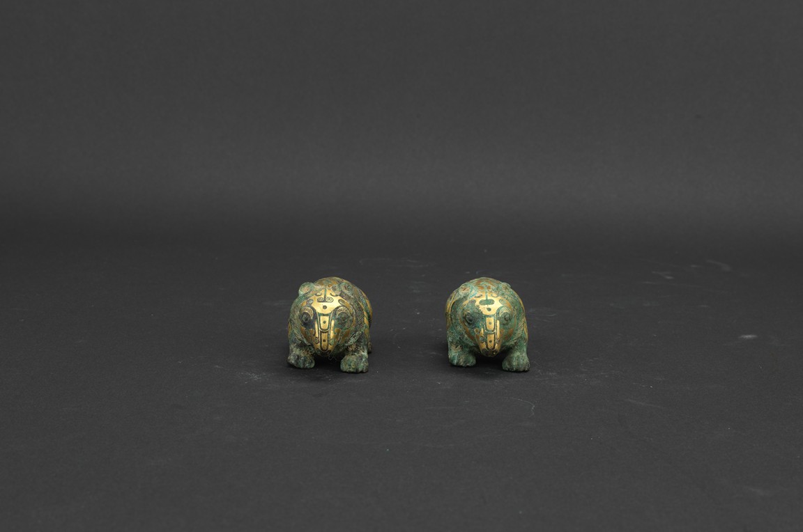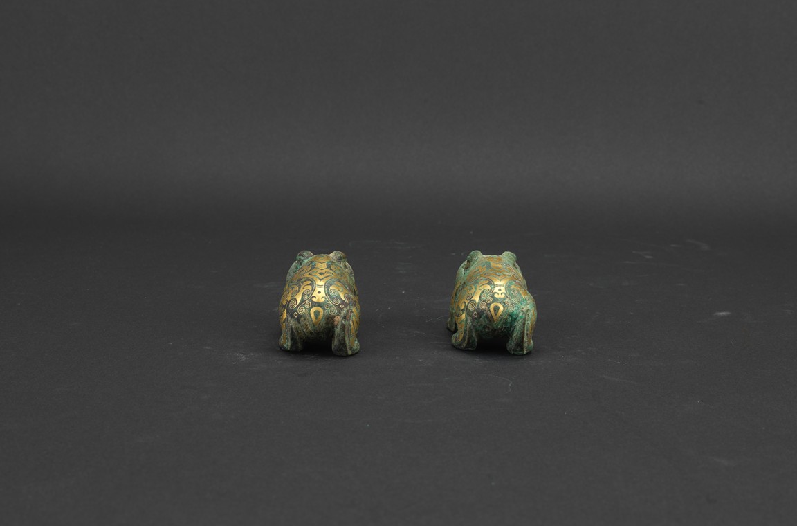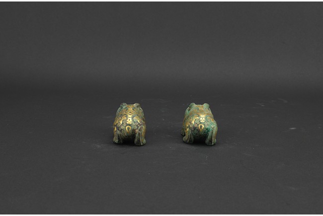 Each bear shown standing foursquare, body outlined with gold inlaid decorations. Han Dynasty period.