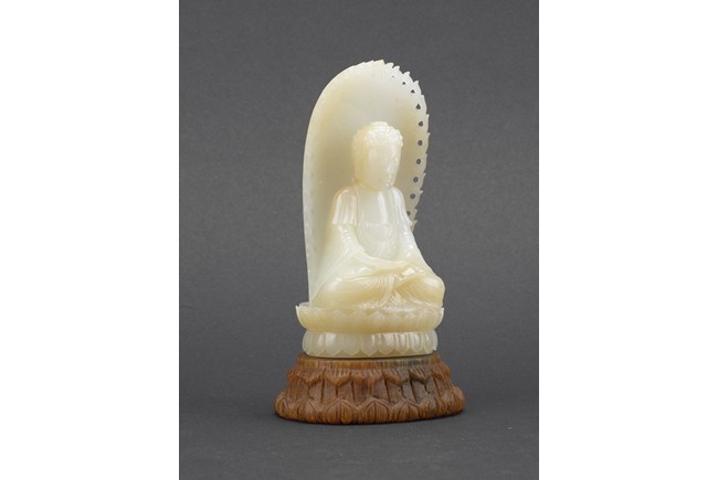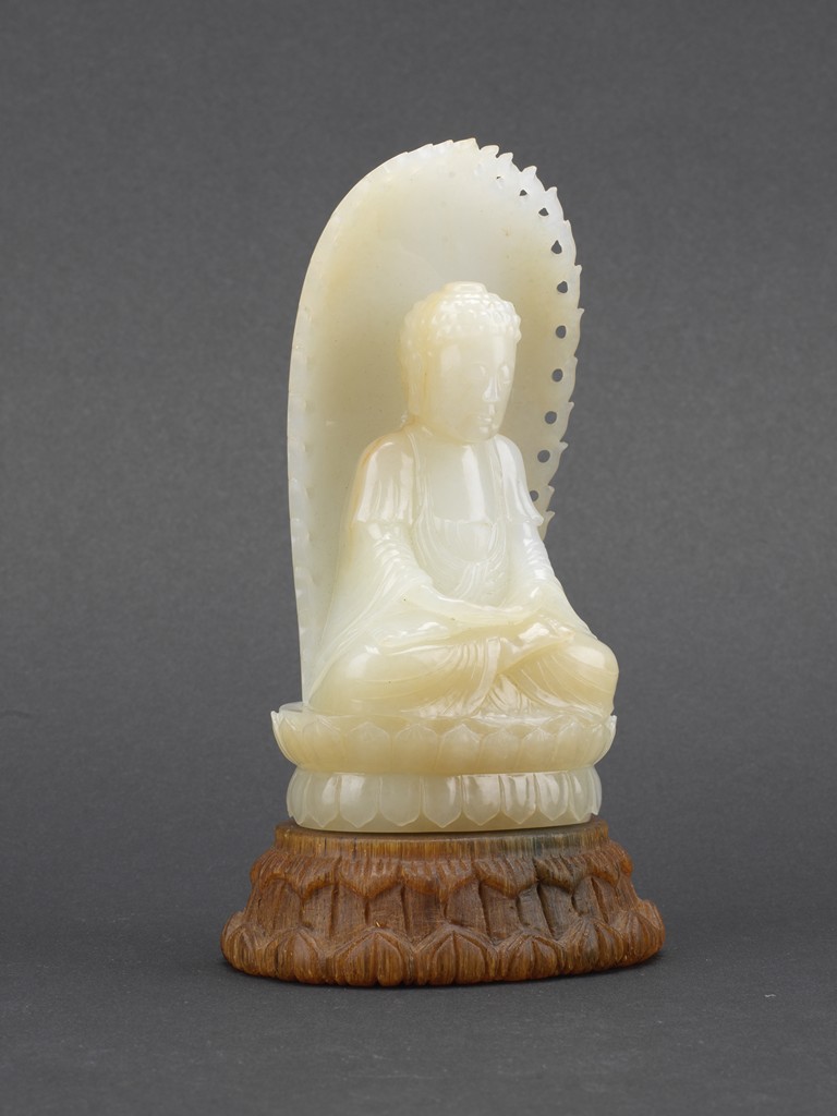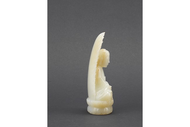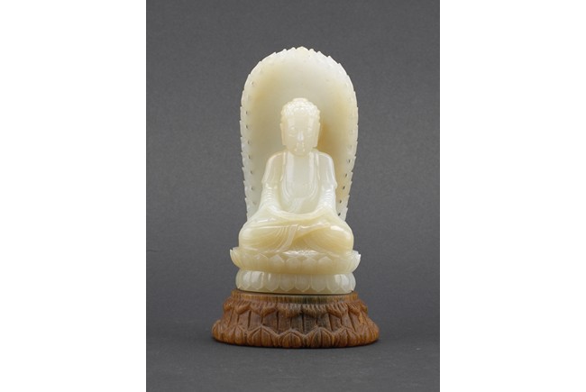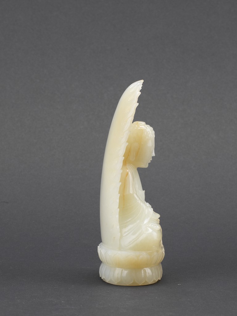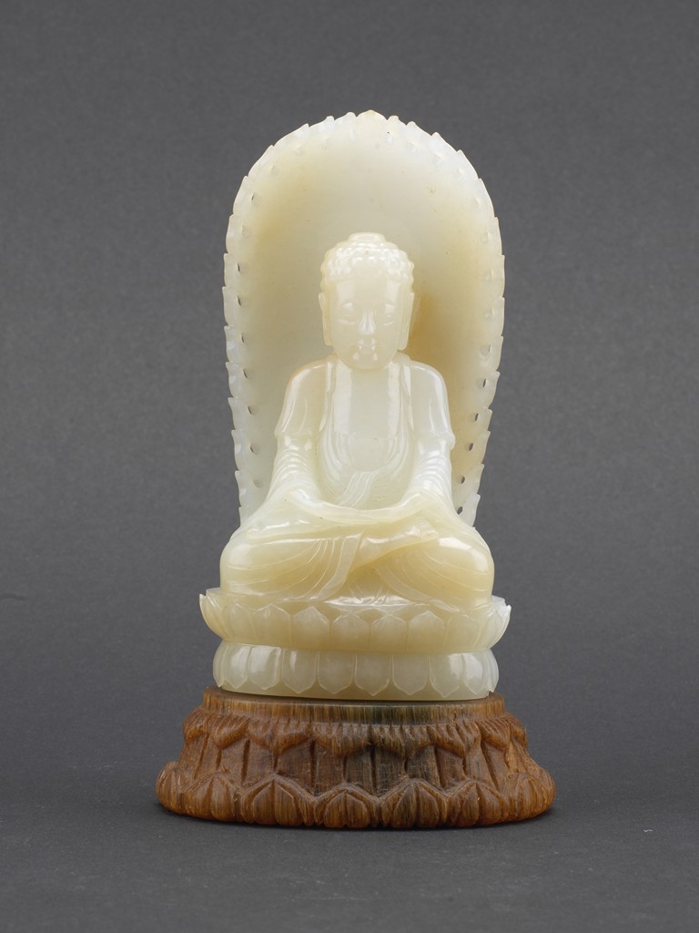 The white jade bodhisattva is shown seated upon double lotus throne with hands held together in front of belly, wearing flowing robe, face with serene expression, all backed by a large flaming back splat, and supported on a horn carved stand. Qing Dynasty period.