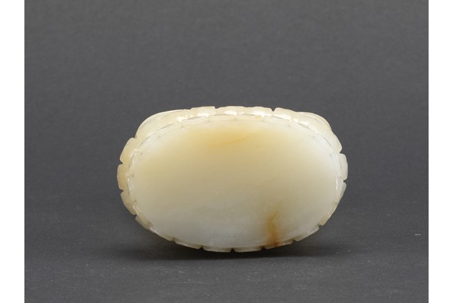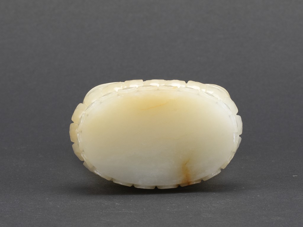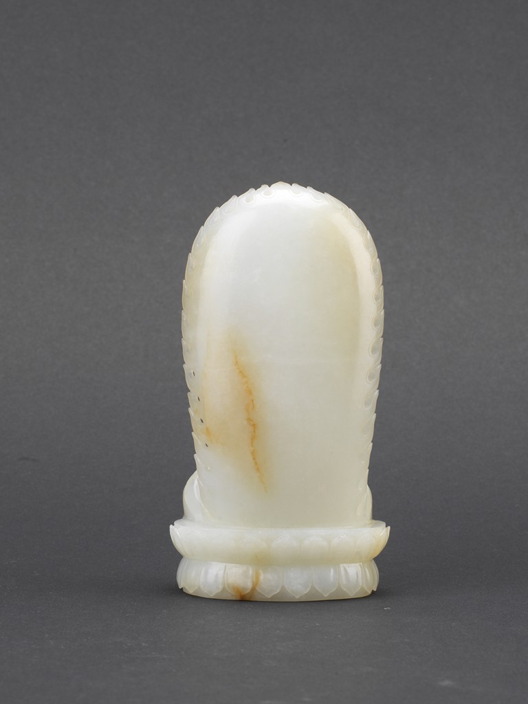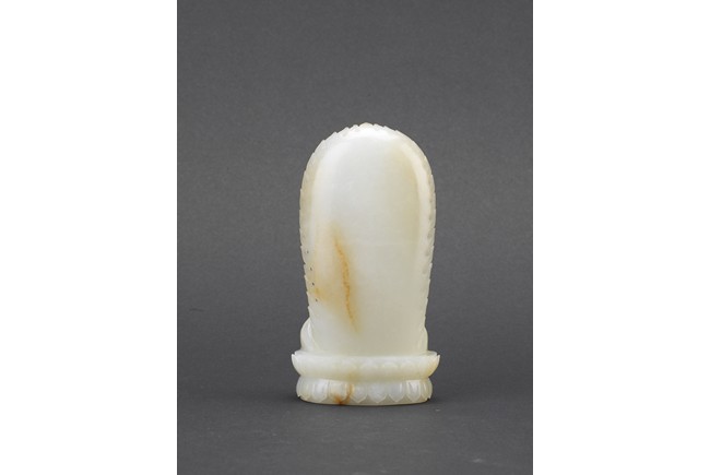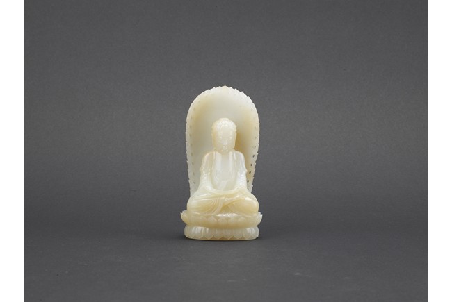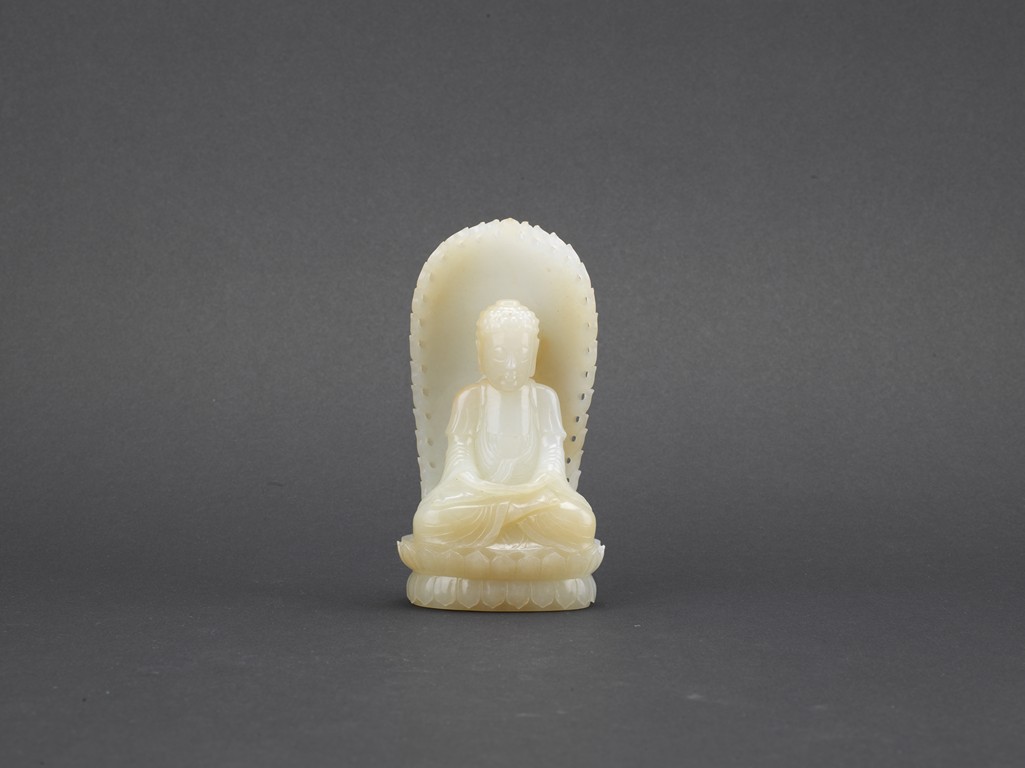 The white jade bodhisattva is shown seated upon double lotus throne with hands held together in front of belly, wearing flowing robe, face with serene expression, all backed by a large flaming back splat, and supported on a horn carved stand. Qing Dynasty period.