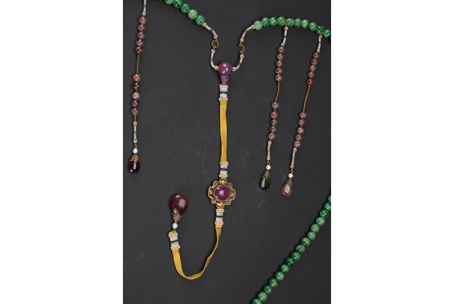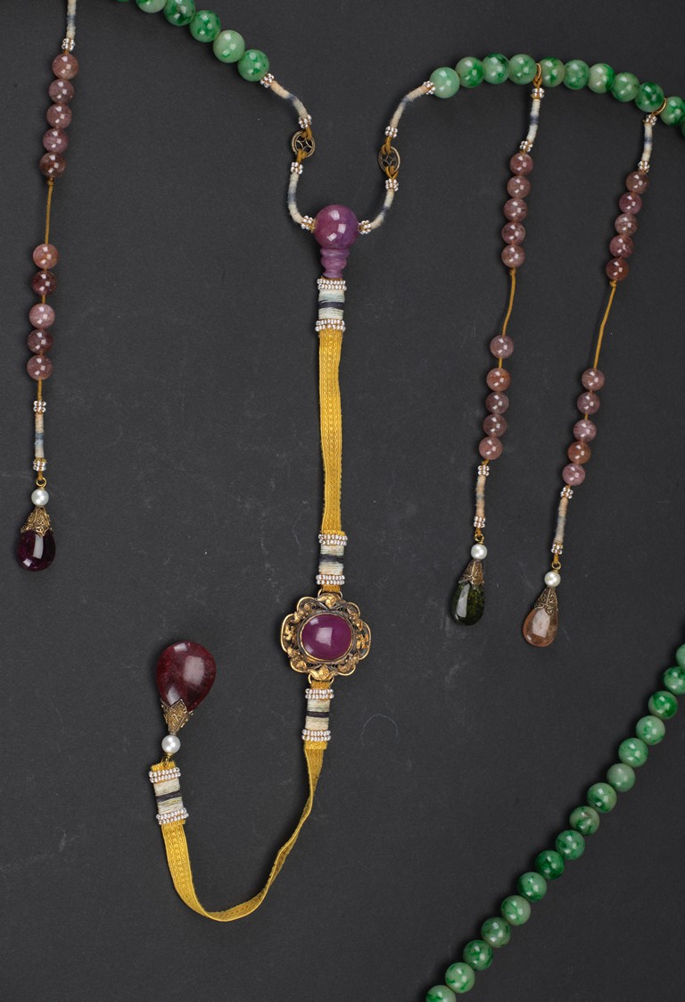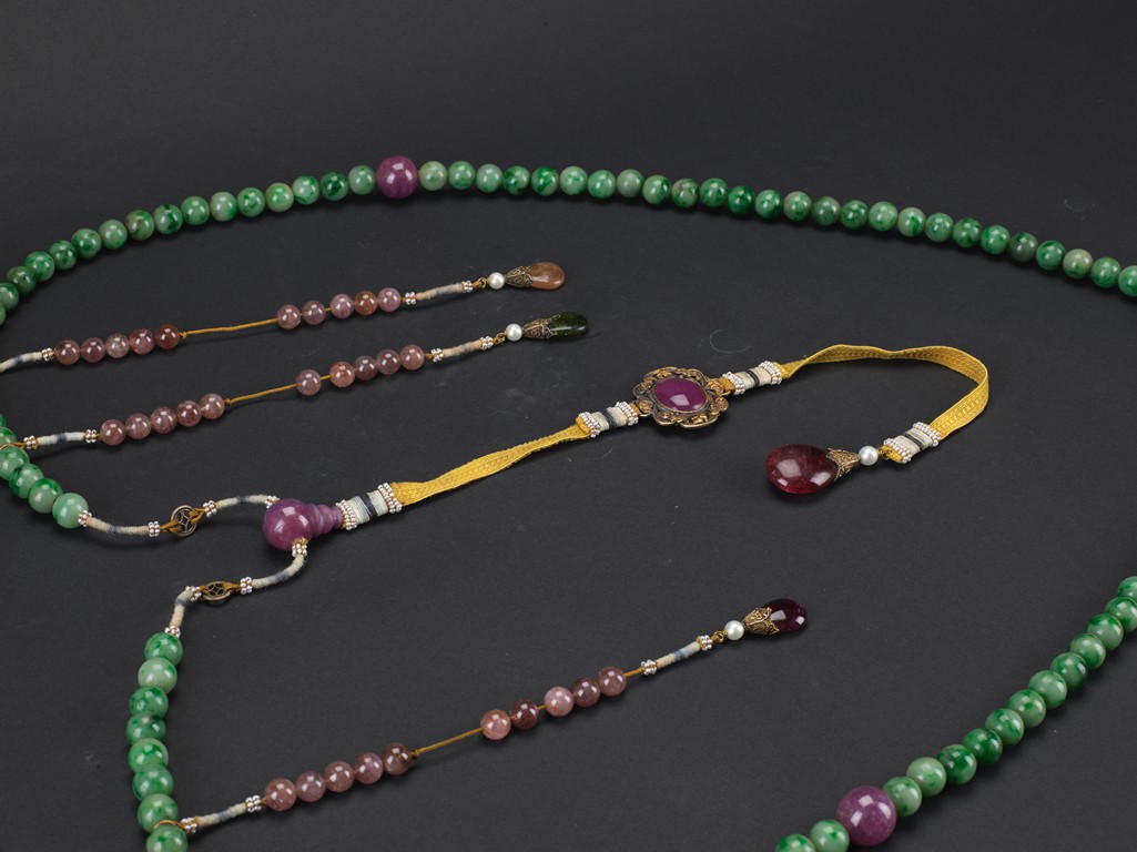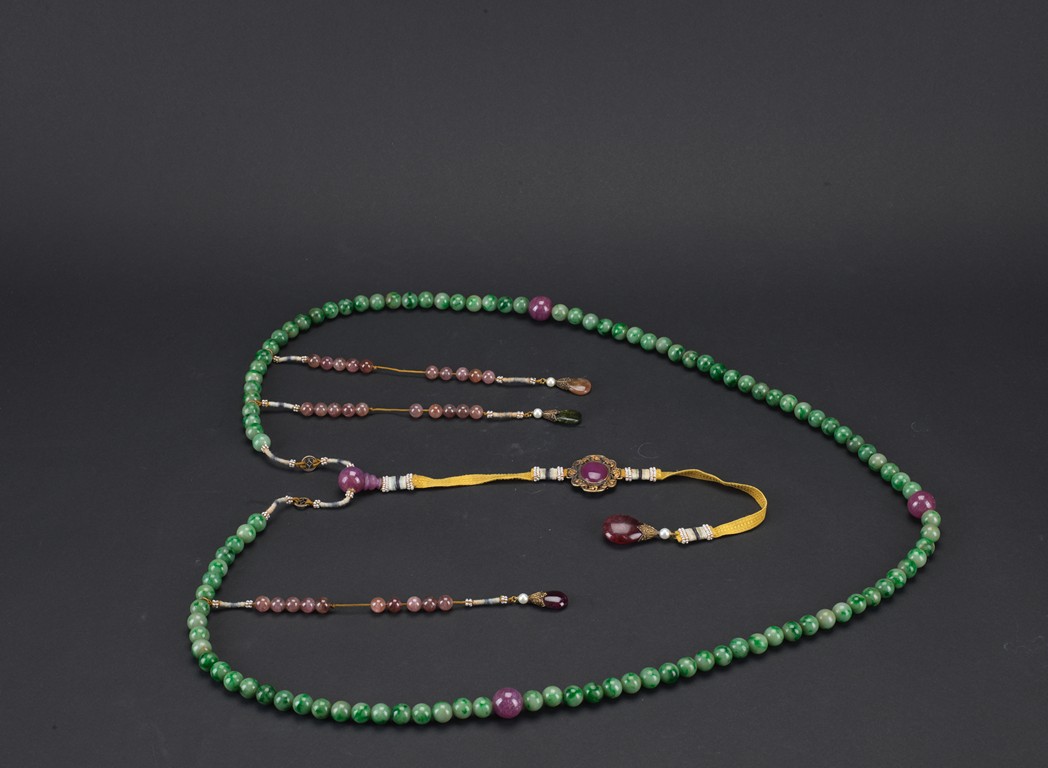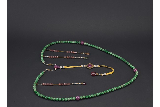 此套朝珠由上等翡翠製成,由108粒翡翠珠貫穿而成,每隔27粒穿入一顆粉碧璽珠,其直徑比朝珠大一倍左右,將朝珠一分為四,寓意四季輪轉。朝珠頂設“佛頭塔”,其後用黃色闊絲帶系墜子,末端系寶石,是為“背雲”,“佛頭塔”兩側有三串小珠,每串小珠十粒,名為“紀念”。朝珠是清朝禮服的一種佩戴物,掛在頸項垂於胸前。由於清代皇帝信佛教,凡皇帝、後妃、文官五品及武官四品以上另外侍衛和京官等,均可佩戴朝珠,作為皇帝所賞賜之珍品。
