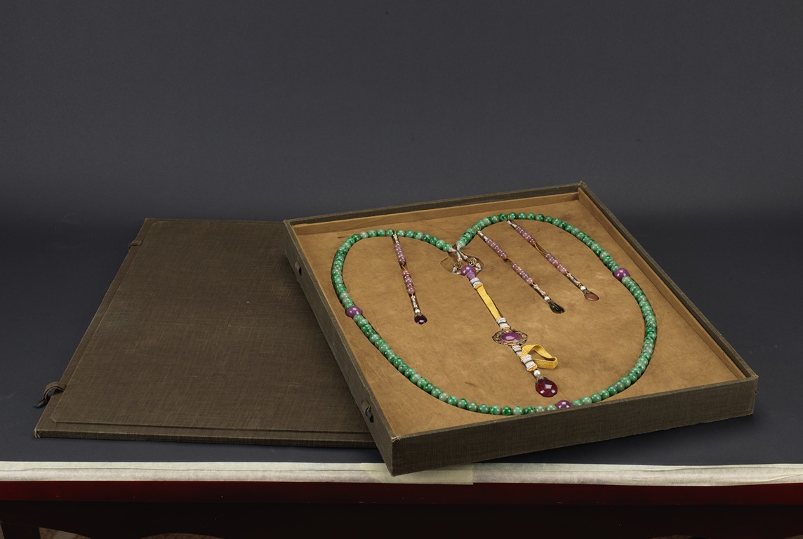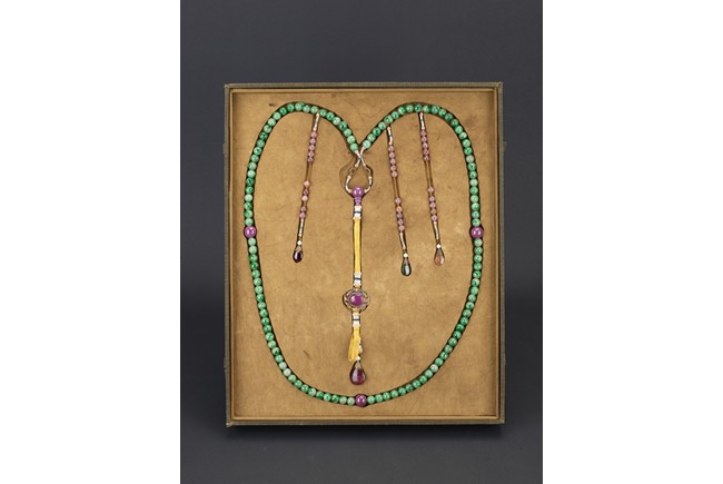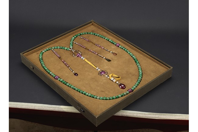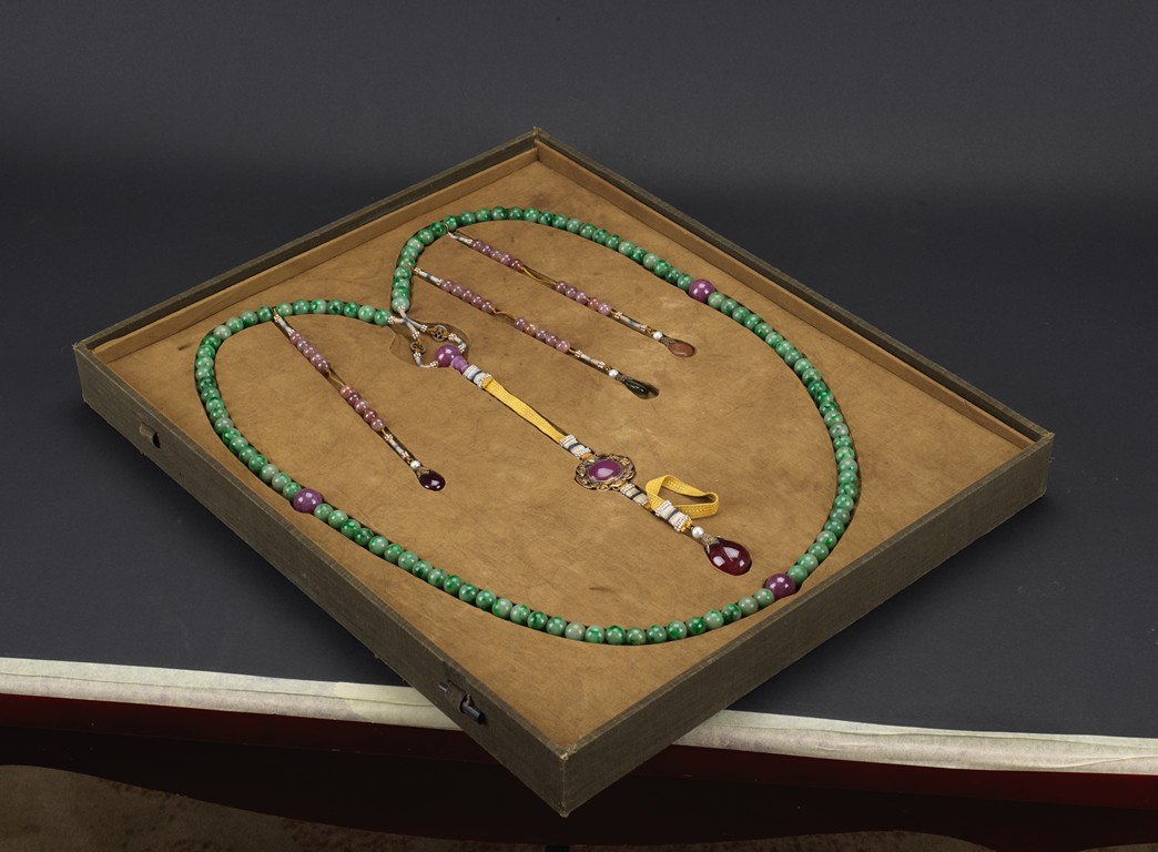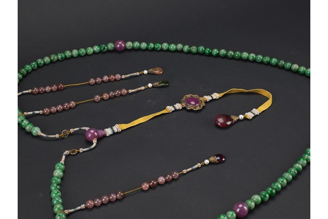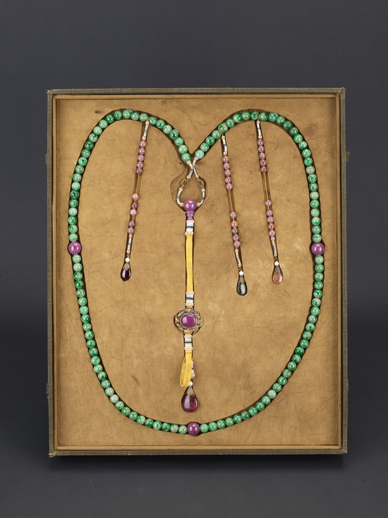 此套朝珠由上等翡翠製成,由108粒翡翠珠貫穿而成,每隔27粒穿入一顆粉碧璽珠,其直徑比朝珠大一倍左右,將朝珠一分為四,寓意四季輪轉。朝珠頂設“佛頭塔”,其後用黃色闊絲帶系墜子,末端系寶石,是為“背雲”,“佛頭塔”兩側有三串小珠,每串小珠十粒,名為“紀念”。朝珠是清朝禮服的一種佩戴物,掛在頸項垂於胸前。由於清代皇帝信佛教,凡皇帝、後妃、文官五品及武官四品以上另外侍衛和京官等,均可佩戴朝珠,作為皇帝所賞賜之珍品。