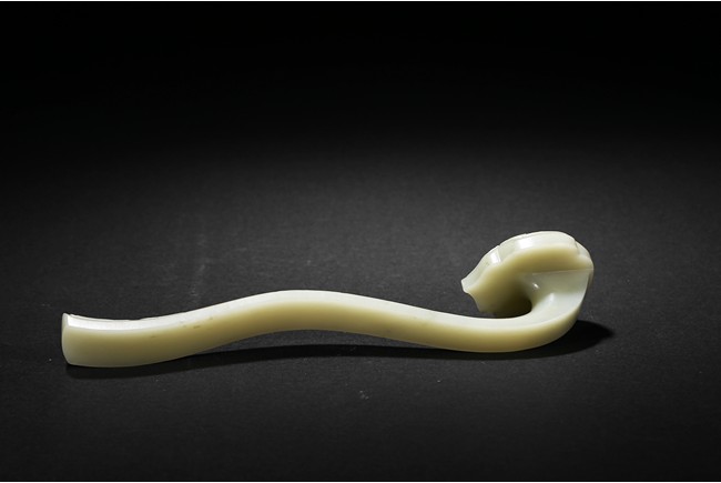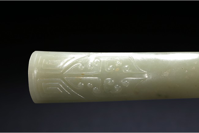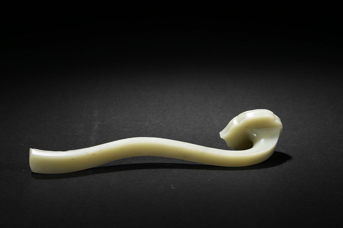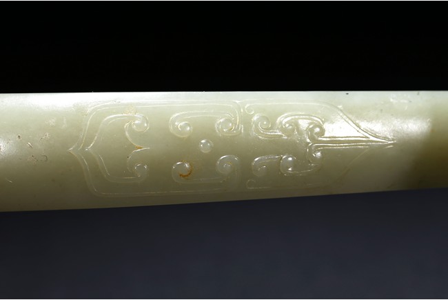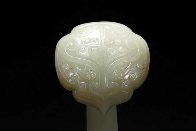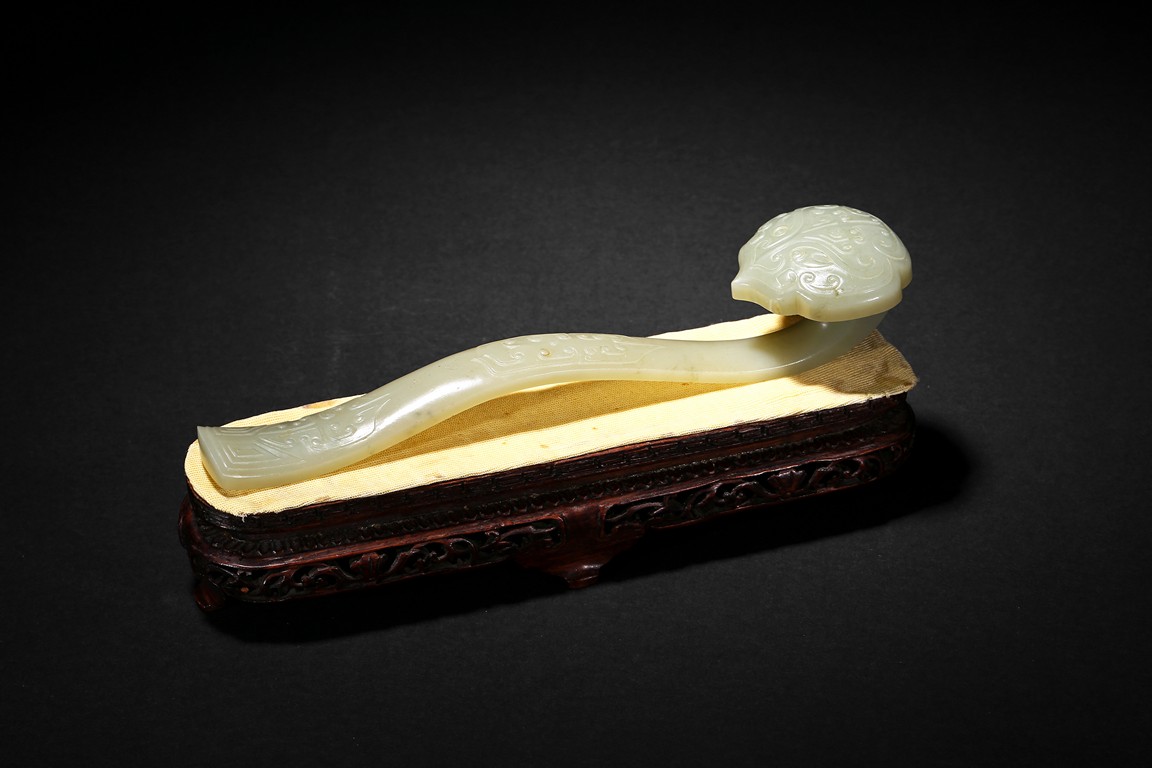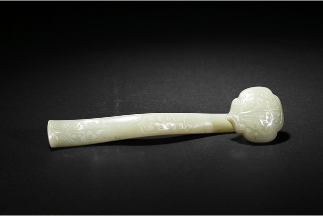 The ruyi-shaped terminal carved in low relief with stylized archaistic pattern, the arched shaft and end decorated with similar pattern, all supported on a wood stand. Qing Dynasty period.