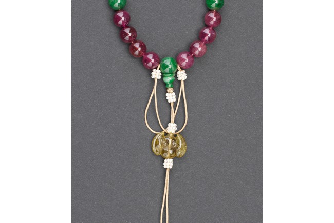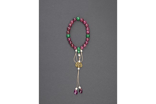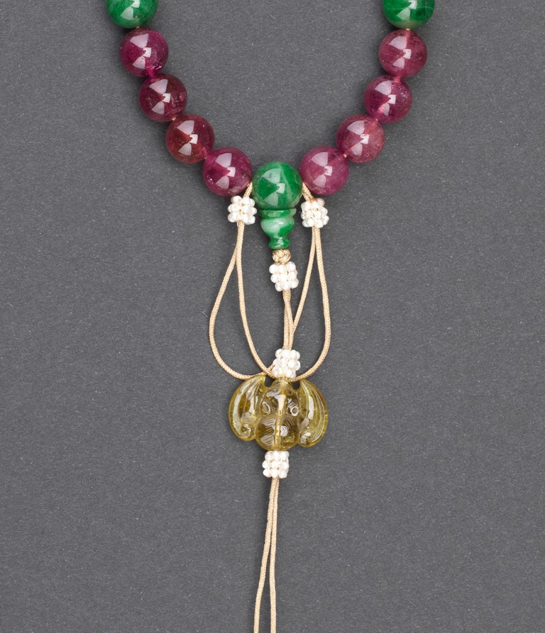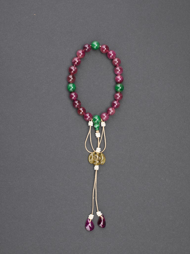 The bracelet comprises eighteen pink tourmaline beads, evenly divided by a green jadeite bead and a double-gourd jadeite bead suspending a butterfly shaped toggle and finally terminating in two smaller tourmaline pebbles. Qing Dynasty period.