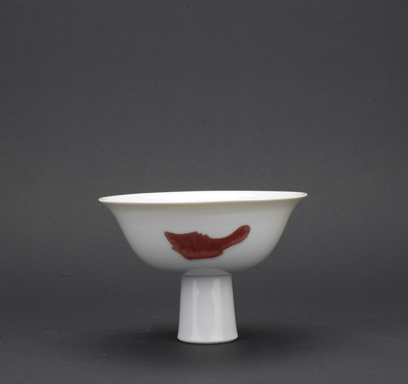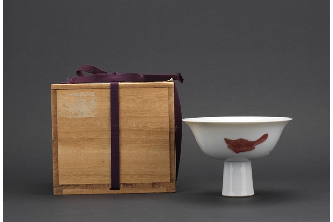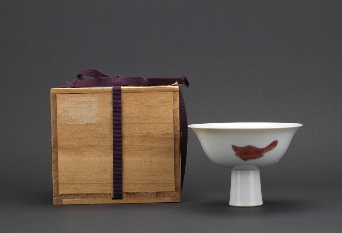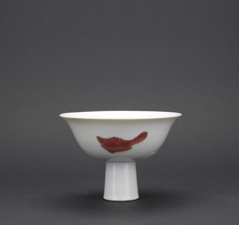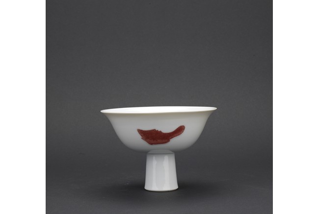 The shallow bowl with flared rim supported on a hollow slightly tapered stem, decorated on the exterior in underglaze-red with three fish, six-character Yongzheng mark in underglaze-blue inside the foot. Qing Dynasty Yongzheng period.