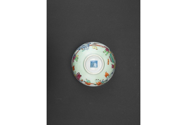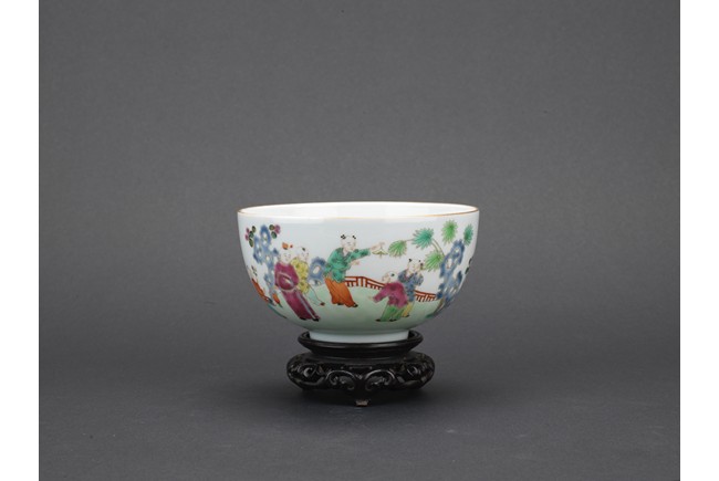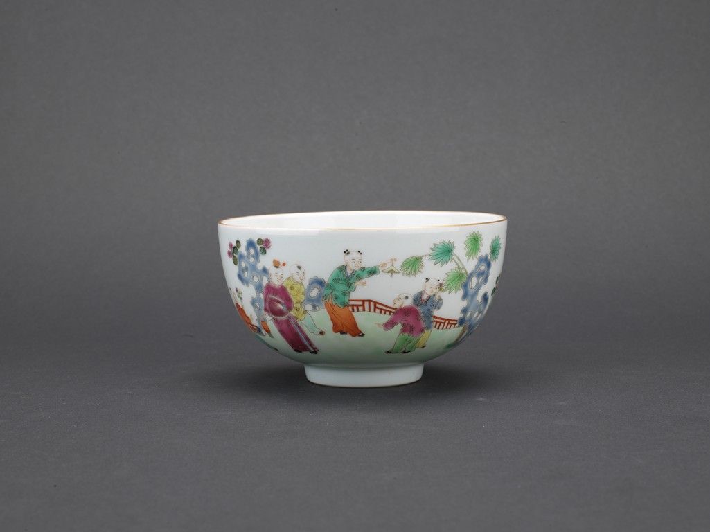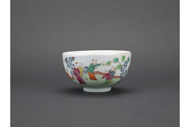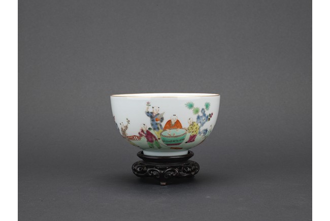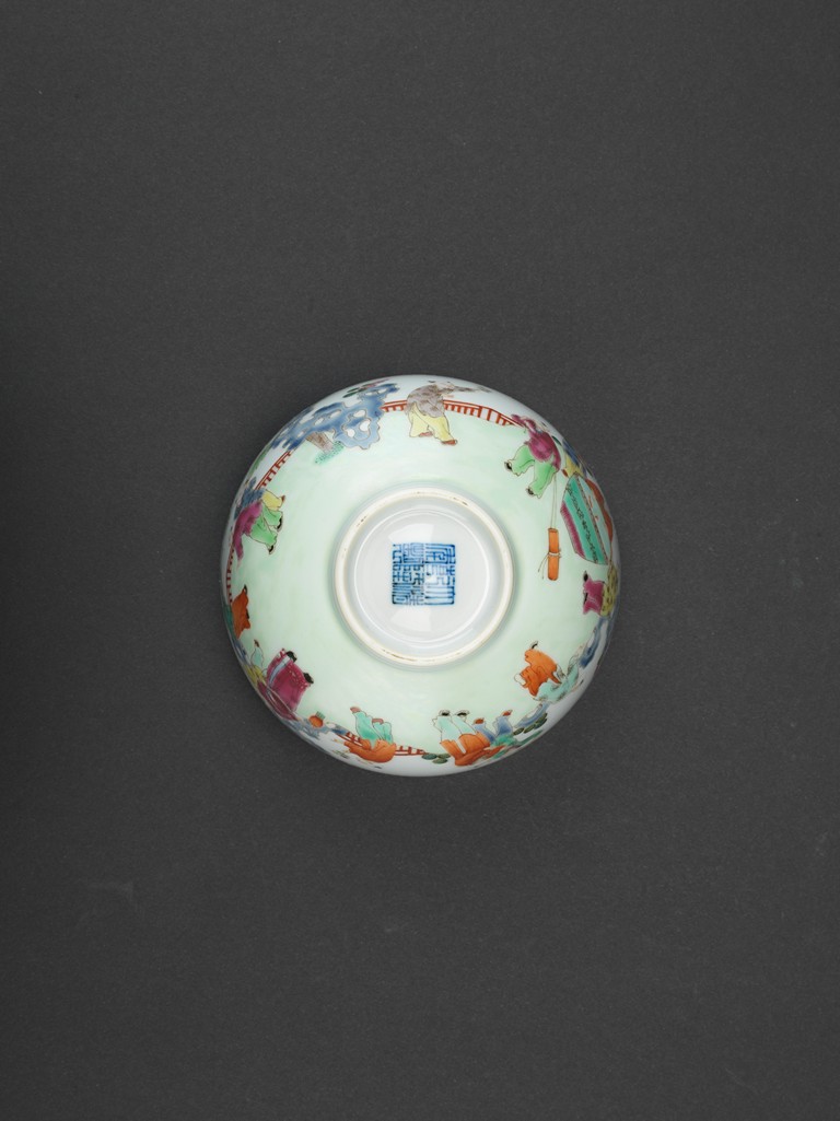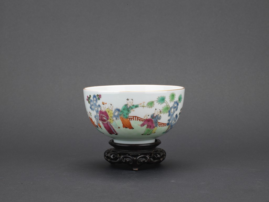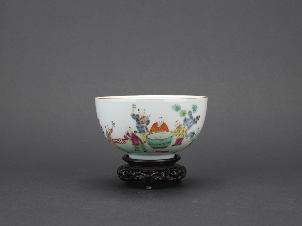 Of deep rounded sides, the exterior finely enamelled with a continuous scene of boys playing in a garden setting, base inscribed with six character Qianlong mark. Qing Dynasty period.