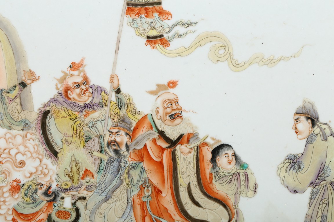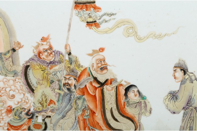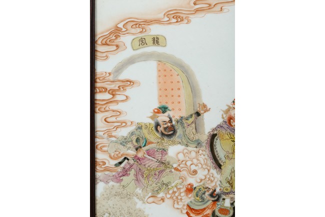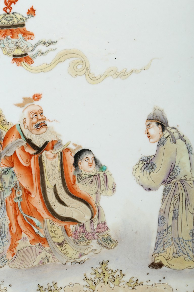 The rectangular panel finely painted to depict a story scene involving the dragon king of the sea emerging from the sea to visit a man on earth, the upper right with inscription and one seal mark. Republic period.