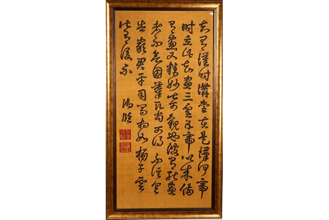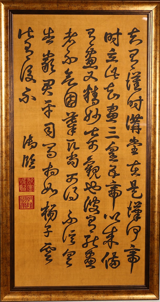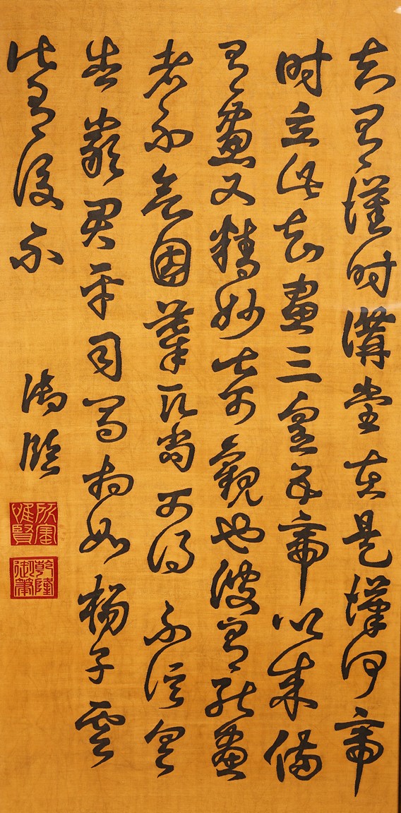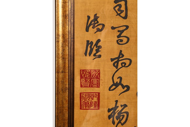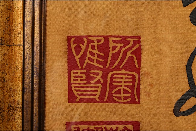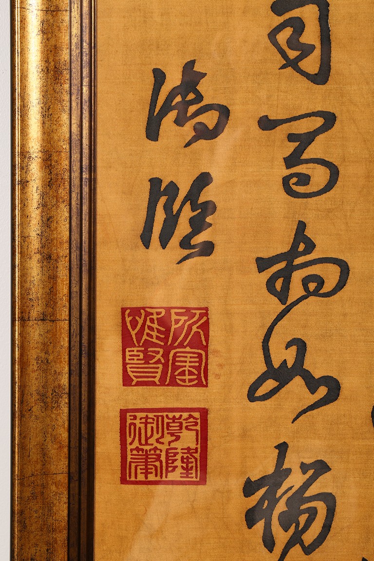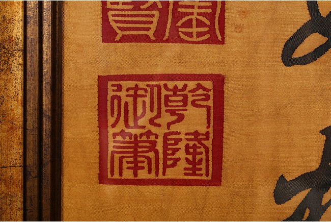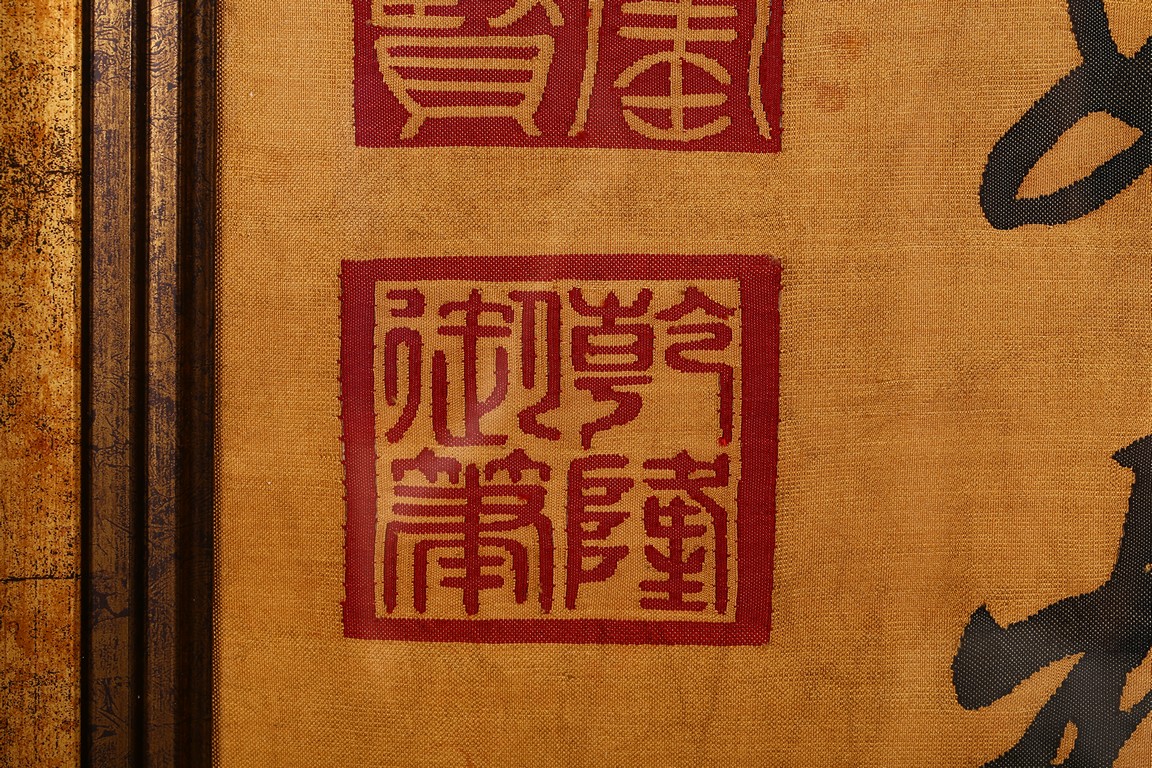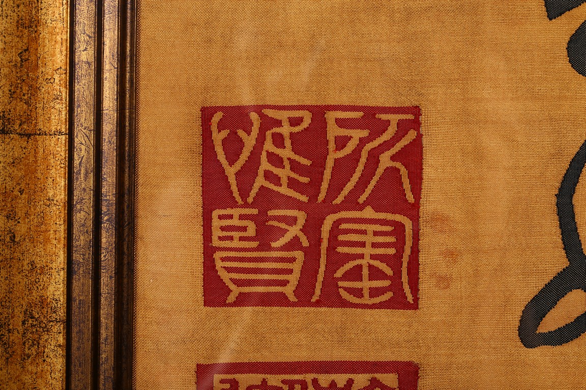 Silk and mounted, with running script calligraphy woven in kesi technique in black silk on yellow ground, with two woven seal marks. Qing Dynasty period.