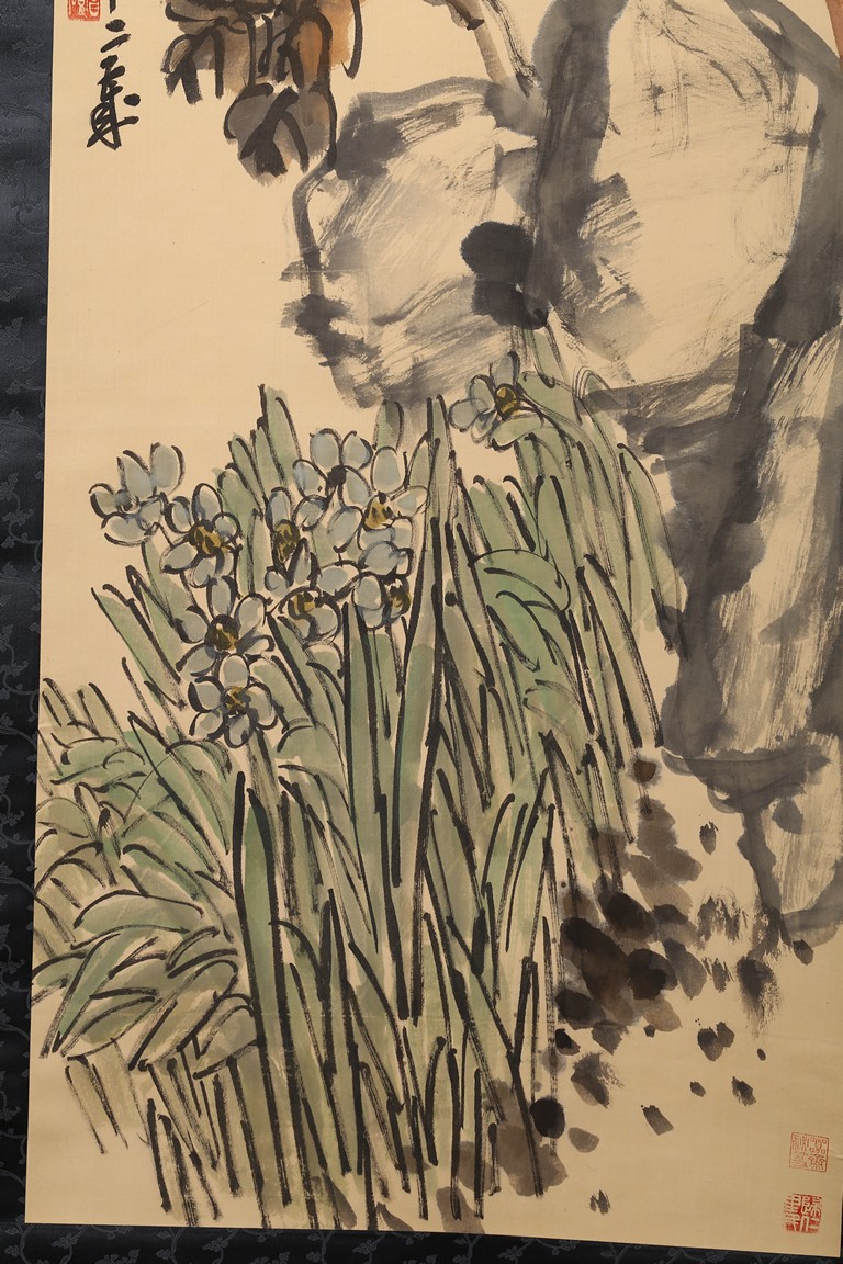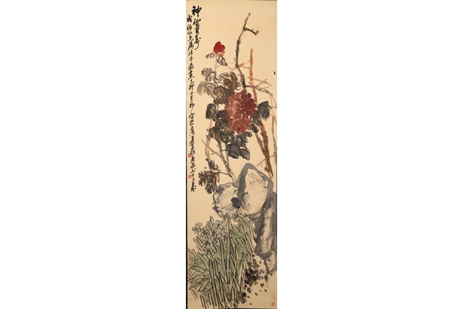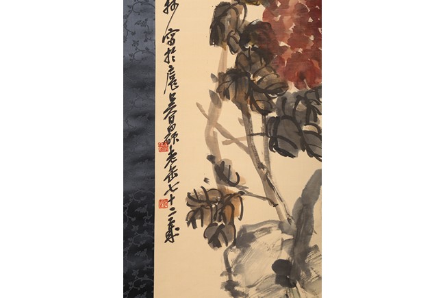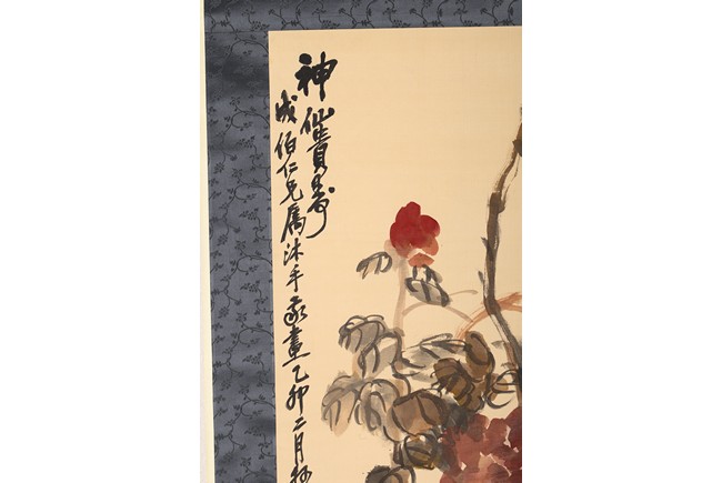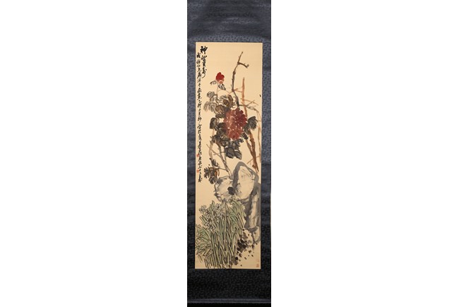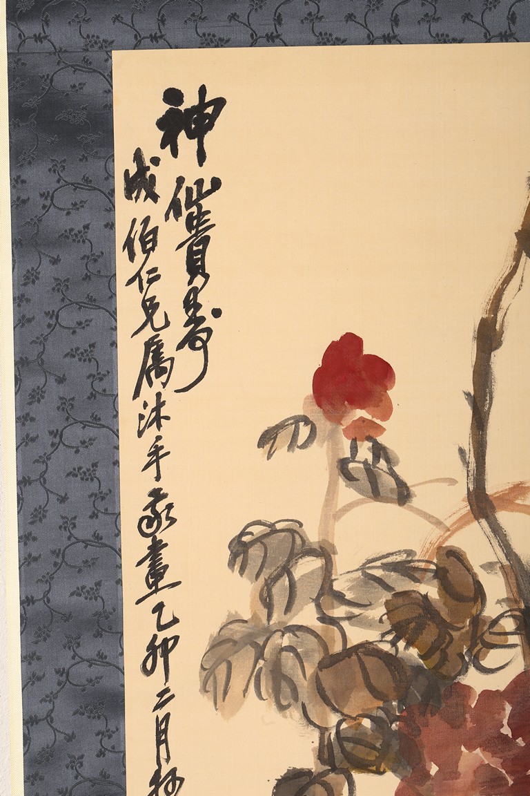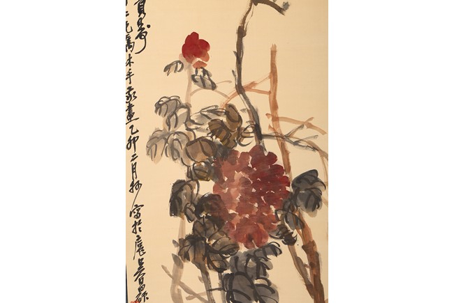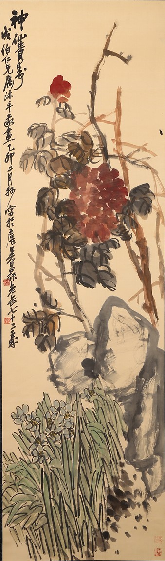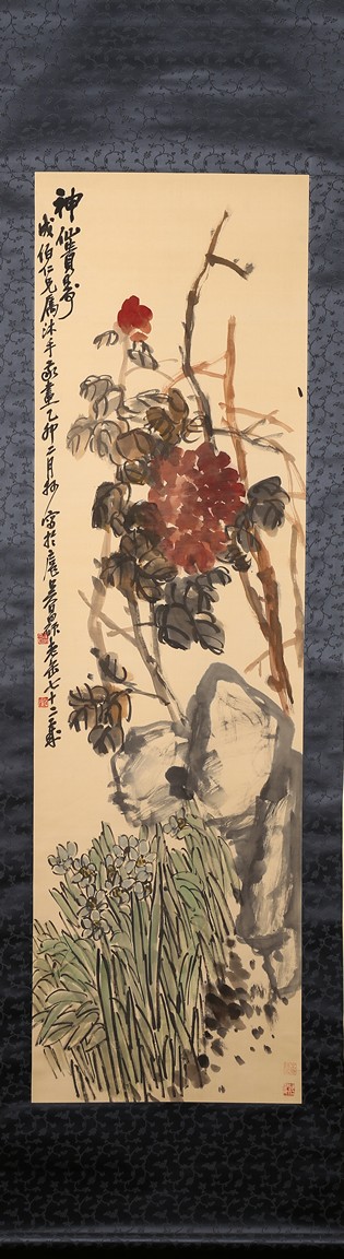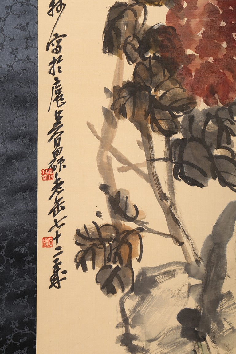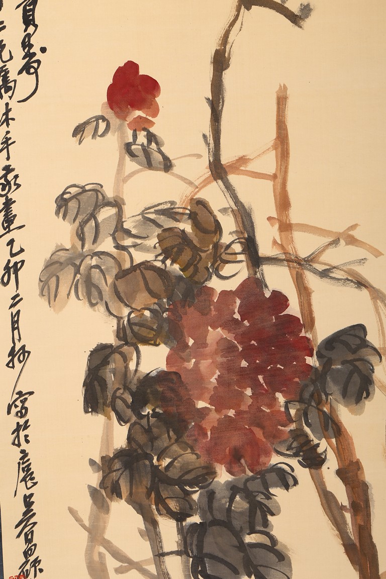 Color and ink on silk. Flower. Hanging scroll. Inscribed and signed Wu Changshuo, dated to the year of 1916, with four seals of the artist.