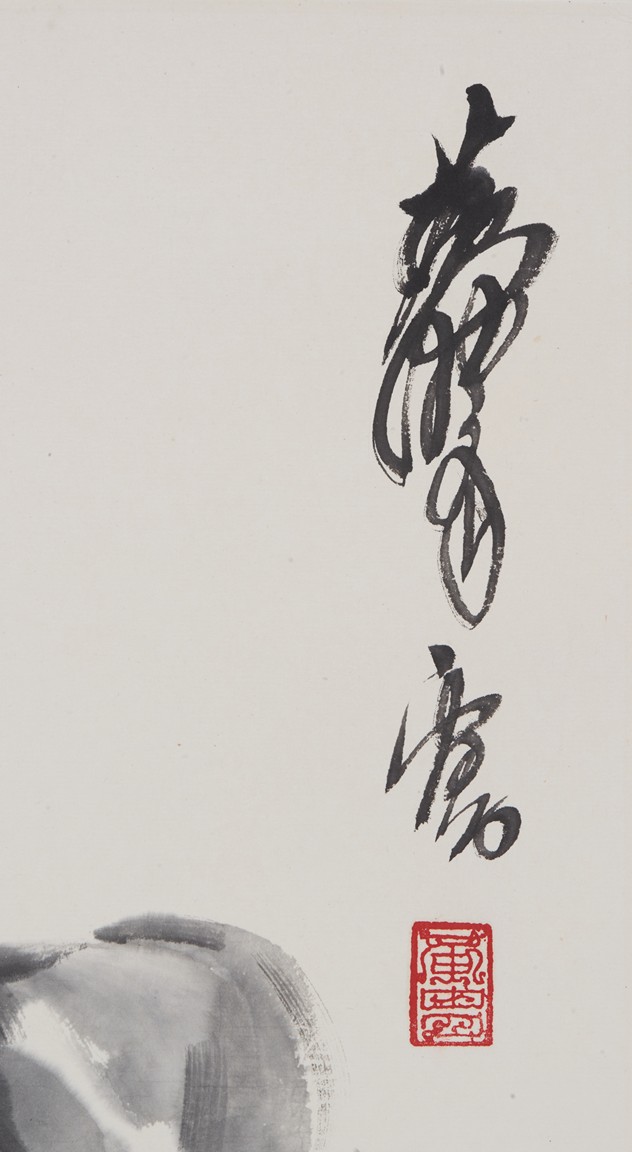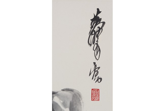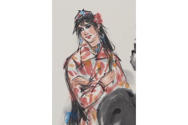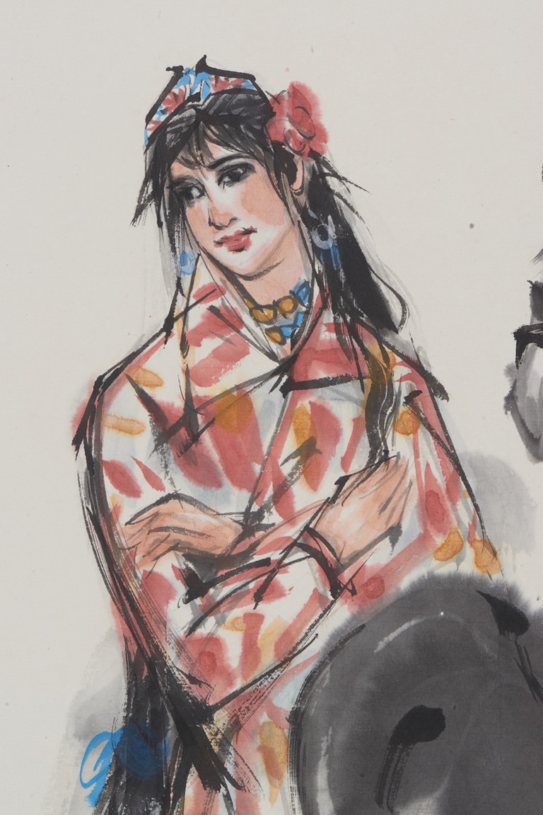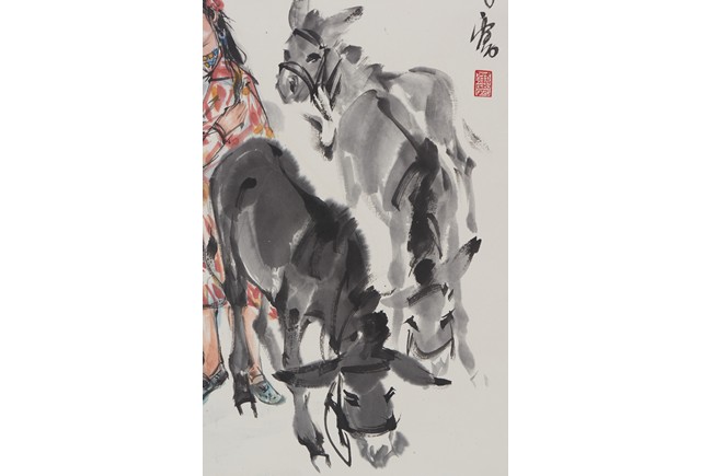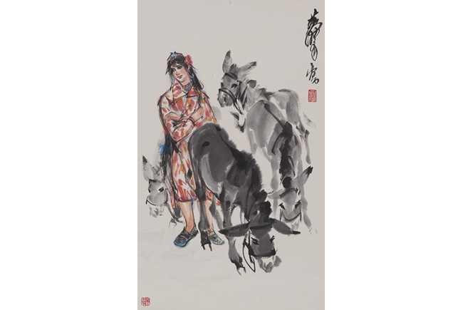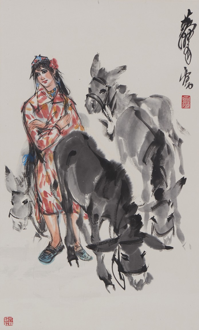 Color and ink on paper. lady and donkey. Hanging scroll. Signed Huang Zhou, with two seals of the artist.