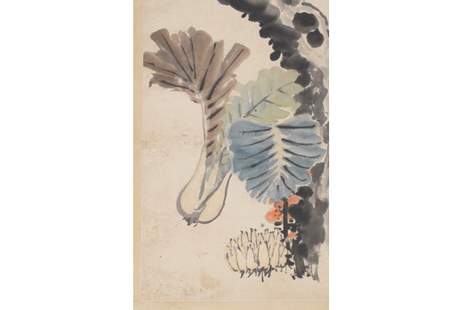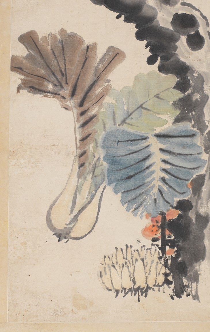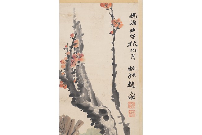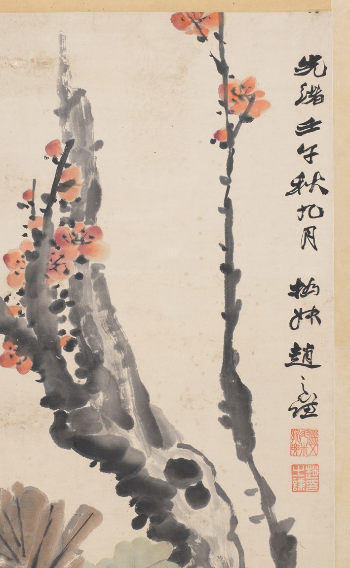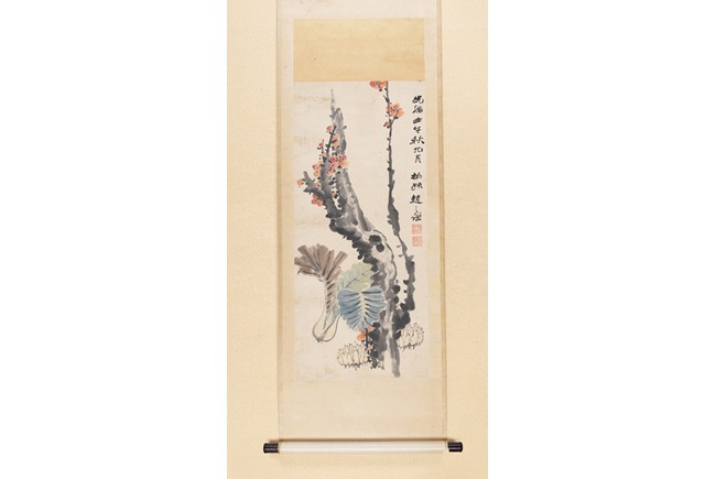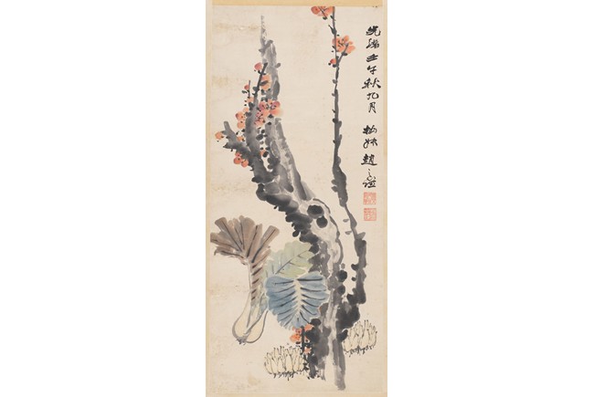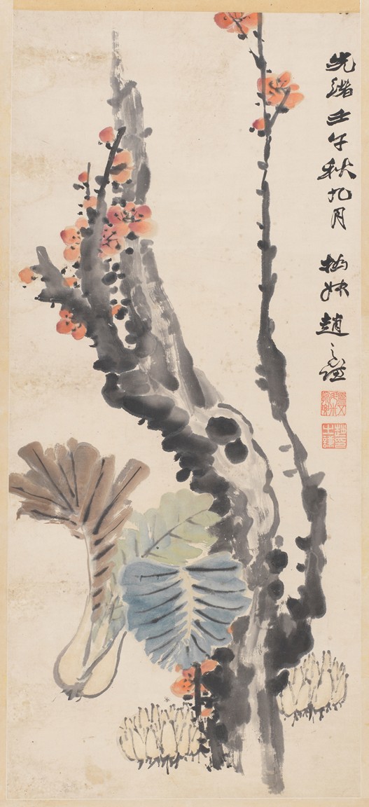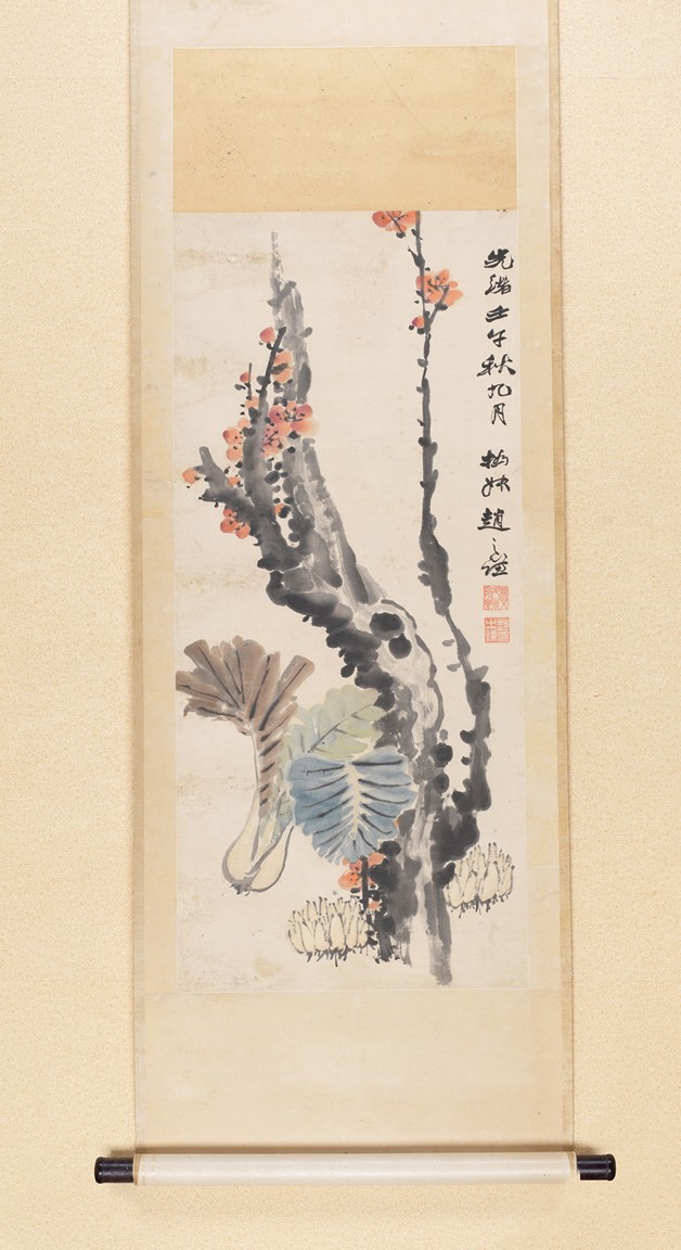 Color and ink on paper. Plum Blossom and Cabbage. Hanging scroll. Inscribed and signed Zhao Zhiqian, with two seals of the artist.