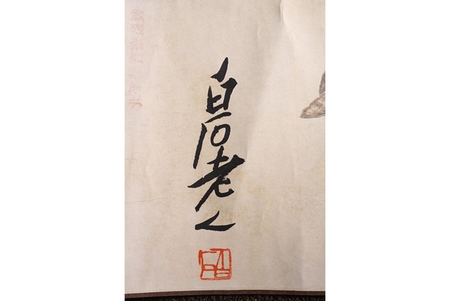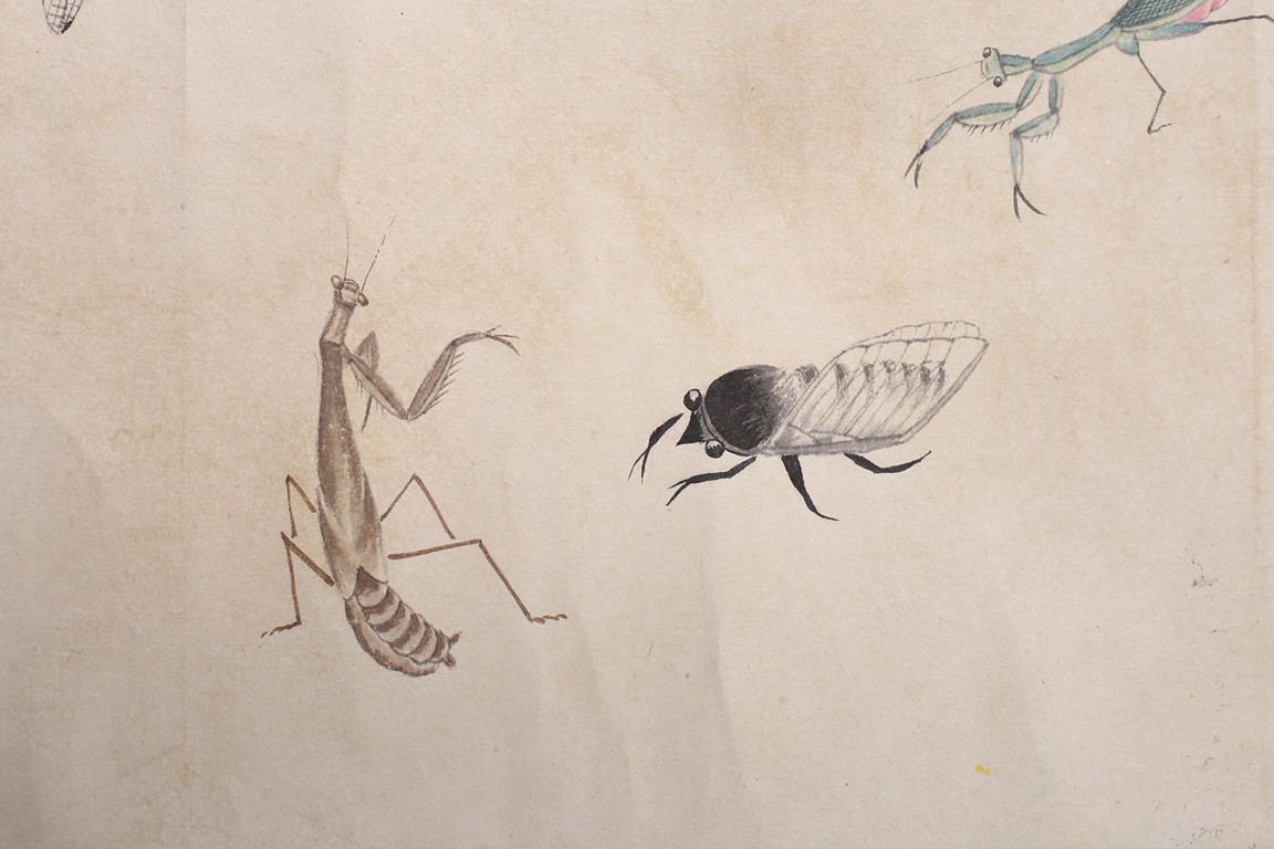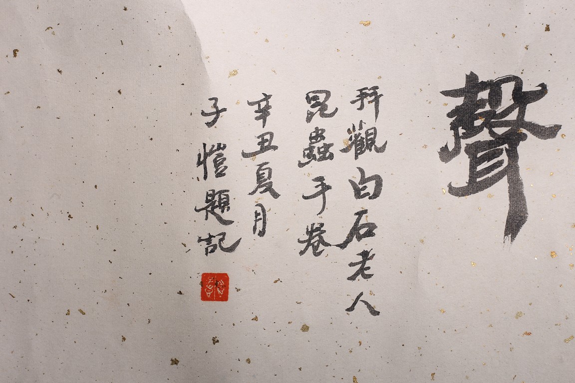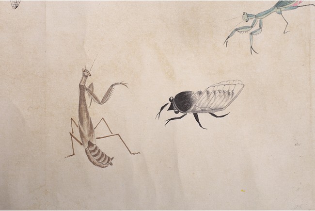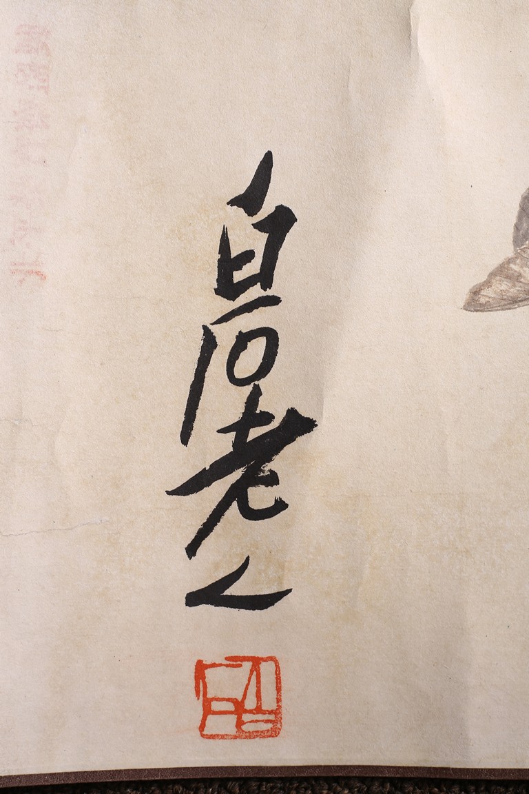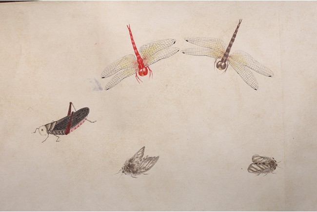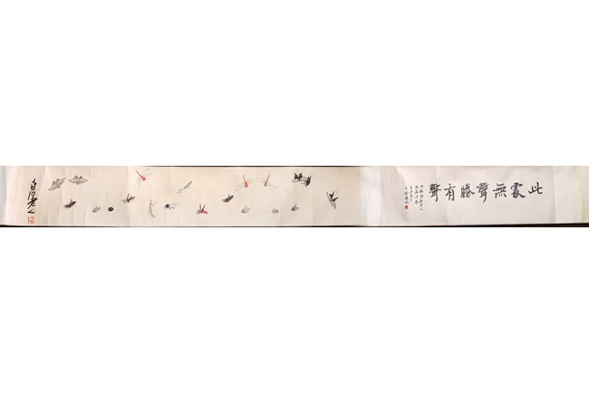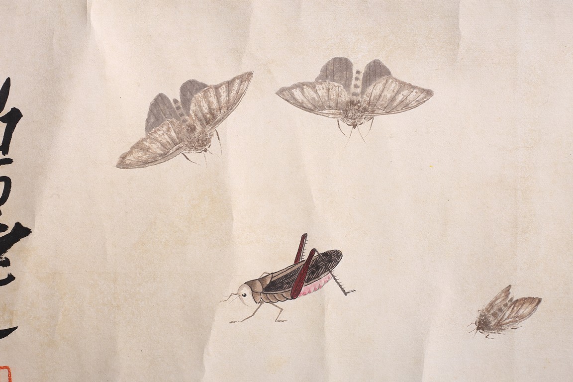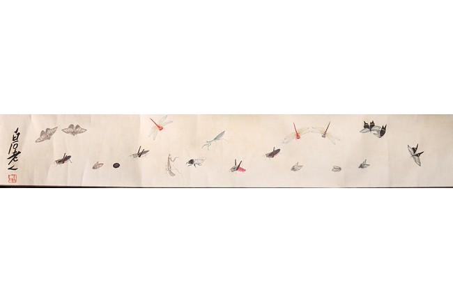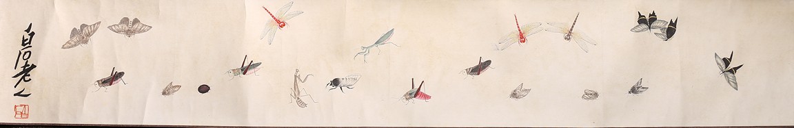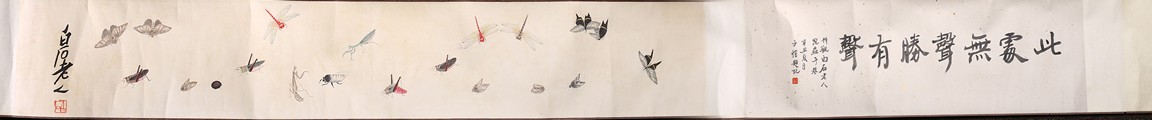 Color and ink on paper. Insects. Handscroll. Signed Bai Shi Lao Ren and with one seal of the artist. with titleslip signed Feng zikai, and frontispiece inscribed Feng Zikai, with two seals of his.