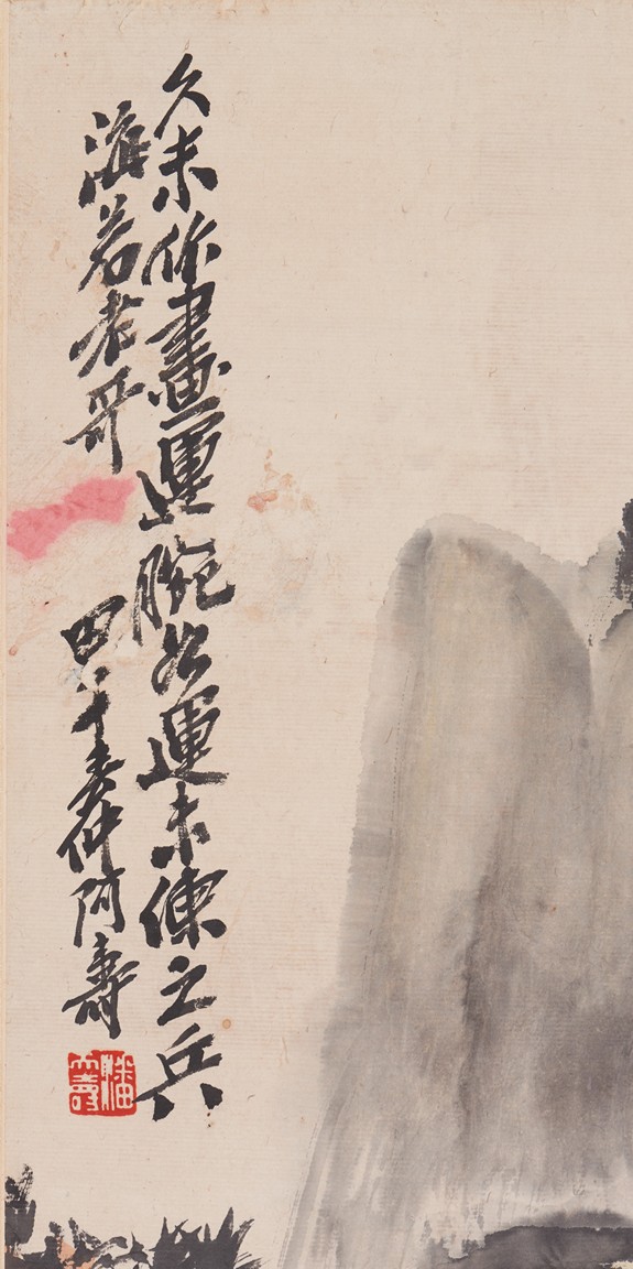 Color and ink on paper. Landscape. Inscribed and signed A Shou, with one seal of the artist.