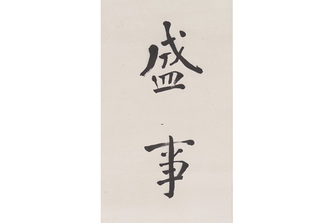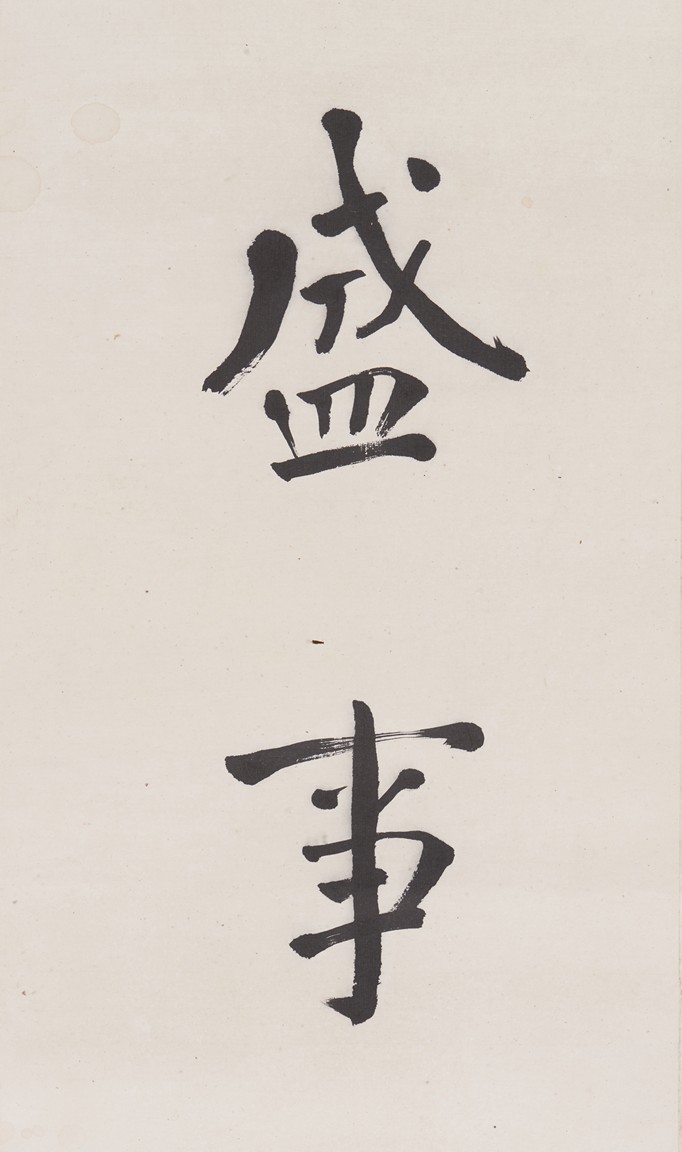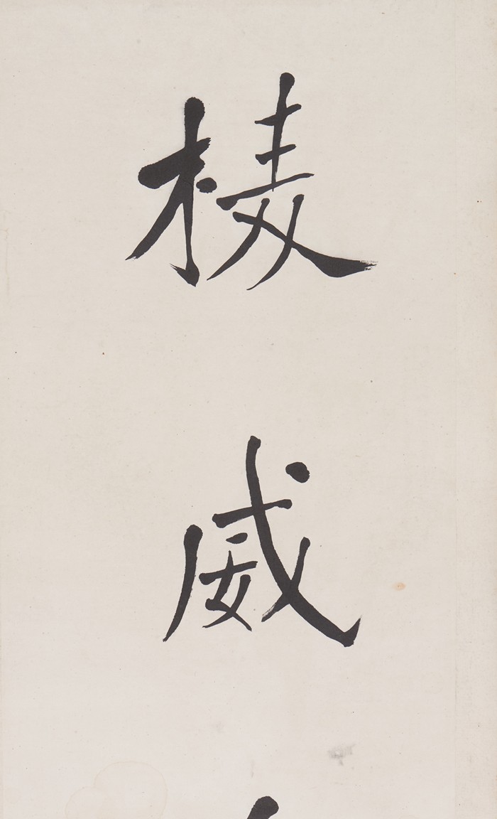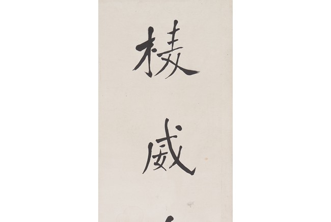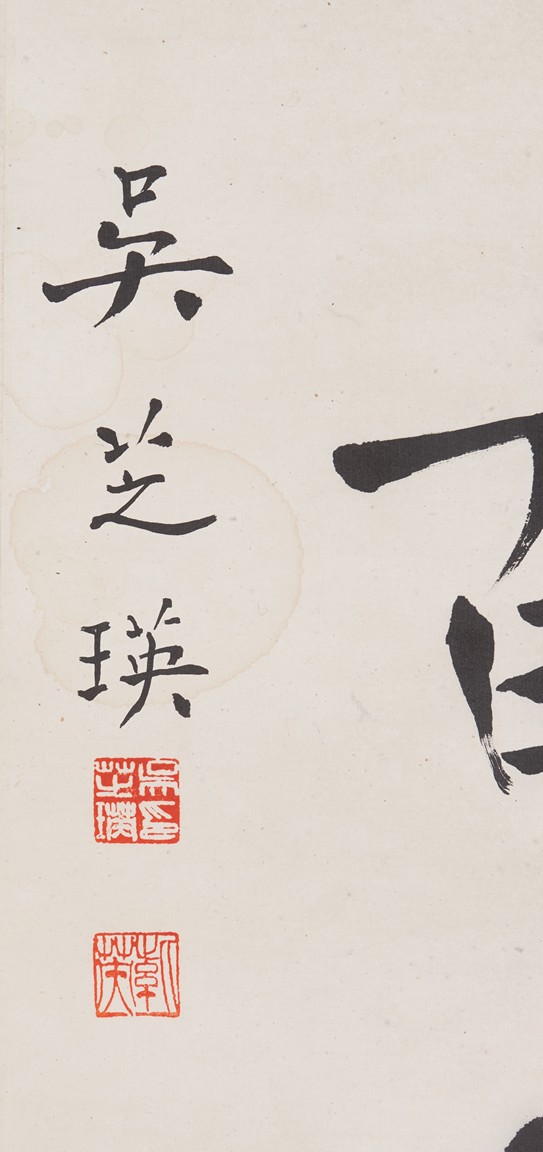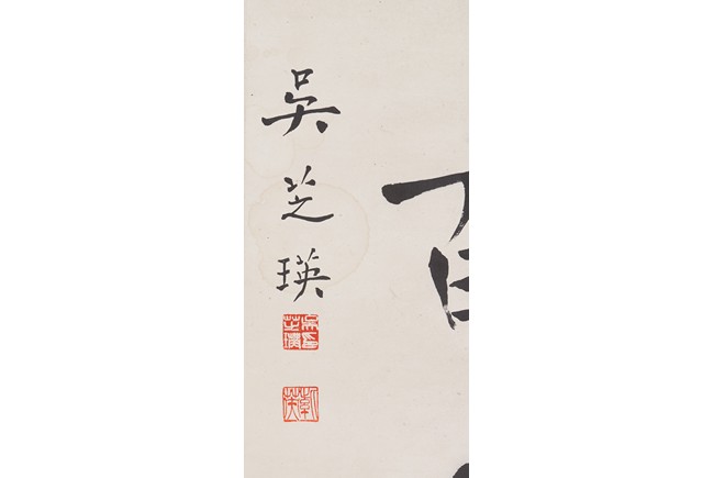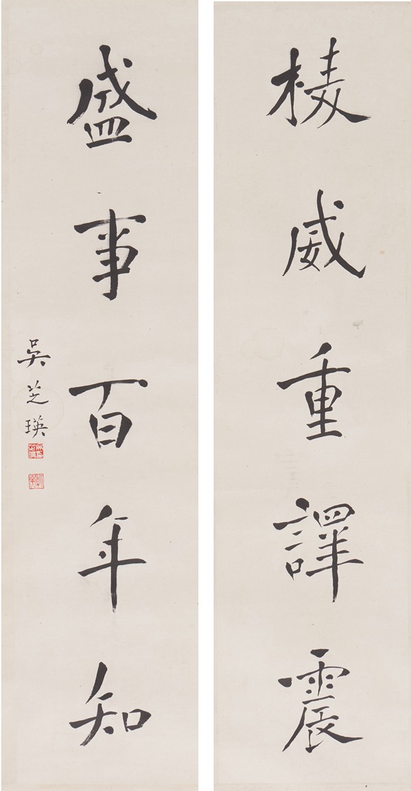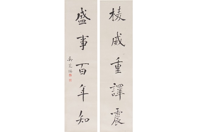 Ink on paper. Five character regular script couplet calligraphy. Hanging scroll. Signed Wu Zhiying, with two seals of the artist.