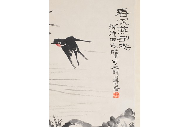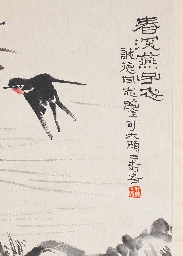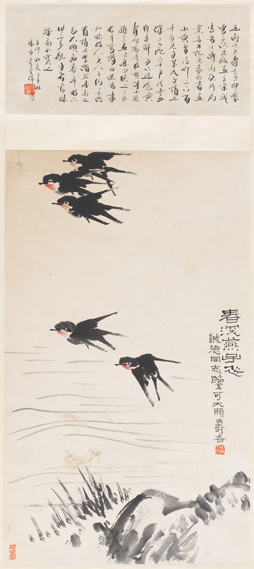 PAN TIANSHOU: COLOR AND INK ON PAPER 'SWALLOWS' PAINTING 潘天壽 春深燕子飛 設色紙本 立軸