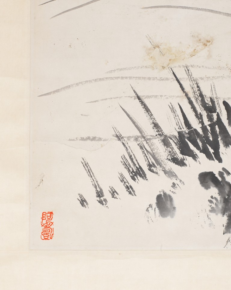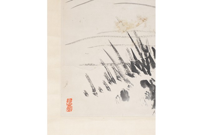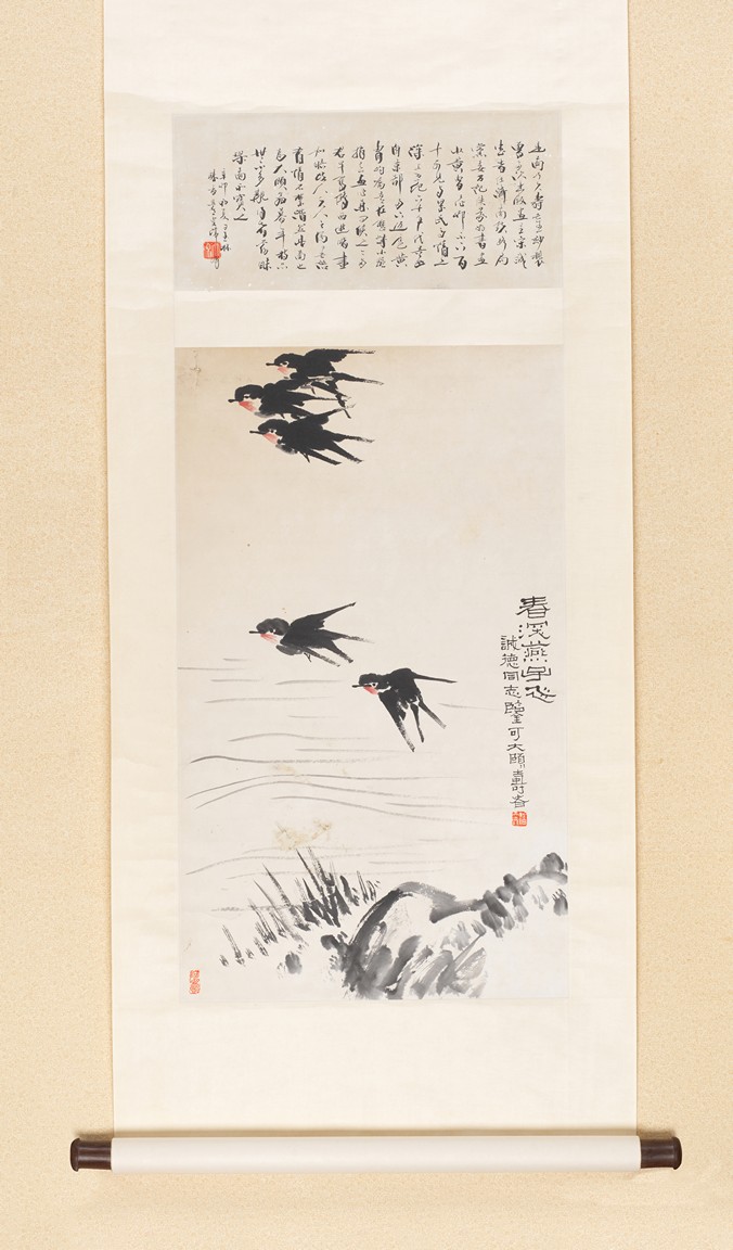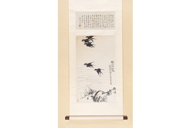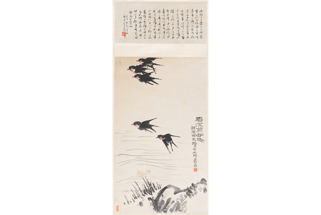 Color and ink on paper. Swallows. Hanging scroll. Inscribed and signed with two seals of the artist.
