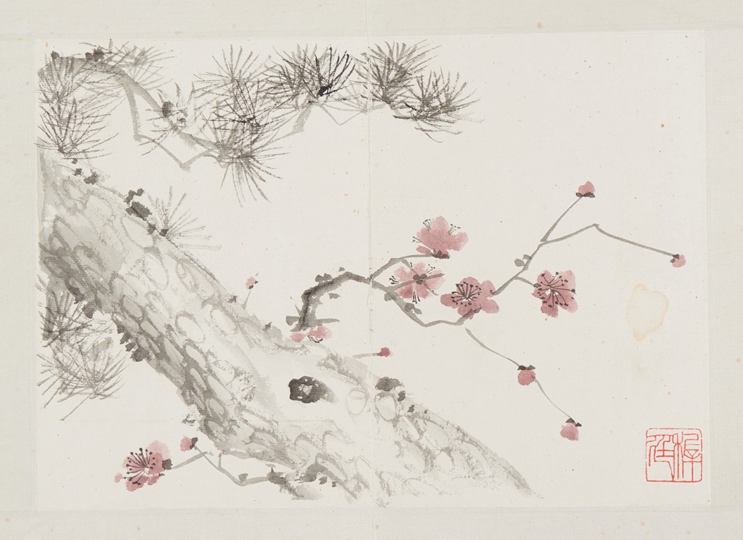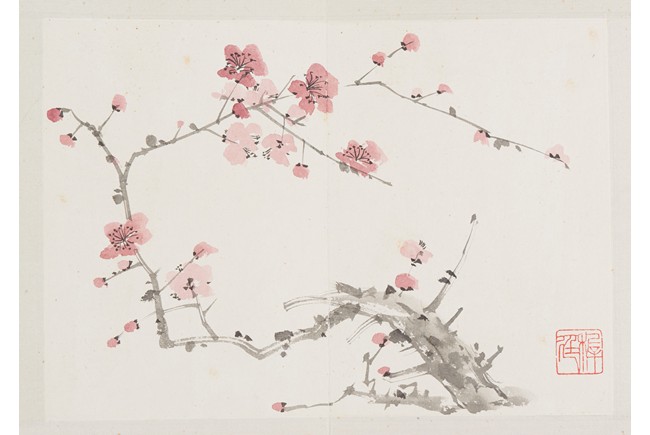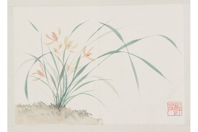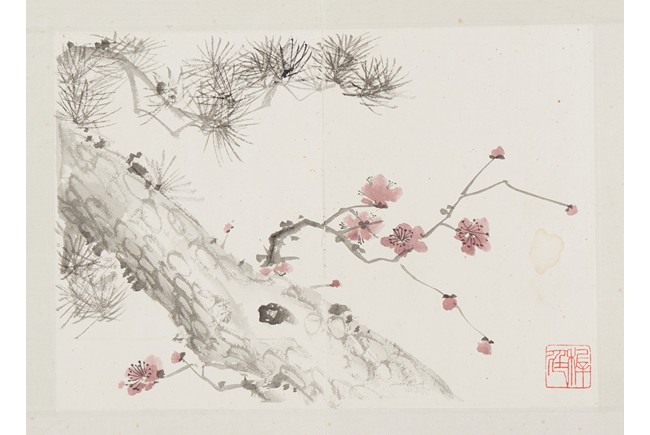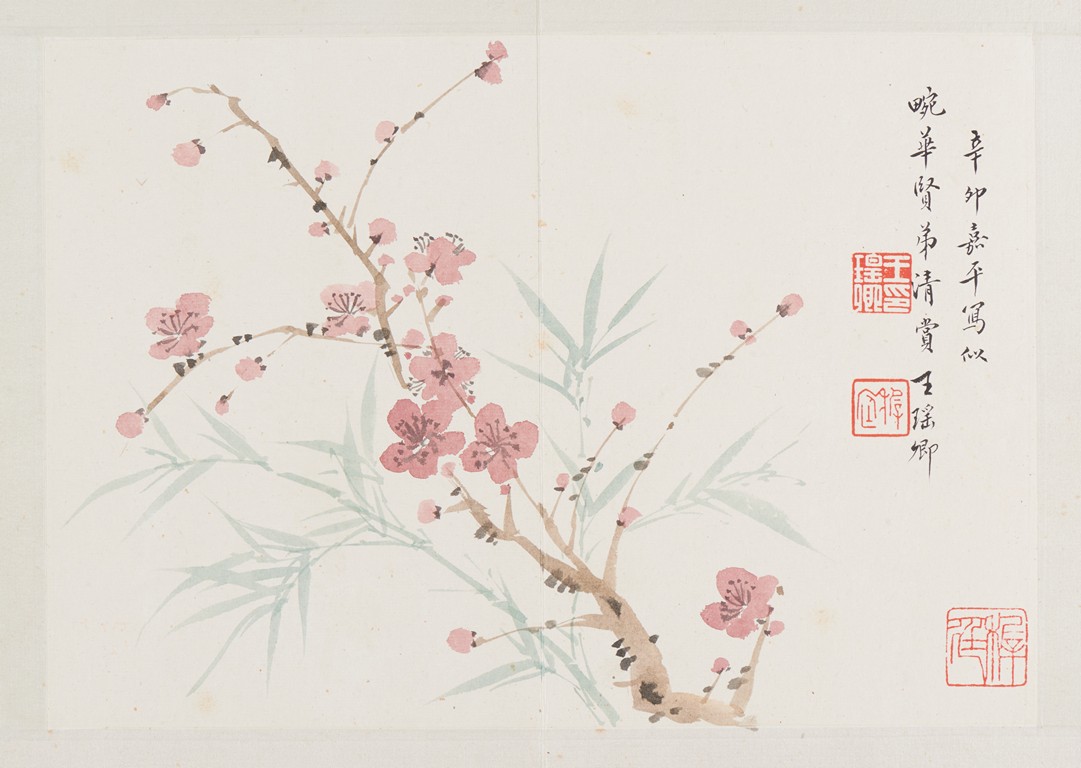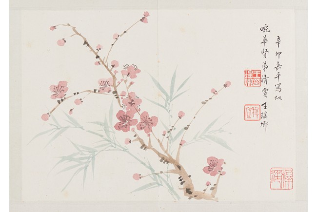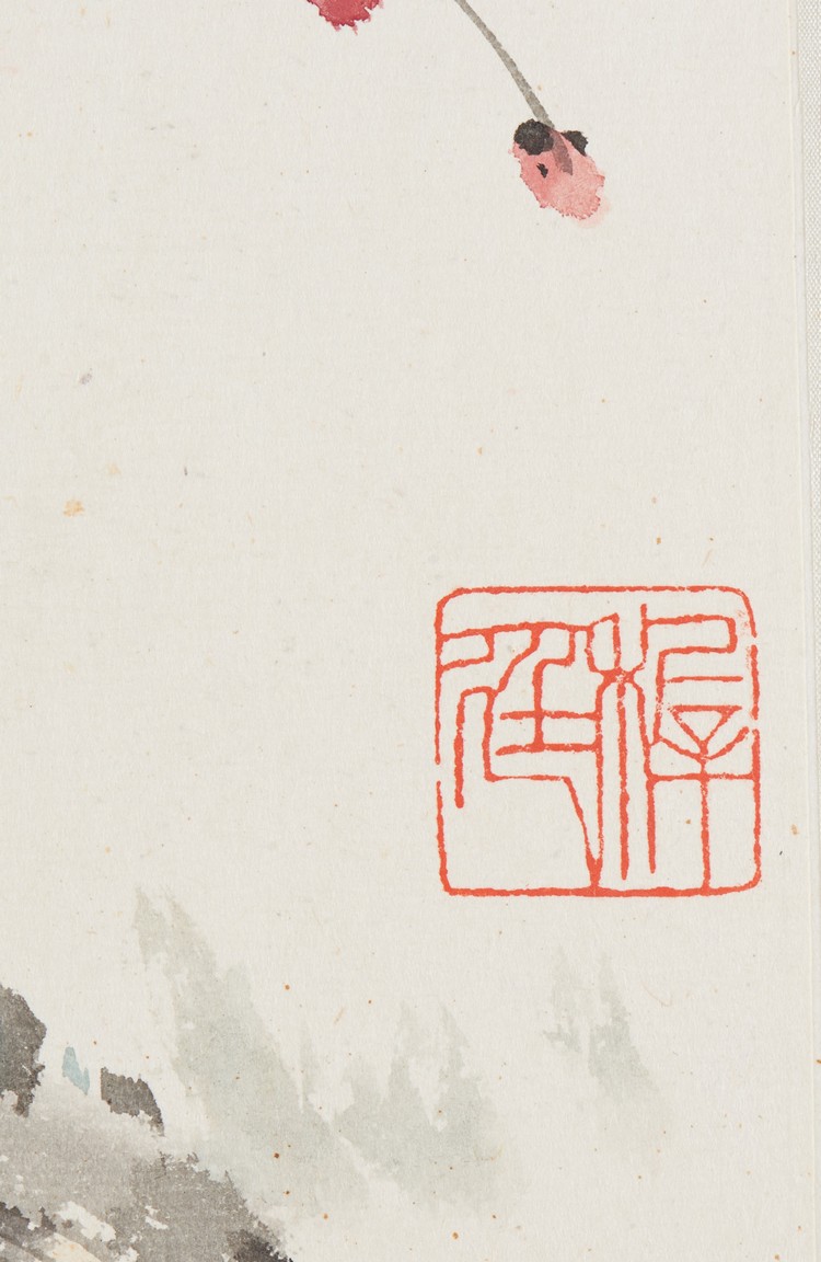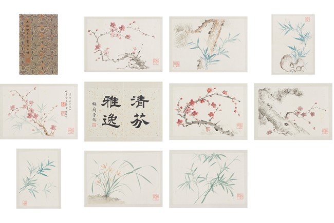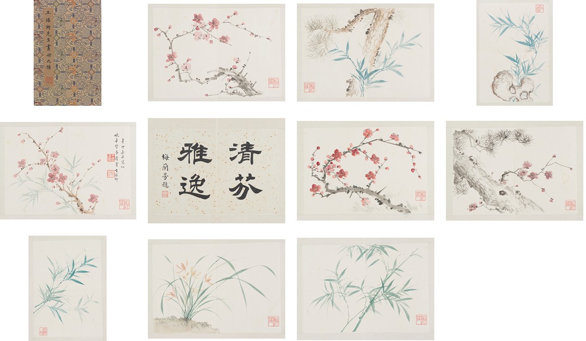 Color and ink on paper. Flowers. Ten Leave album. Frontpiece inscribed and signed Mei Lanfang with one seal of the artist. Each painting with one to two seal marks of the artist, one inscribed and signed Wang Yaoqing and with three seals of the artist.