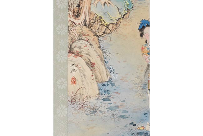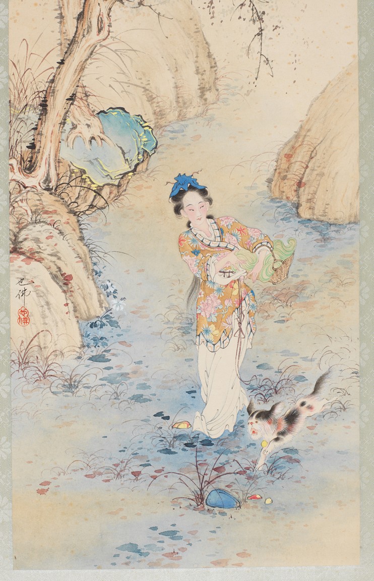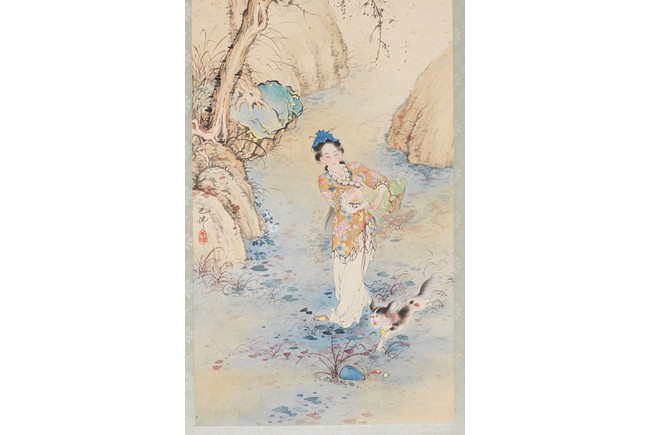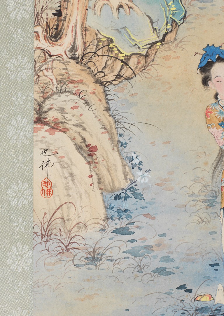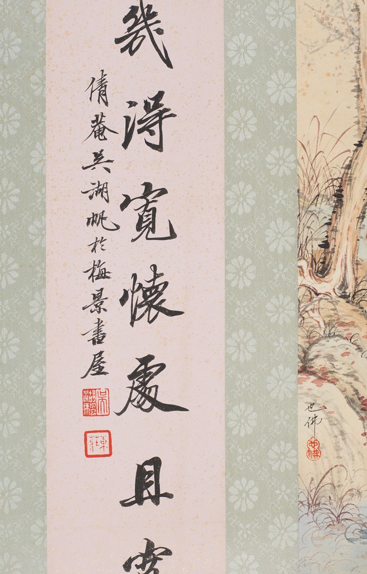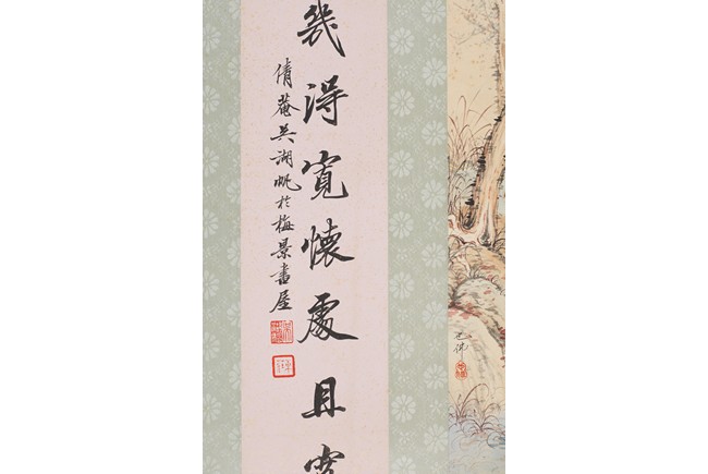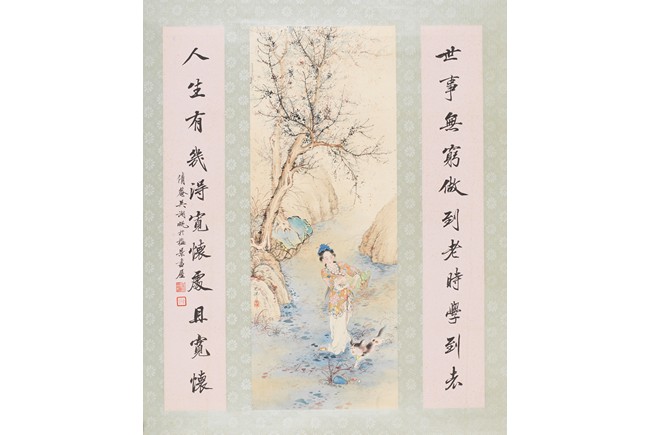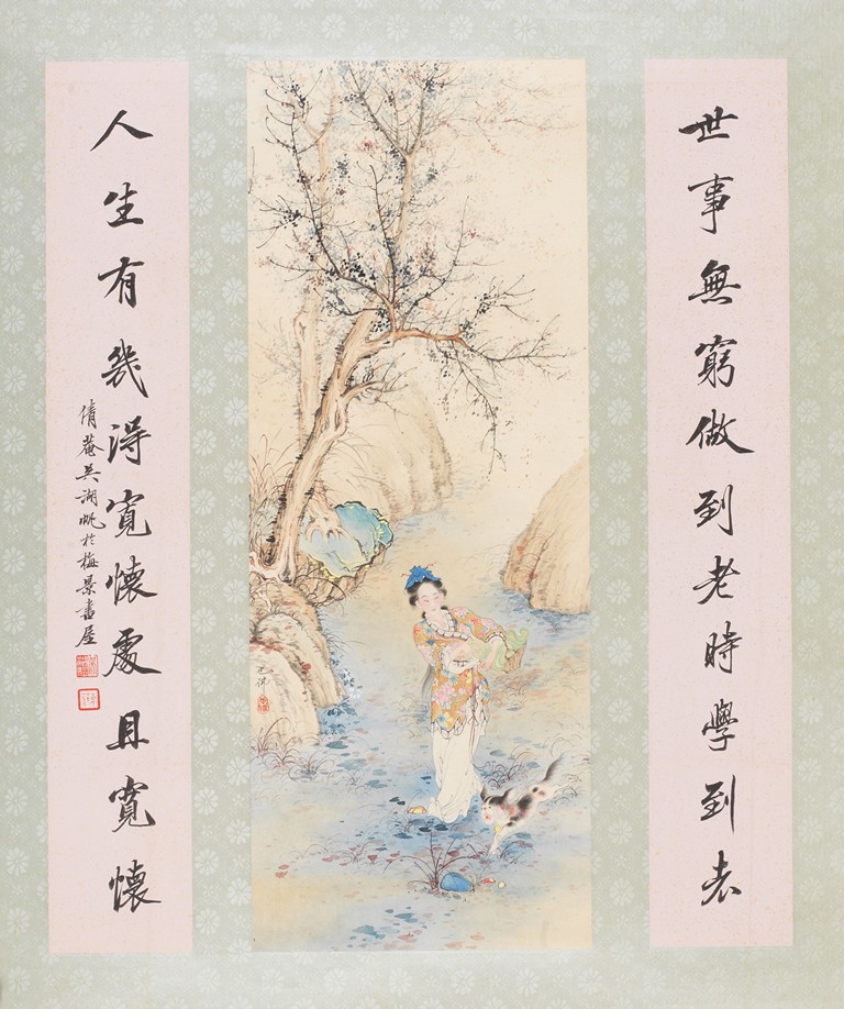 Color and ink on paper. Figure. Signed Ye Fo and with one seal of the artist. Calligraphy couplet inscribed and signed Wu Hufan with two seals of the artist.
