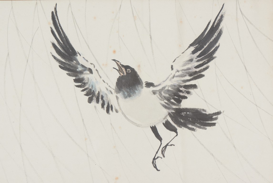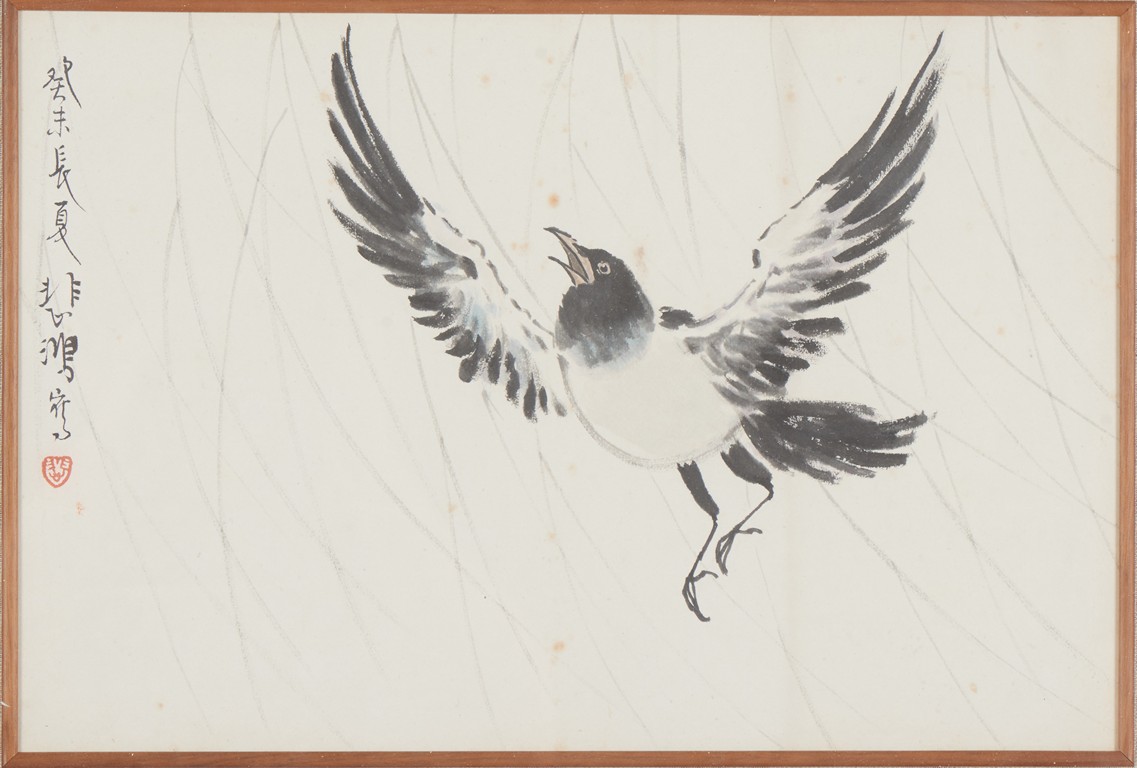 Color and ink on paper. Magpie. Framed. Inscribed and signed Beihong, with one seal of the artist, dated to summer of 1943.