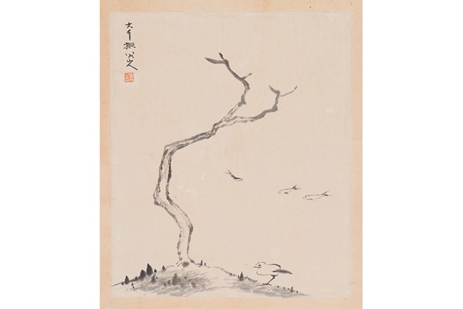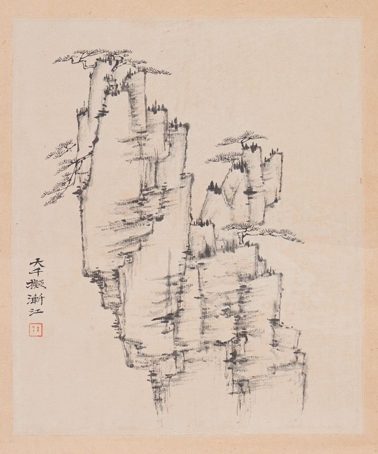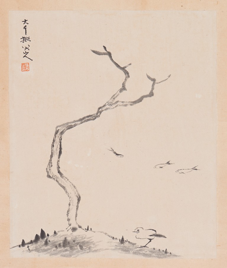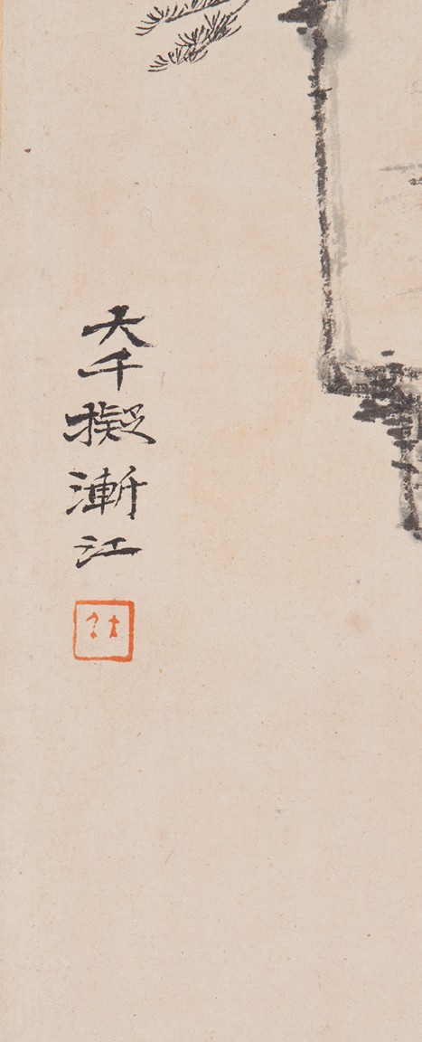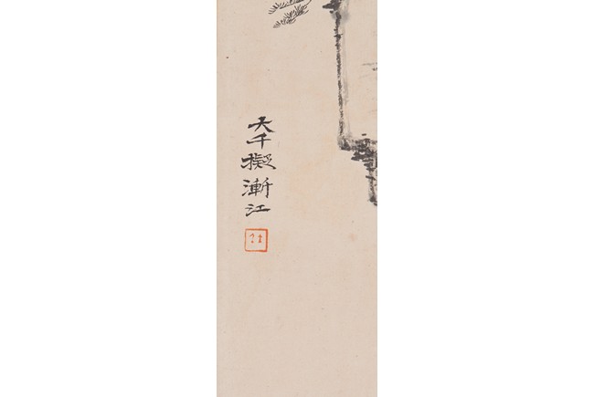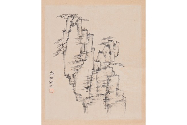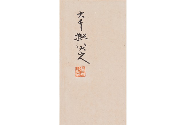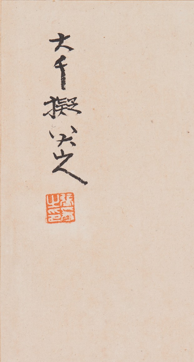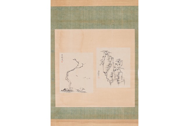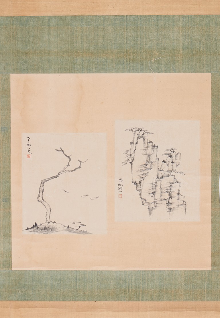 Ink on paper. Two landscapes painting in style of Bada Shanren and Jian Jiang. Mounted on same paper scroll. Hanging scroll. Signed Daqian and with one seal of the artist for each painting.