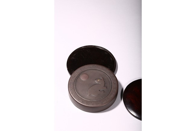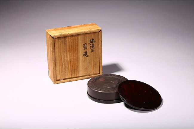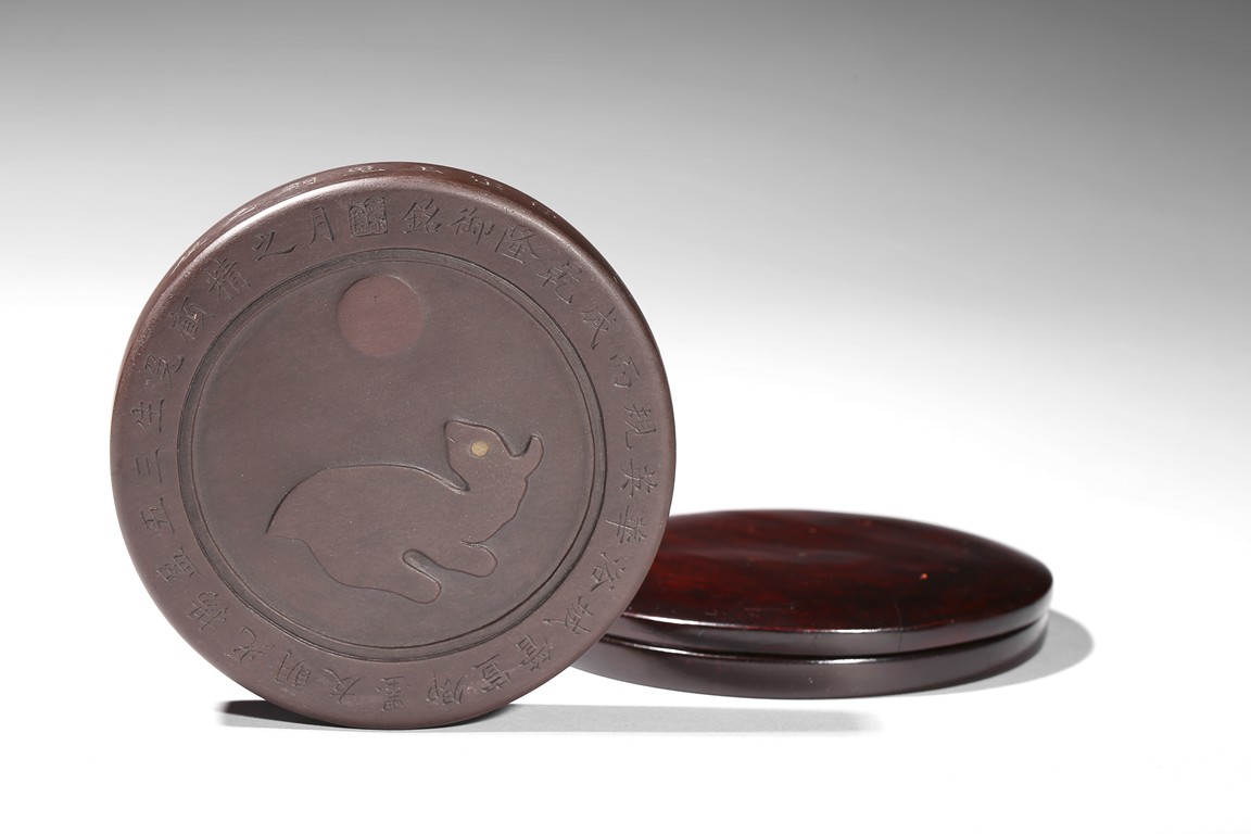 The circular inkstone carved in relief depicting a rabbit turned looking at the moon, the outer border finely incised with regular script inscription and a seal mark, the side further inscribed with inscription, accompanied with an original rosewood box and a Japanese wood box. Qing Dynasty Qianlong period.