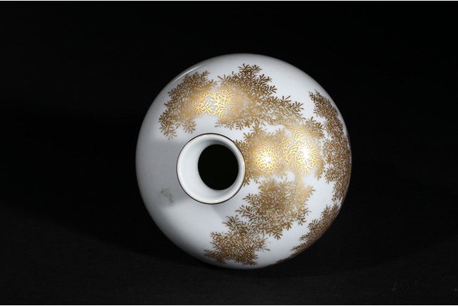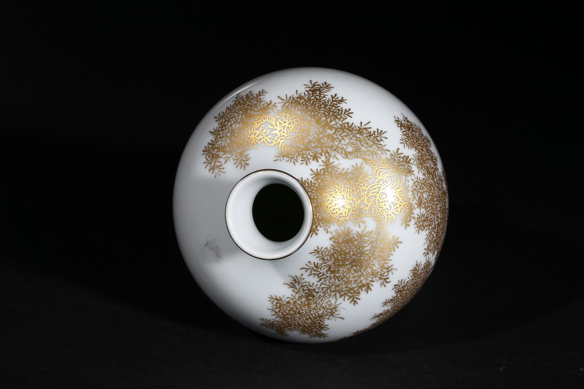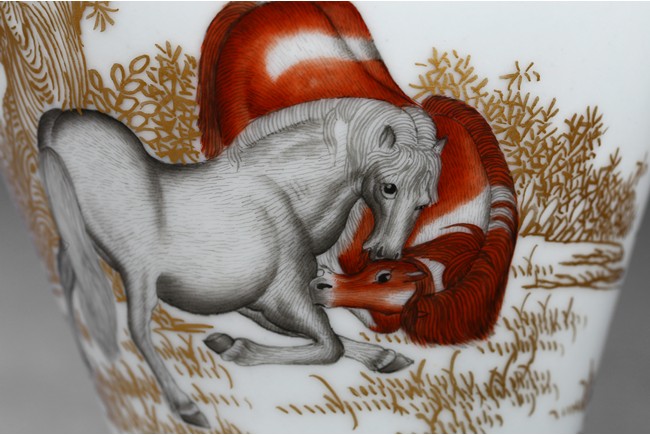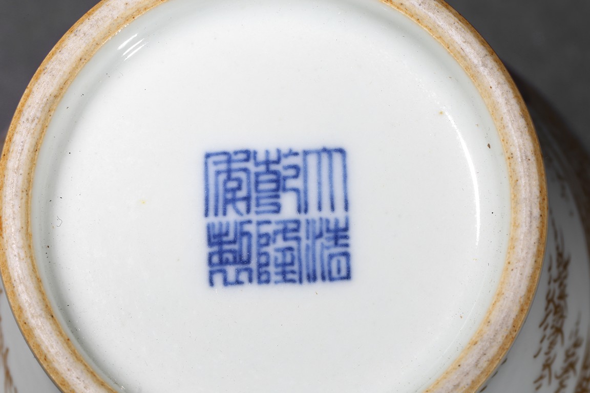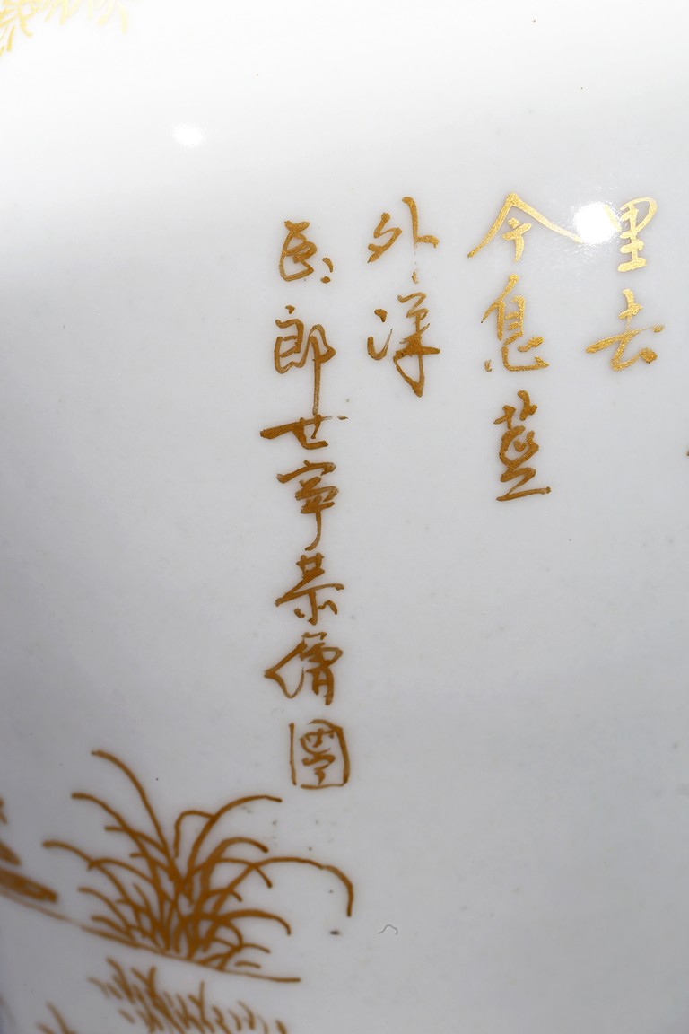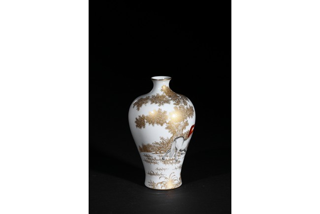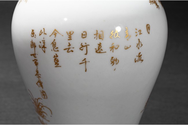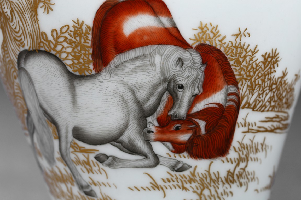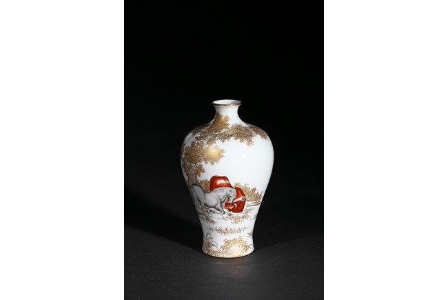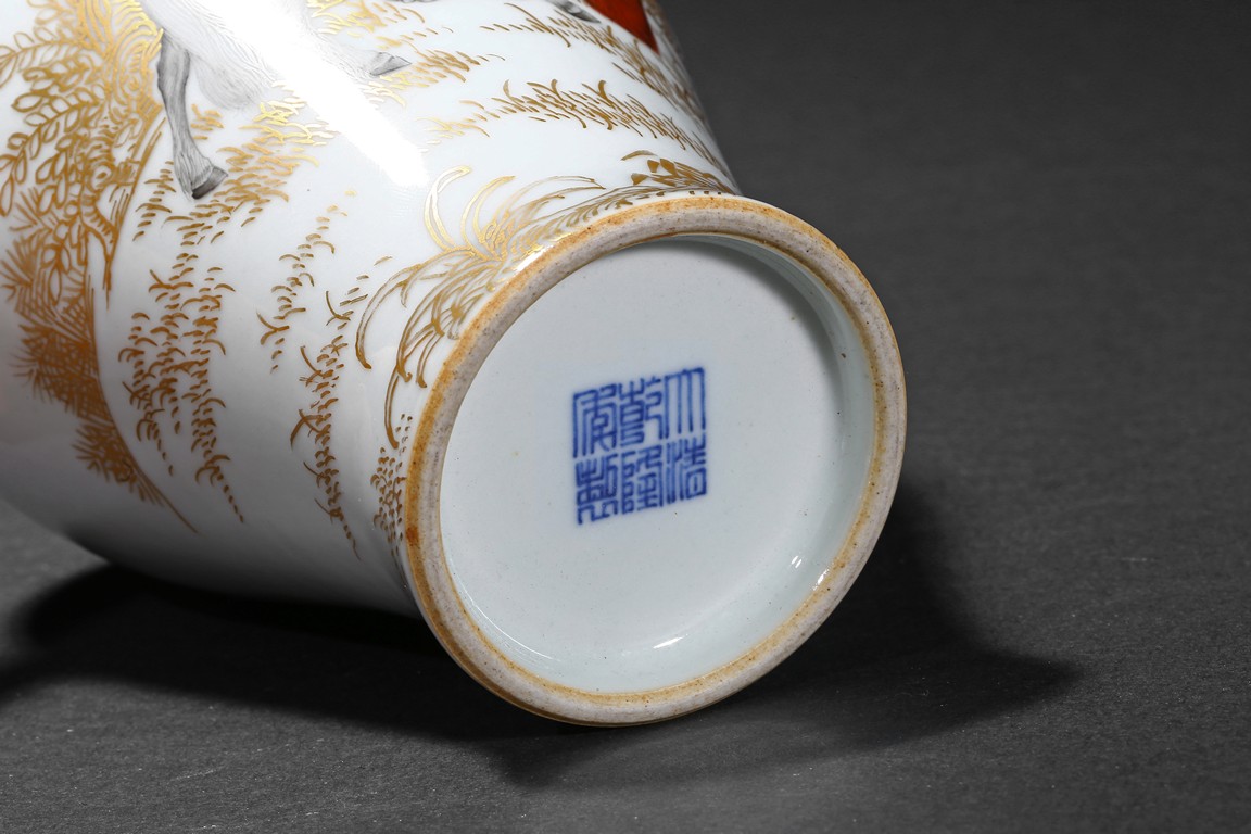 The vase is of waisted neck and everted rim, enamelled with two horses under a tree, with inscription on one side attributed to Lang Shining, supported on rosewood stand, the base with six character QIANLONG mark.Qing dynasty period.