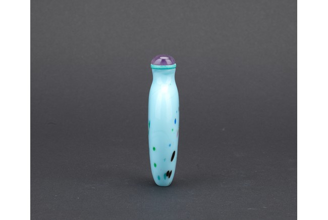 The snuff bottle is of opaque blue tone with dotted decorations.